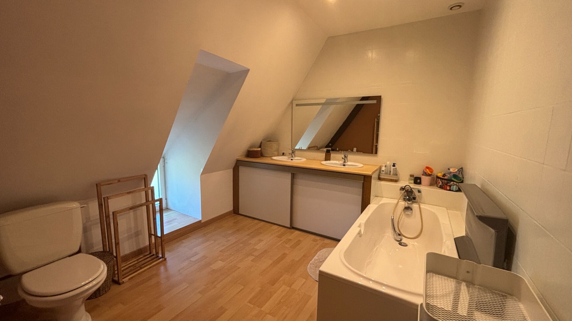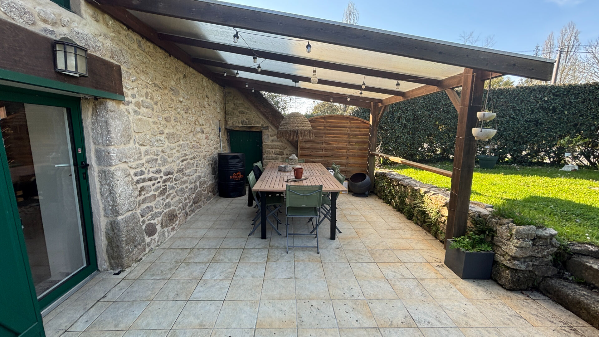 Nichée au coeur de la campagne entre Guérande et Saint-Lyphard, cette ravissante chaumière séduit par son authenticité et ses volumes chaleureux. Dès l'entrée, l'espace de vie se dévoile autour d'une salle à manger conviviale agrémentée d'une élégante cheminée traversante, laquelle réchauffe également un salon. Le rez-de-chaussée est complété par une cuisine aménagée et équipée, ainsi qu'une salle d'eau pratique incluant un coin buanderie et des toilettes indépendantes. A l'étage, le palier dessert un espace nuit composé de trois chambres, d'un bureau idéal pour le télétravail et d'une salle de bain avec WC. Côté extérieur, les prestations sont tout aussi complètes avec un jardin, un grand garage, un atelier et deux celliers offrant de nombreuses possibilités de rangement.