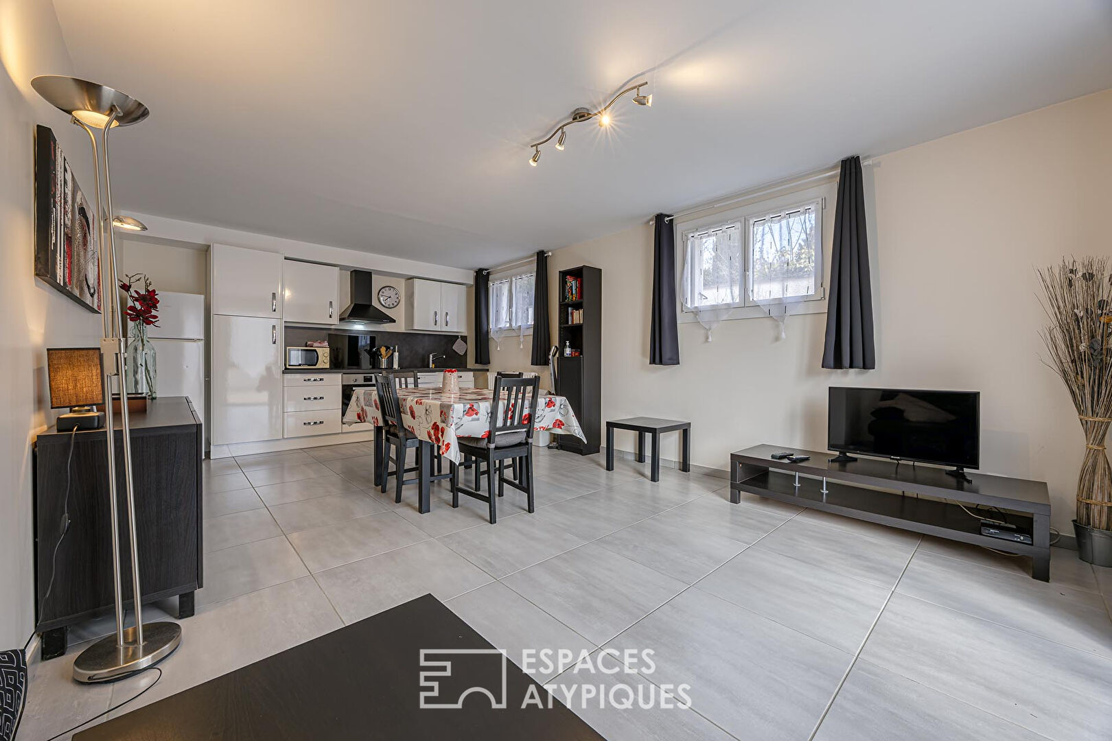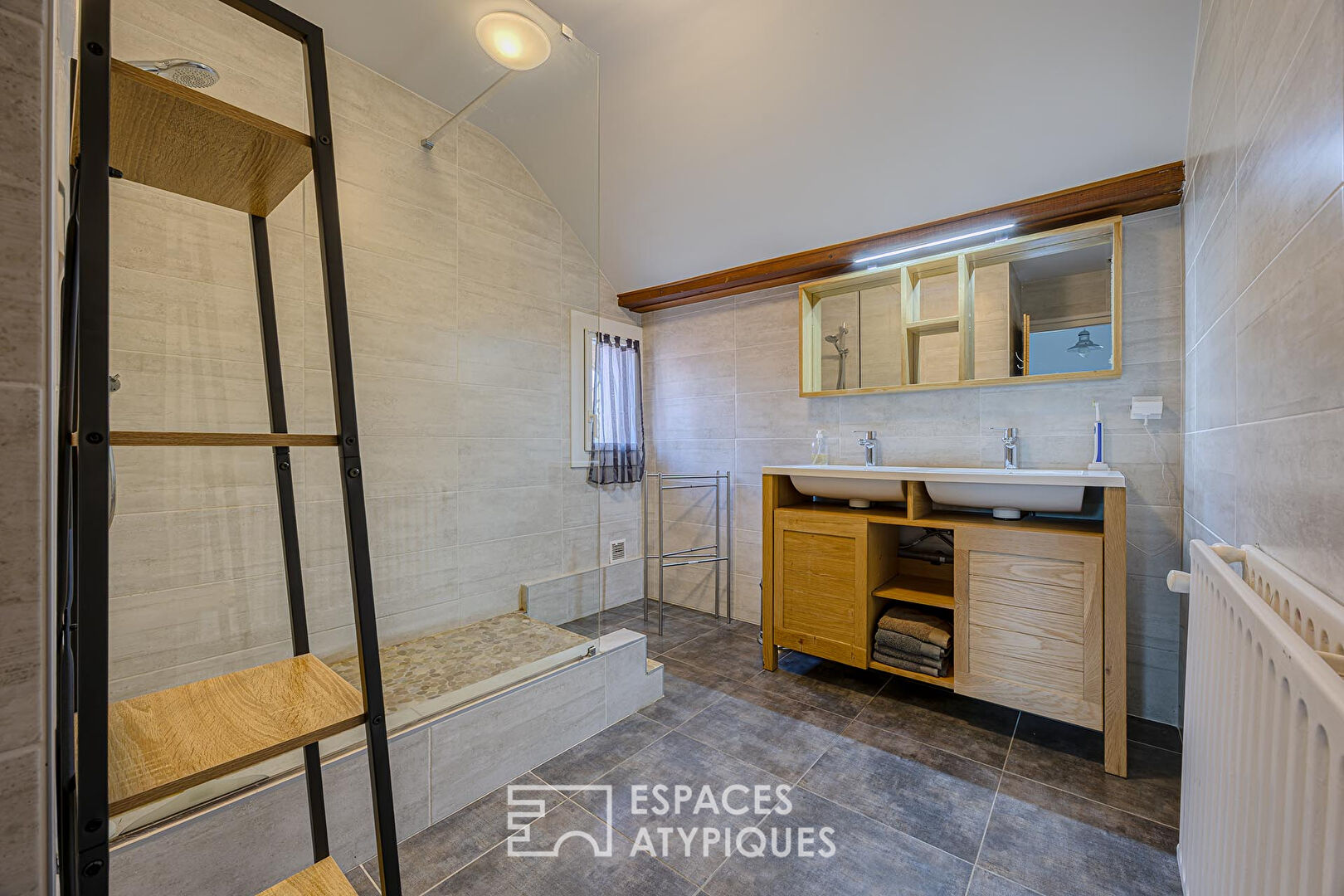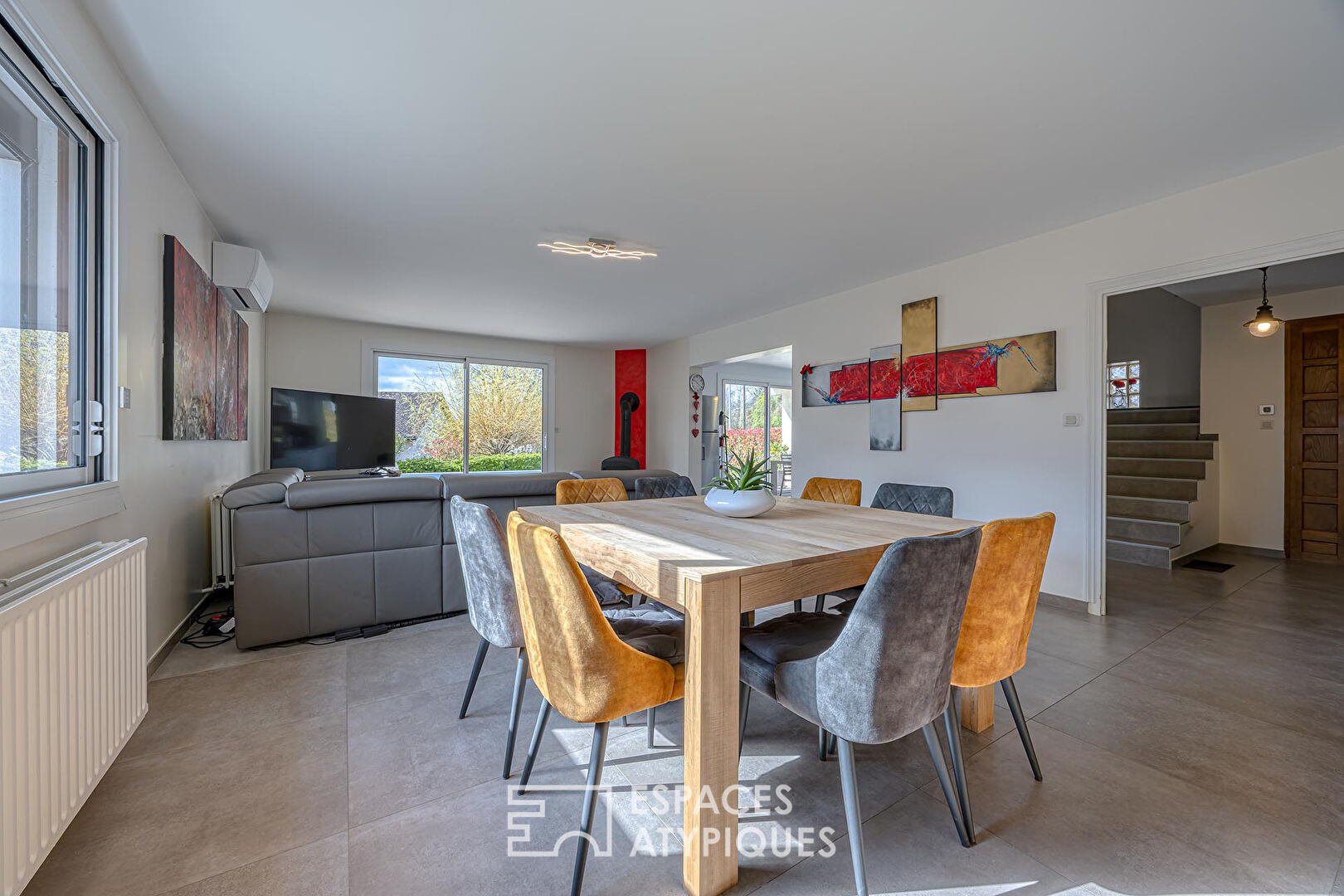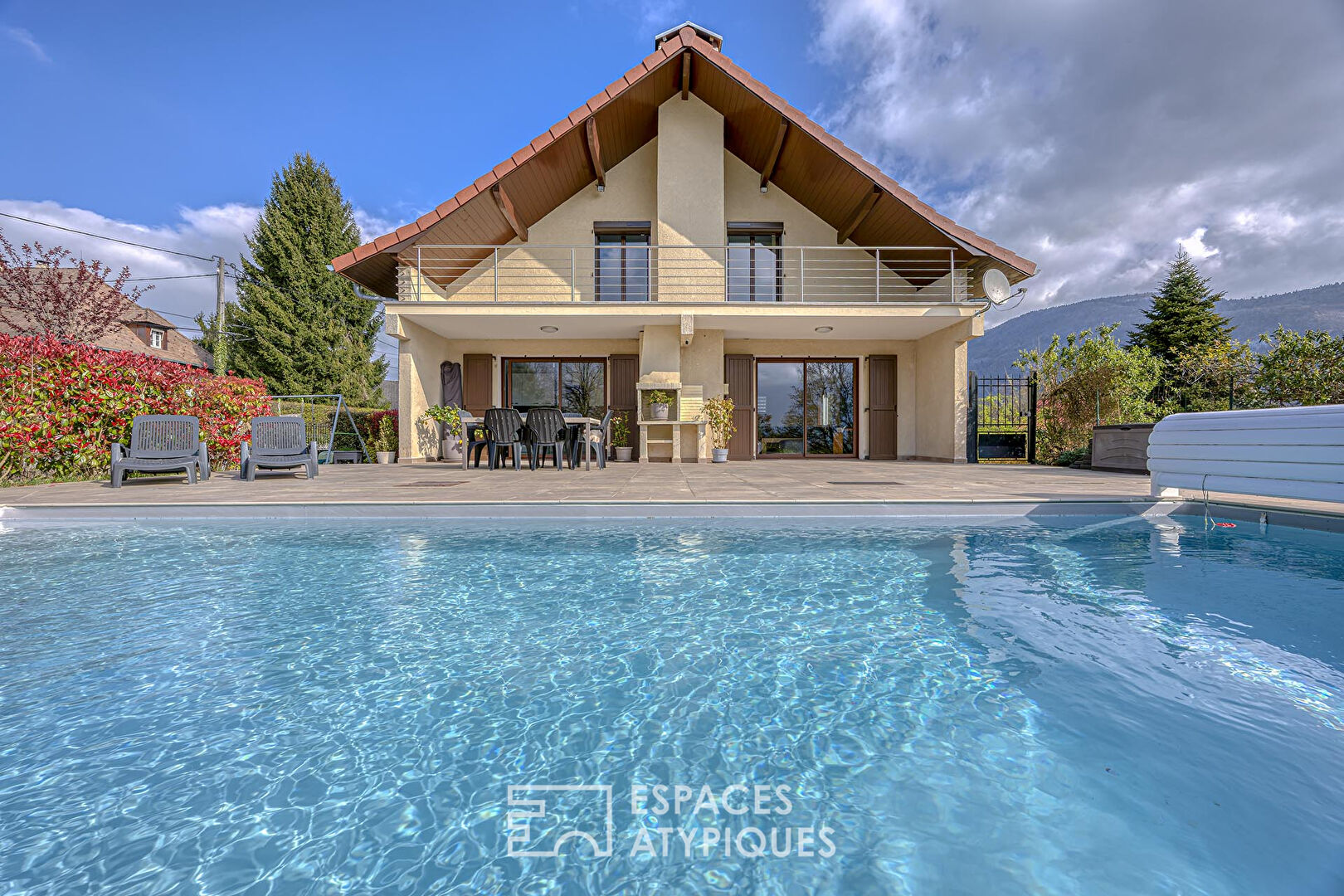 Située à seulement 1,5 km du lac d'Aiguebelette et à 10 minutes de Chambéry, cette villa d'architecte de 1978 a été intégralement métamorphosée pour offrir un confort absolu. Cette demeure « clé en main » aux lignes contemporaines se niche dans un écrin de calme sur une vaste parcelle de 1 774 m². La résidence principale de 220 m² propose des volumes baignés de lumière grâce à une exposition plein sud idéale. Le rez-de-chaussée dévoile une vaste pièce de vie traversante, rythmée par un poêle à bois Godin et une cuisine équipée haut de gamme, tout en permettant une vie de plain-pied grâce à un bureau, une chambre avec loggia et une salle d'eau. A l'étage, une mezzanine lumineuse dessert quatre chambres spacieuses avec rangements, dont deux s'ouvrent sur un balcon offrant une vue dégagée sur les montagnes et l'espace piscine. Le jardin s'articule autour d'une terrasse monumentale de 140 m² en grès cérame qui accueille une piscine Desjoyaux chauffée. L'élégance du bien est soulignée par des finitions soignées en aluminium et inox brossé. En complément, un appartement T2 indépendant de 50 m², rénové et classé 3 épis "Gîtes de France", dispose de son propre jardin et d'une piscine privée, garantissant un revenu locatif immédiat ou un espace privilégié pour les invités. La propriété dispose également d'un sous-sol complet comprenant un double garage, une buanderie et des caves. Enfin, cette rénovation technique d'excellence assure une performance énergétique optimale grâce à une isolation renforcée de la toiture, une pompe à chaleur air/eau, la climatisation réversible et des huisseries neuves. CLASSE ENERGIE : B / CLASSE CLIMAT : A Montant moyen estimé des dépenses annuelles d'énergie pour un usage standard, établi à partir des prix moyens des énergies indexés sur les années 2021, 2022, 2023 : entre 2.290 Euros et 2.490 Euros. Les informations sur les risques auxquels ce bien est exposé sont disponibles sur le site Géorisques : www.georisques.gouv.fr. Contact : Marine 06 09 77 70 59 Marine FAIRIER (EI) Agent Commercial - Numéro RSAC : 928 645 845 - Chambéry.