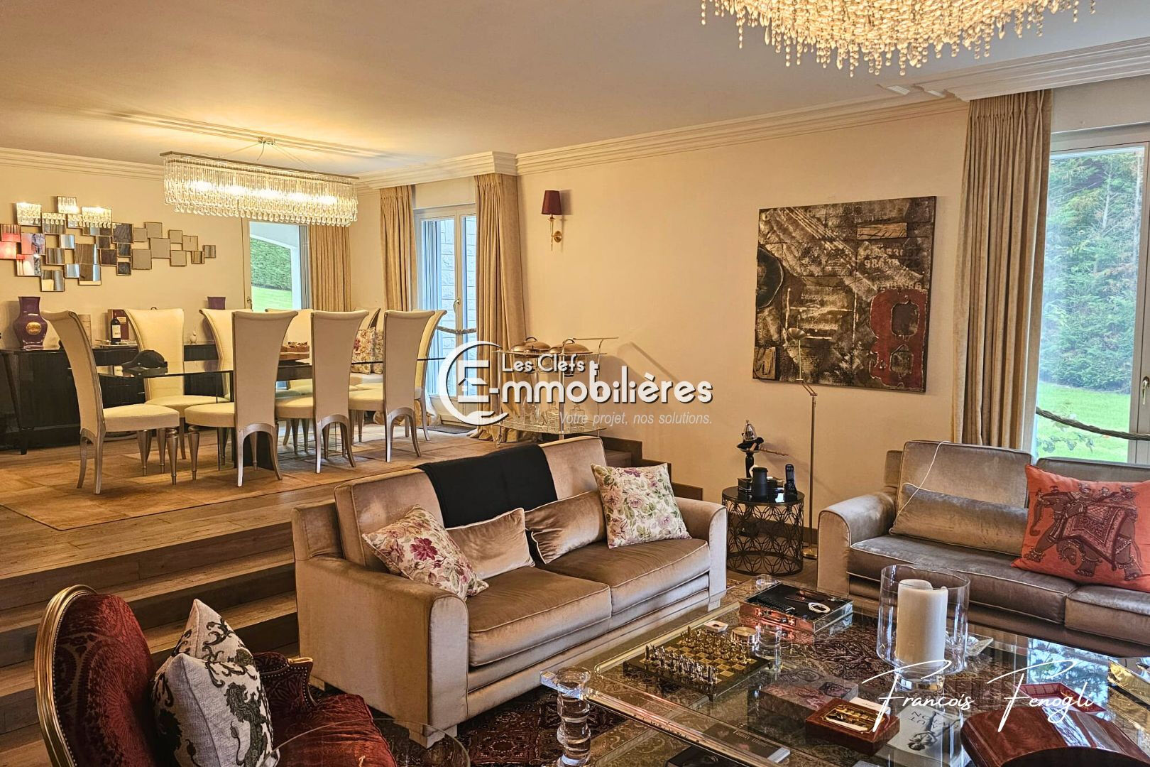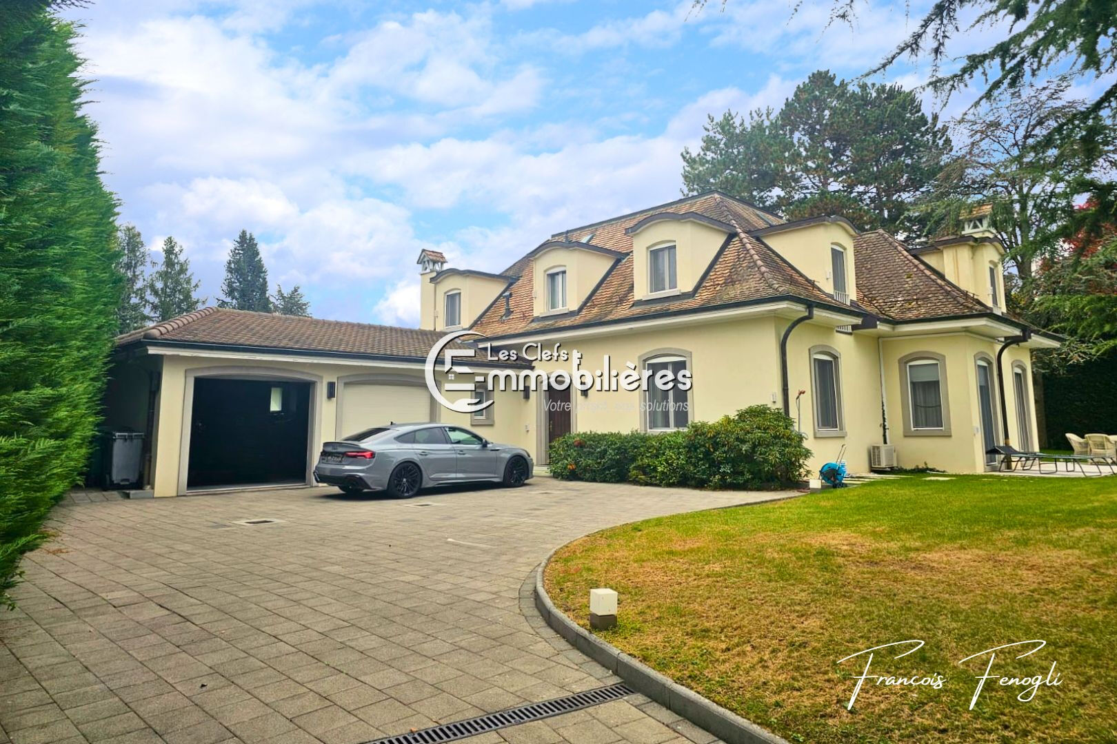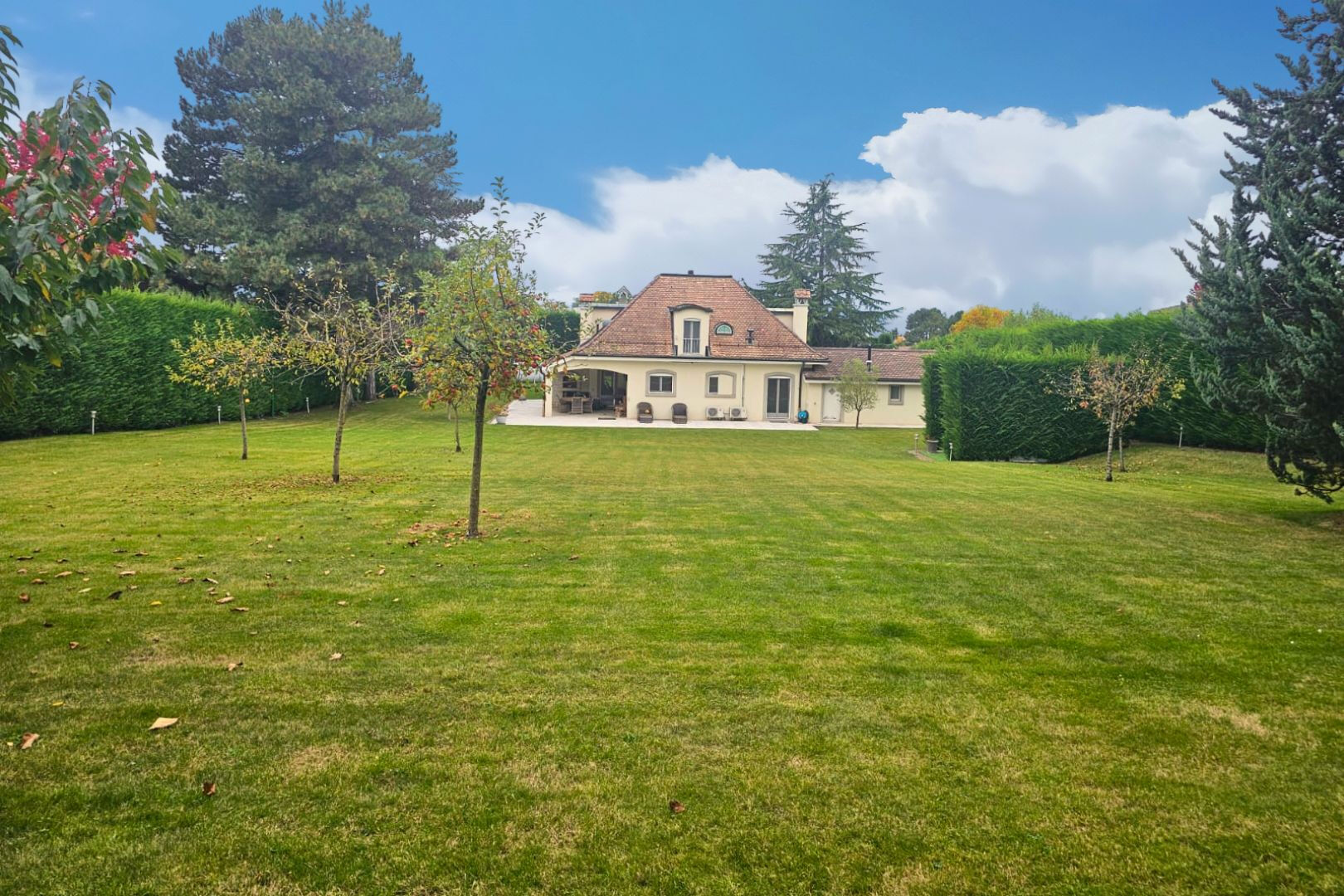 Dans l'un des environnements résidentiels les plus prisés des rives du Lac Léman, cette élégante propriété privée offre un art de vivre rare, alliant sérénité, discrétion et prestations de grand standing, à seulement quelques minutes de Genève. Édifiée au coeur d'un magnifique parc paysager d'environ 3 600 m², la propriété bénéficie d'un emplacement privilégié, entièrement préservé des regards et entouré d'une nature verdoyante qui lui confère une atmosphère paisible et exclusive. Construite en 1976 et rénovée avec soin selon des standards élevés, la villa développe près de 400 m² de surfaces utiles, offrant des volumes généreux et une élégance intemporelle. Le rez-de-chaussée accueille un hall d'entrée raffiné menant à de superbes espaces de réception baignés de lumière, comprenant un vaste double séjour, une salle à manger élégante ainsi qu'une cuisine contemporaine entièrement équipée. Une chambre avec salle de douche privative ainsi que des toilettes ainsi qu'un accès direct au garage complètent ce partie. L'étage supérieur est dédié aux espaces nuit et accueille deux chambres spacieuses, dont une remarquable suite parentale avec dressing et salle de bains, ainsi qu'une seconde chambre disposant de sa propre salle de douche. Pensé pour le bien-être et la détente, le niveau inférieur propose un vaste espace polyvalent pouvant accueillir une salle de fitness ou un espace loisirs, ainsi qu'un espace bien-être avec sauna et hammam. Les installations techniques comprennent également une buanderie, une cave à vin, une chaufferie et un abri sécurisé. A l'extérieur, la propriété dévoile de magnifiques pelouses arborées, des aménagements paysagers soignés ainsi qu'un charmant pavillon de jardin. Une vaste cour d'accès permet le stationnement de plusieurs véhicules en complément d'un garage pouvant accueillir deux à trois voitures. Alliant architecture élégante, volumes généreux et situation privilégiée à proximité immédiate du lac Léman, cette résidence représente une opportunité rare pour une clientèle recherchant discrétion, prestige et proximité avec Genève. Prix de vente : CHF 8 200 000 Located in one of the most sought-after residential settings along the shores of Lake Geneva, this elegant private property offers a rare lifestyle combining serenity, privacy and high-end amenities, just a few minutes from Geneva. Set within a magnificent landscaped park of approximately 3,600 sqm, the property enjoys a privileged location, completely sheltered from view and surrounded by lush greenery, creating a peaceful and exclusive atmosphere. Originally built in 1976 and carefully renovated to high standards, the villa offers nearly 400 sqm of usable space, featuring generous volumes and timeless elegance. The ground floor welcomes you with a refined entrance hall leading to beautiful light-filled reception areas, including a spacious double living room, an elegant dining room and a fully equipped contemporary kitchen. A bedroom with its own private shower room, guest toilets and direct access to the garage complete this level. The upper floor is dedicated to the sleeping quarters and features two spacious bedrooms, including a remarkable master suite with dressing room and private bathroom, as well as a second bedroom with its own shower room. Designed for relaxation and wellbeing, the lower level offers a large versatile space suitable for a fitness room or leisure area, as well as a wellness space with sauna and hammam. Technical facilities include a laundry room, wine cellar, boiler room and a secure shelter. Outside, the property reveals beautiful tree-lined lawns, carefully landscaped gardens and a charming garden pavilion. A large driveway courtyard provides parking for several vehicles in addition to a garage accommodating two to three cars. Combining elegant architecture, generous volumes and a privileged location in immediate proximity to Lake Geneva, this residence represents a rare opportunity for buyers seeking privacy, prestige and close proximity to Geneva. Sale price: CHF 8 200 000
