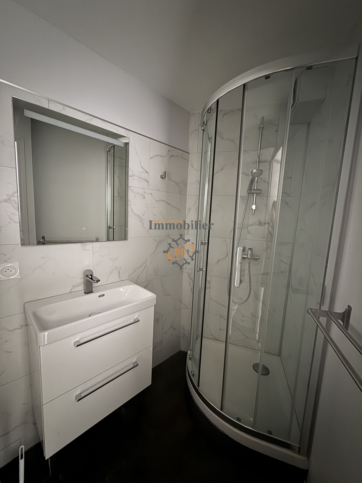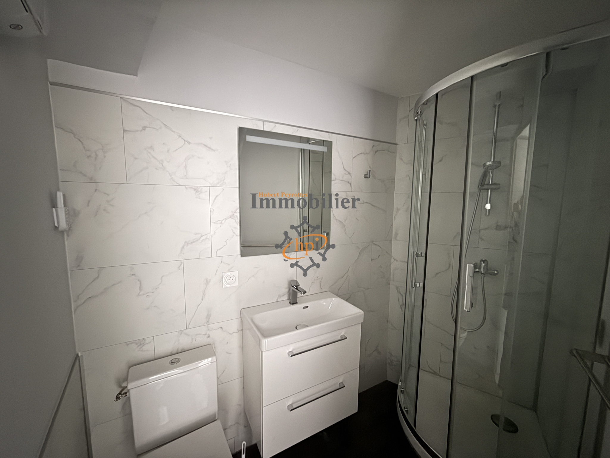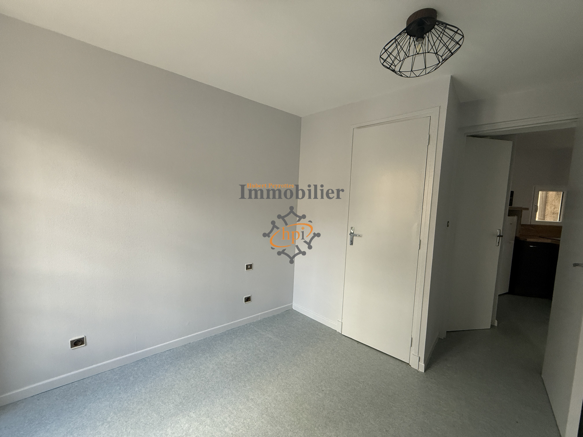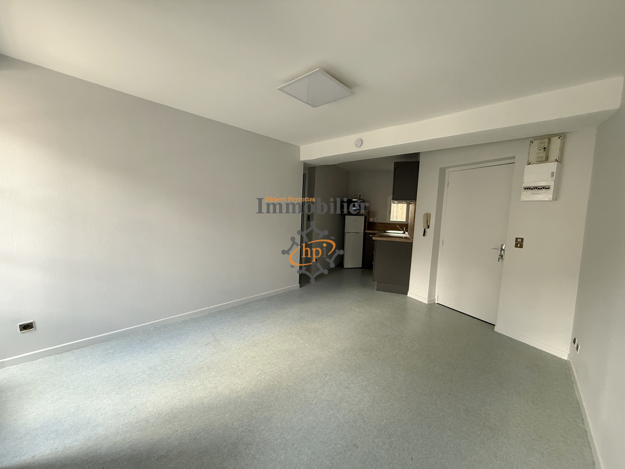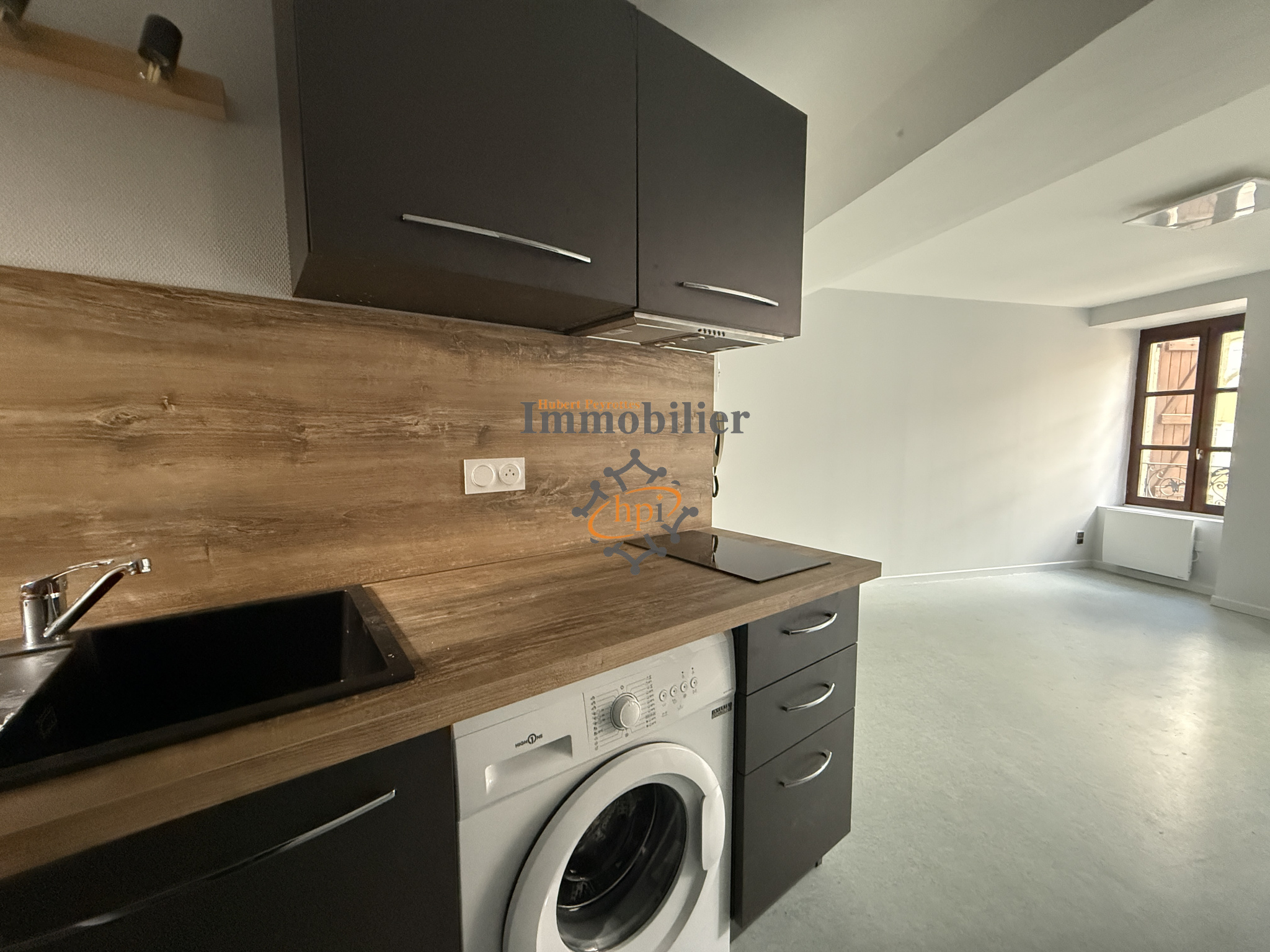A louer Saint Affrique, centre-ville, Place de la Liberté, appartement de type 2 équipé en 1er étage. 29 m2 habitables, séjour avec cuisine équipée ouverte (plaque induction deux feux, hotte, frigidaire-congélateur micro-ondes et lave-linge), chambre avec placard, salle d'eau avec w-c.