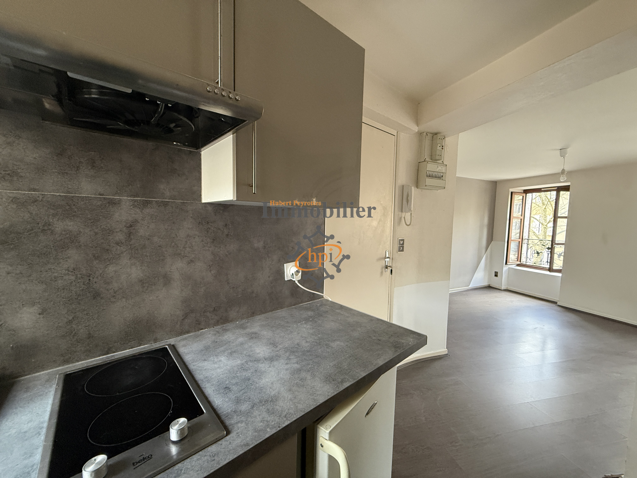 A louer Saint Affrique, centre-ville, Place de la Liberté, appartement de type 2 équipé en 2eme étage. 26 m2 habitables, séjour avec cuisine équipée ouverte (plaque électrique, hotte, frigidaire top), chambre avec placard, salle d'eau avec w-c.