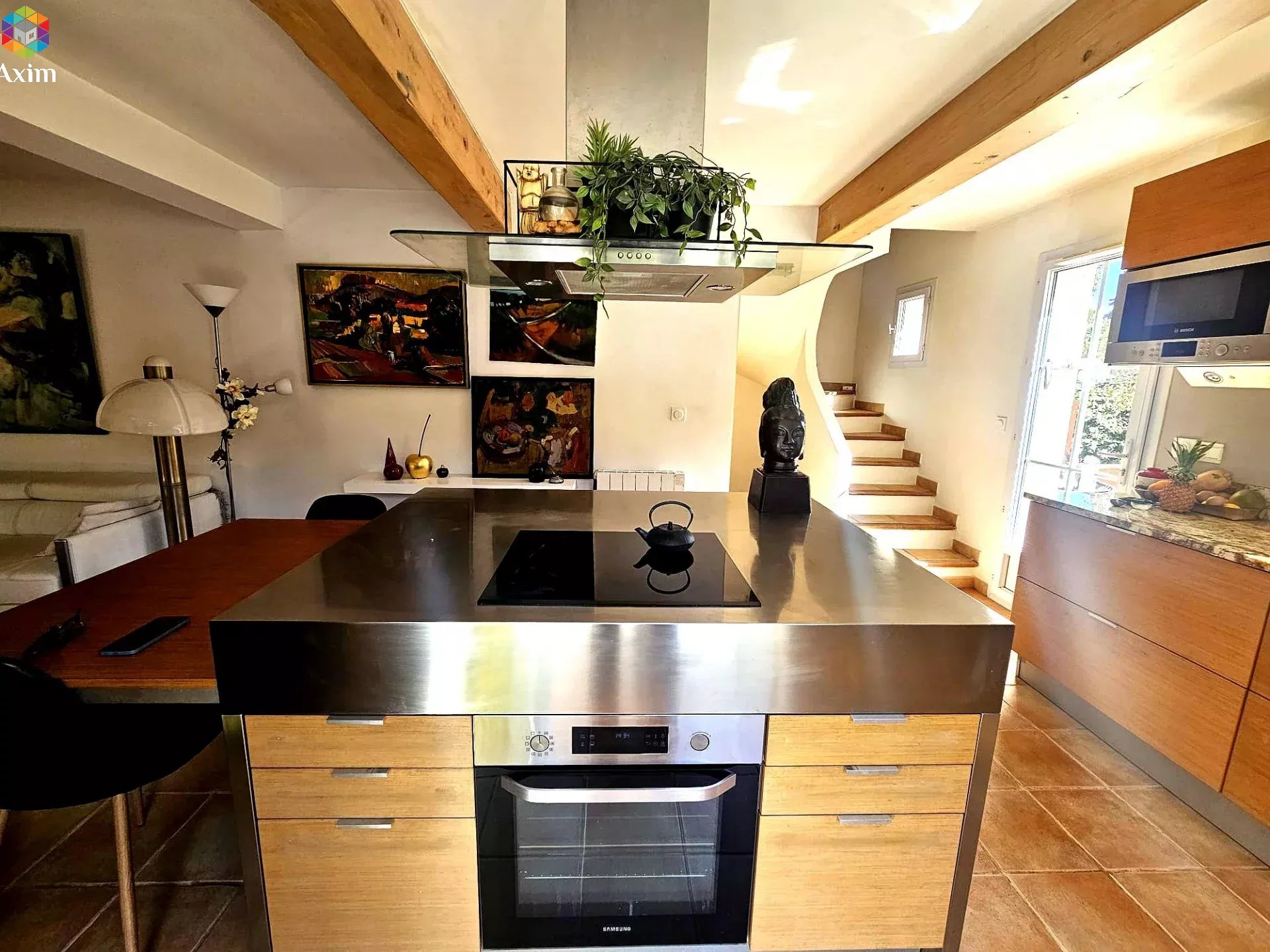 Le séjour, lumineux et convivial, s'ouvre sur une cuisine moderne avec îlot central en inox et plan de travail en marbre, apportant une véritable signature esthétique à l'ensemble.