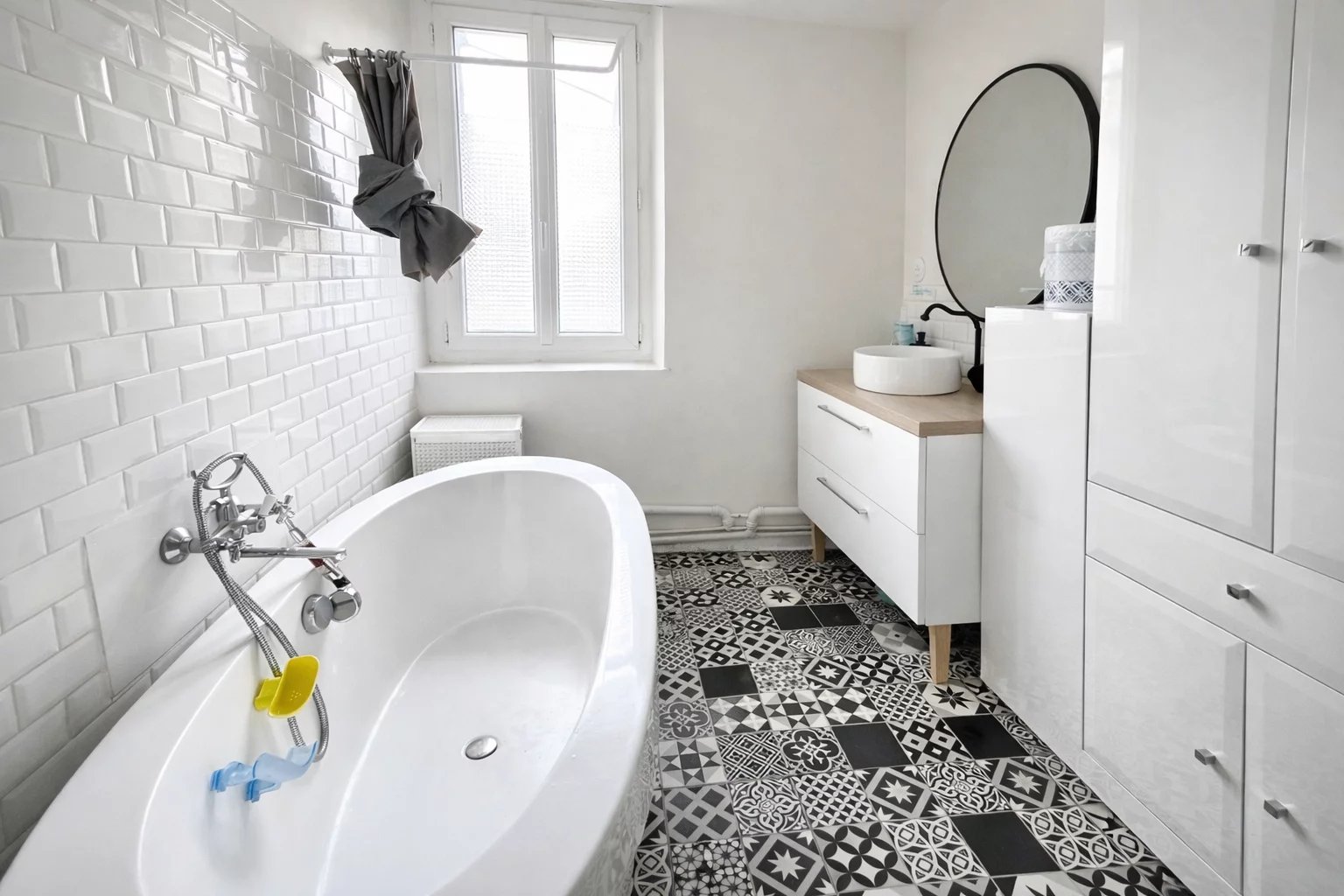 A l'étage : 2 petites chambres traversantes ou 1 chambre et un bureau + une grande Salle de bains