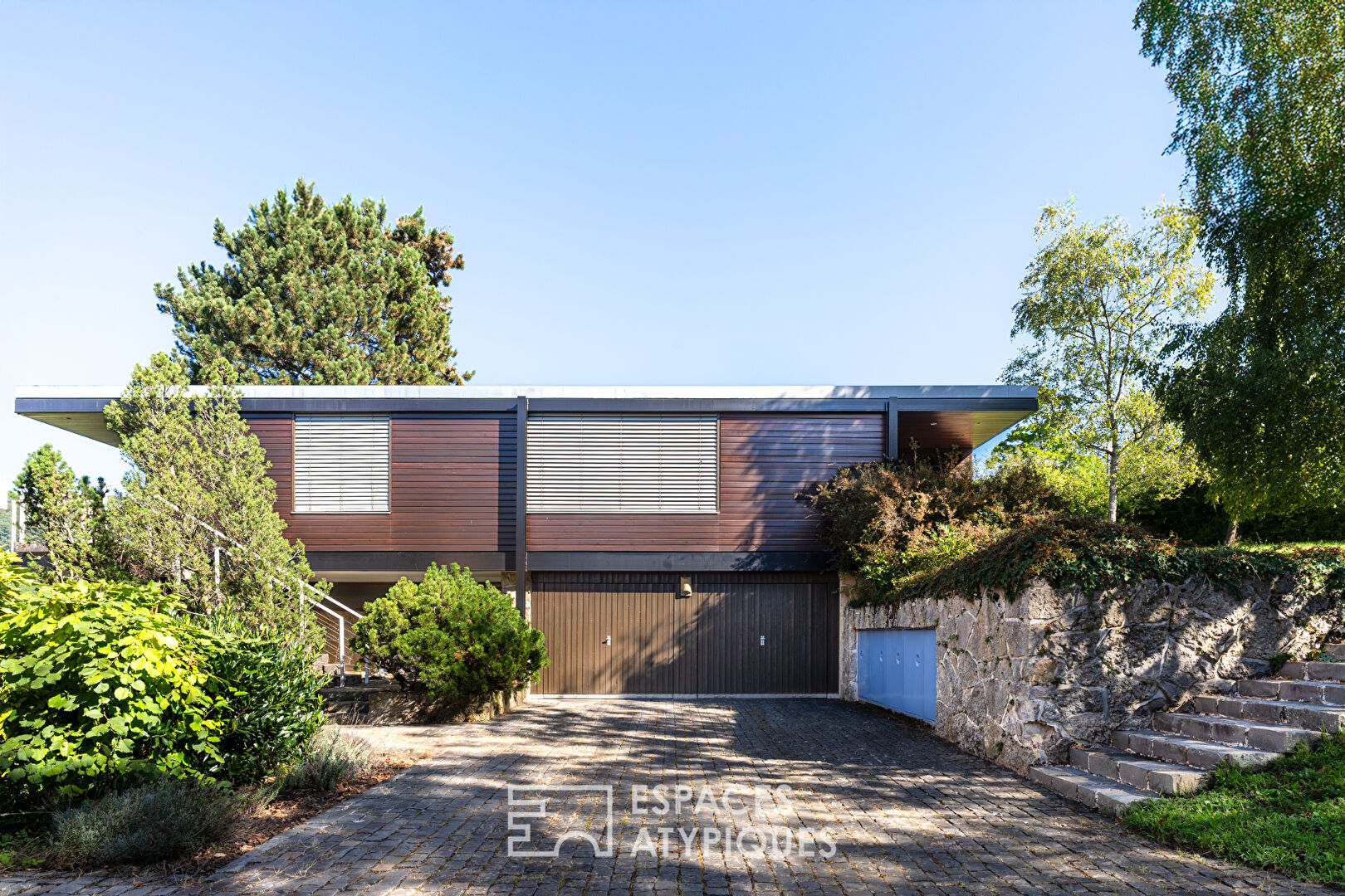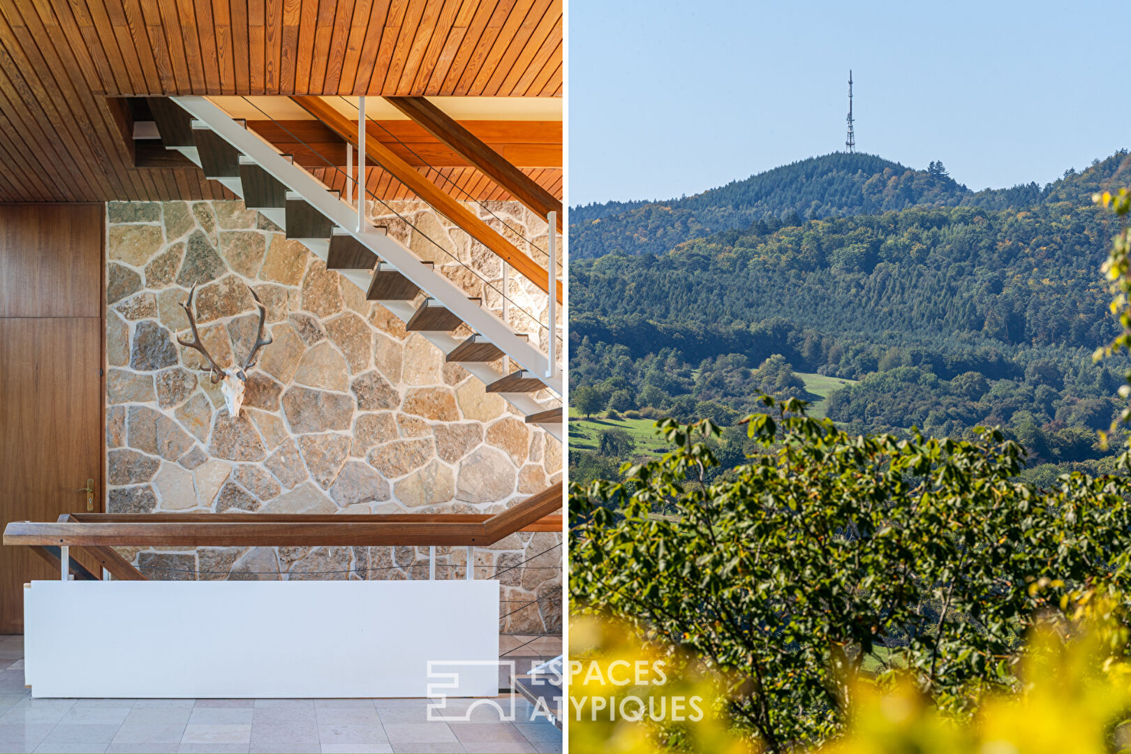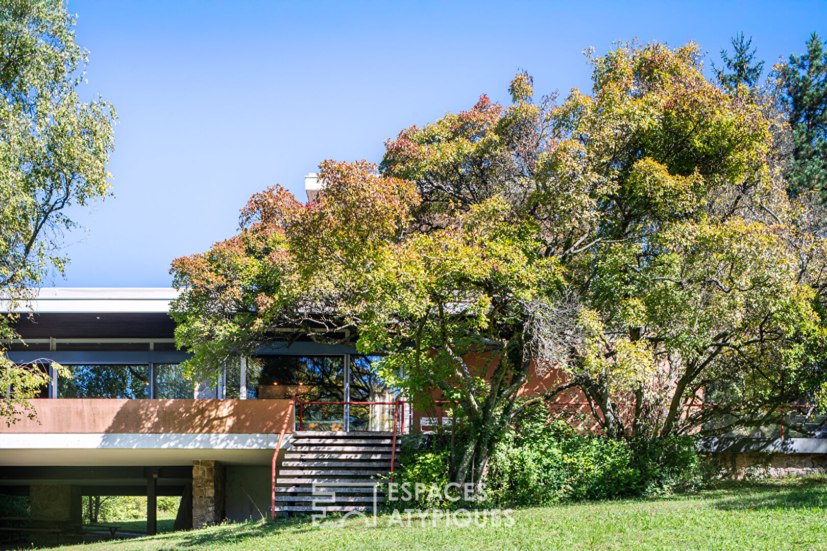 A la lisière du Parc Naturel Régional des Vosges du Nord, cette propriété d'exception prend place au coeur d'un parc paysager de 4 hectares. Conçue en 1959 par l'architecte Walter Brune, la maison principale de 306 m², véritable manifeste de l'architecture organique a été inspirée par Frank Lloyd Wright. Le domaine comprend également une seconde habitation indépendante de 130 m², une écurie privative et une piscine, offrant un art de vivre rare où la nature et le bâti dialoguent en totale symbiose. La maison principale efface les frontières intérieures pour privilégier la lumière et les volumes. Le vaste espace de réception de plus de 70 m², réchauffé par une cheminée en pierre brute et un plafond en bois chaleureux, s'ouvre sur le jardin par d'immenses baies vitrées. Dans son prolongement, la salle à manger et la cuisine équipée invitent à une convivialité contemplative. Ce niveau accueille également une première suite parentale complète. L'étage, dédié à l'intimité, distribue trois chambres spacieuses, deux salles de bain et un bureau baigné de lumière s'ouvrant sur une vaste terrasse avec une vue panoramique sur la canopée et les hauteurs environnantes. Le parc paysager, véritable écrin de verdure, accueille également une seconde bâtisse qui abrite deux logements indépendants, parfaits pour une activité de chambres d'hôtes, un atelier d'artiste ou un projet intergénérationnel. Les passionnés de nature et d'équitation apprécieront cet espace privatif permettant d'accueillir des chevaux au coeur du domaine, ainsi qu'une dépendance agricole dédiée au stockage. Idéalement située à seulement 3 minutes en voiture du centre historique de Wissembourg, de sa gare et de ses commerces, la propriété dispose également de quatre garages fermés et de grandes caves. Ce lieu singulier, où chaque ligne de pierre et de bois souligne l'horizon, offre un équilibre parfait entre l'isolement propice à l'introspection et la proximité immédiate des commodités urbaines. Cette signature architecturale rare constitue une opportunité unique pour les amateurs de patrimoine contemporain et de grands espaces. Une visite s'impose pour ressentir toute l'énergie et le potentiel de ce lieu hors du commun. CLASSE ENERGIE : E / CLASSE CLIMAT : D Montant moyen estimé des dépenses annuelles d'énergie pour un usage standard, établi à partir des prix de l'énergie de l'année 2021/2022/2023 : entre 8520 euros et 11630 euros Contact : Cédric 06.78.54.01.95 Cédric RICCIO (EI) Agent Commercial - Numéro RSAC : 908744840 - Strasbourg.