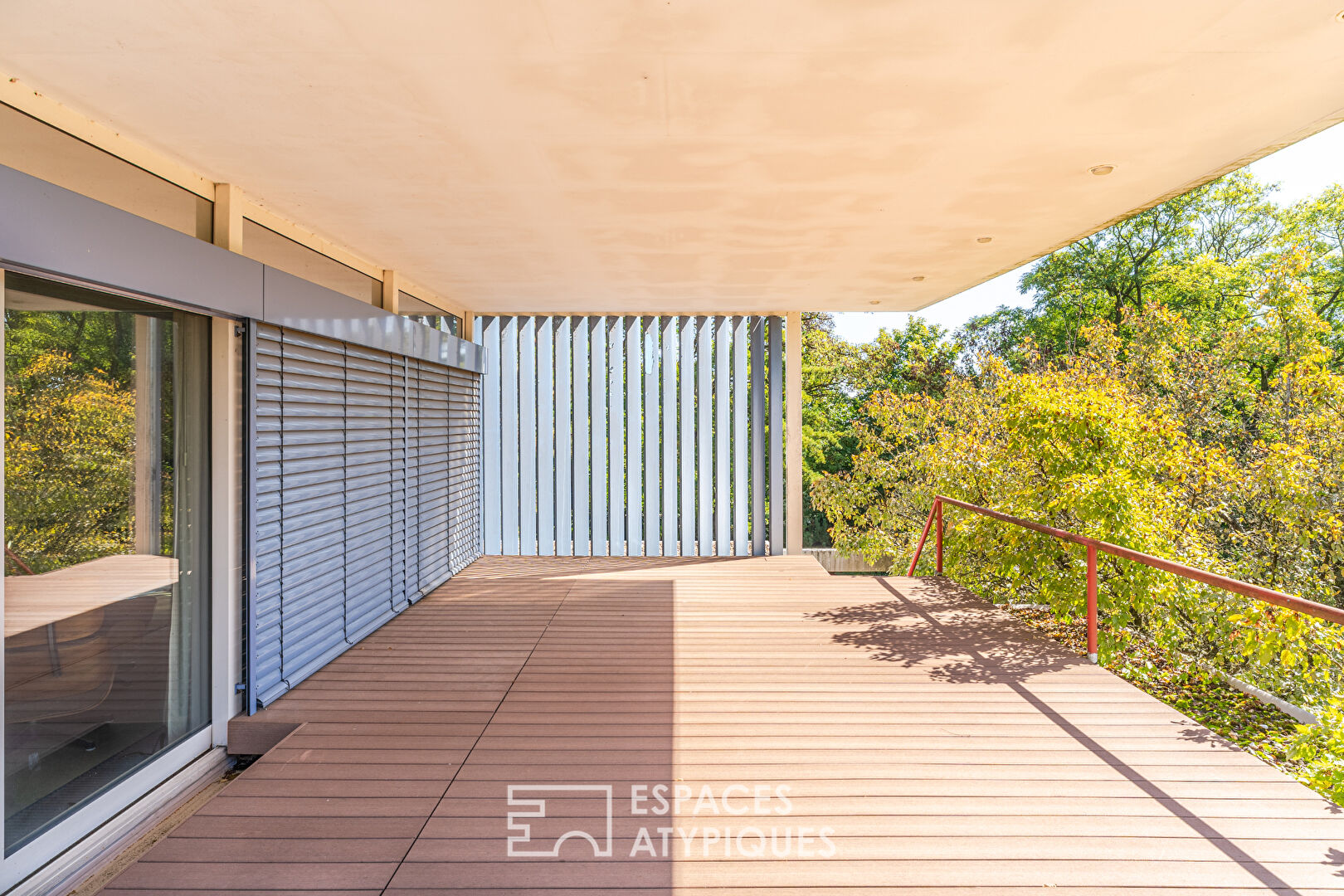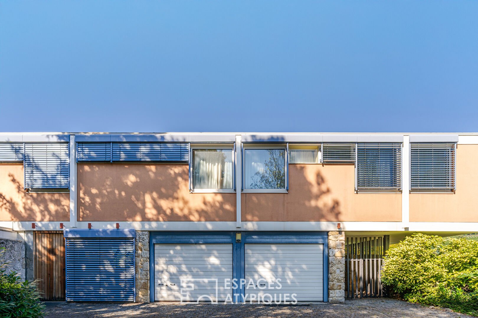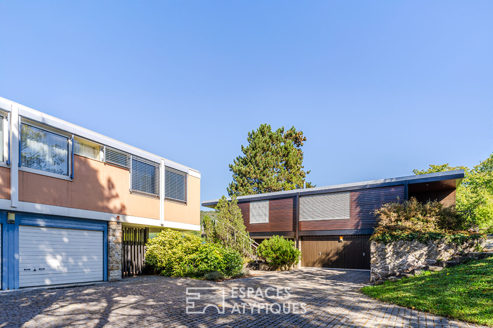 A la lisière du Parc Naturel Régional des Vosges du Nord, cette propriété d'exception prend place au coeur d'un parc paysager de 4 hectares. Conçue en 1959 par l'architecte Walter Brune, la maison principale de 306 m², véritable manifeste de l'architecture organique a été inspirée par Frank Lloyd Wright. Le domaine comprend également une seconde habitation indépendante de 130 m², une écurie privative et une piscine, offrant un art de vivre rare où la nature et le bâti dialoguent en totale symbiose. La maison principale efface les frontières intérieures pour privilégier la lumière et les volumes. Le vaste espace de réception de plus de 70 m², réchauffé par une cheminée en pierre brute et un plafond en bois chaleureux, s'ouvre sur le jardin par d'immenses baies vitrées. Dans son prolongement, la salle à manger et la cuisine équipée invitent à une convivialité contemplative. Ce niveau accueille également une première suite parentale complète. L'étage, dédié à l'intimité, distribue trois chambres spacieuses, deux salles de bain et un bureau baigné de lumière s'ouvrant sur une vaste terrasse avec une vue panoramique sur la canopée et les hauteurs environnantes. Le parc paysager, véritable écrin de verdure, accueille également une seconde bâtisse qui abrite deux logements indépendants, parfaits pour une activité de chambres d'hôtes, un atelier d'artiste ou un projet intergénérationnel. Les passionnés de nature et d'équitation apprécieront cet espace privatif permettant d'accueillir des chevaux au coeur du domaine, ainsi qu'une dépendance agricole dédiée au stockage. Idéalement située à seulement 3 minutes en voiture du centre historique de Wissembourg, de sa gare et de ses commerces, la propriété dispose également de quatre garages fermés et de grandes caves. Ce lieu singulier, où chaque ligne de pierre et de bois souligne l'horizon, offre un équilibre parfait entre l'isolement propice à l'introspection et la proximité immédiate des commodités urbaines. Cette signature architecturale rare constitue une opportunité unique pour les amateurs de patrimoine contemporain et de grands espaces. Une visite s'impose pour ressentir toute l'énergie et le potentiel de ce lieu hors du commun. CLASSE ENERGIE : E / CLASSE CLIMAT : D Montant moyen estimé des dépenses annuelles d'énergie pour un usage standard, établi à partir des prix de l'énergie de l'année 2021/2022/2023 : entre 8520 euros et 11630 euros Contact : Cédric 06.78.54.01.95 Cédric RICCIO (EI) Agent Commercial - Numéro RSAC : 908744840 - Strasbourg.