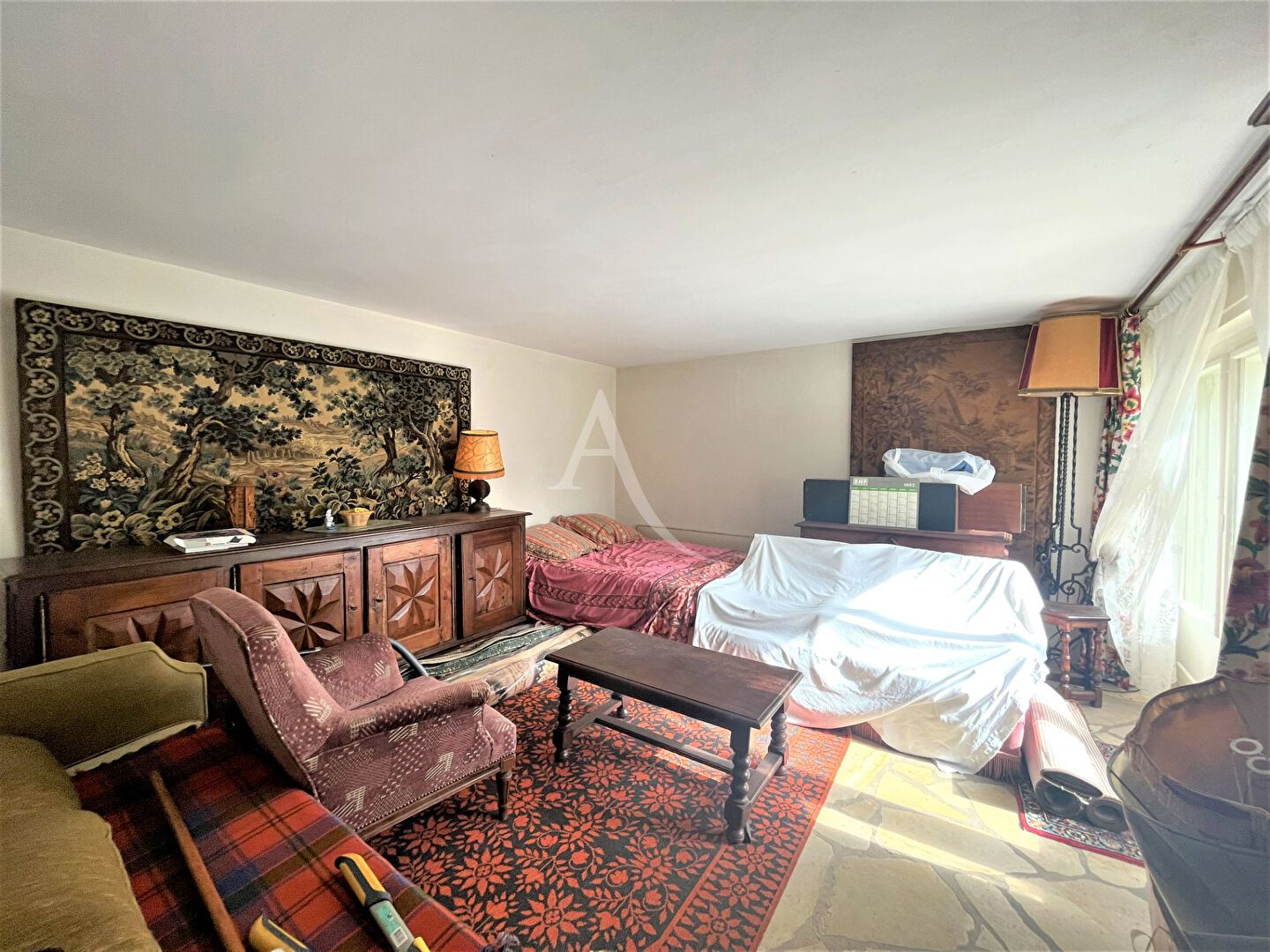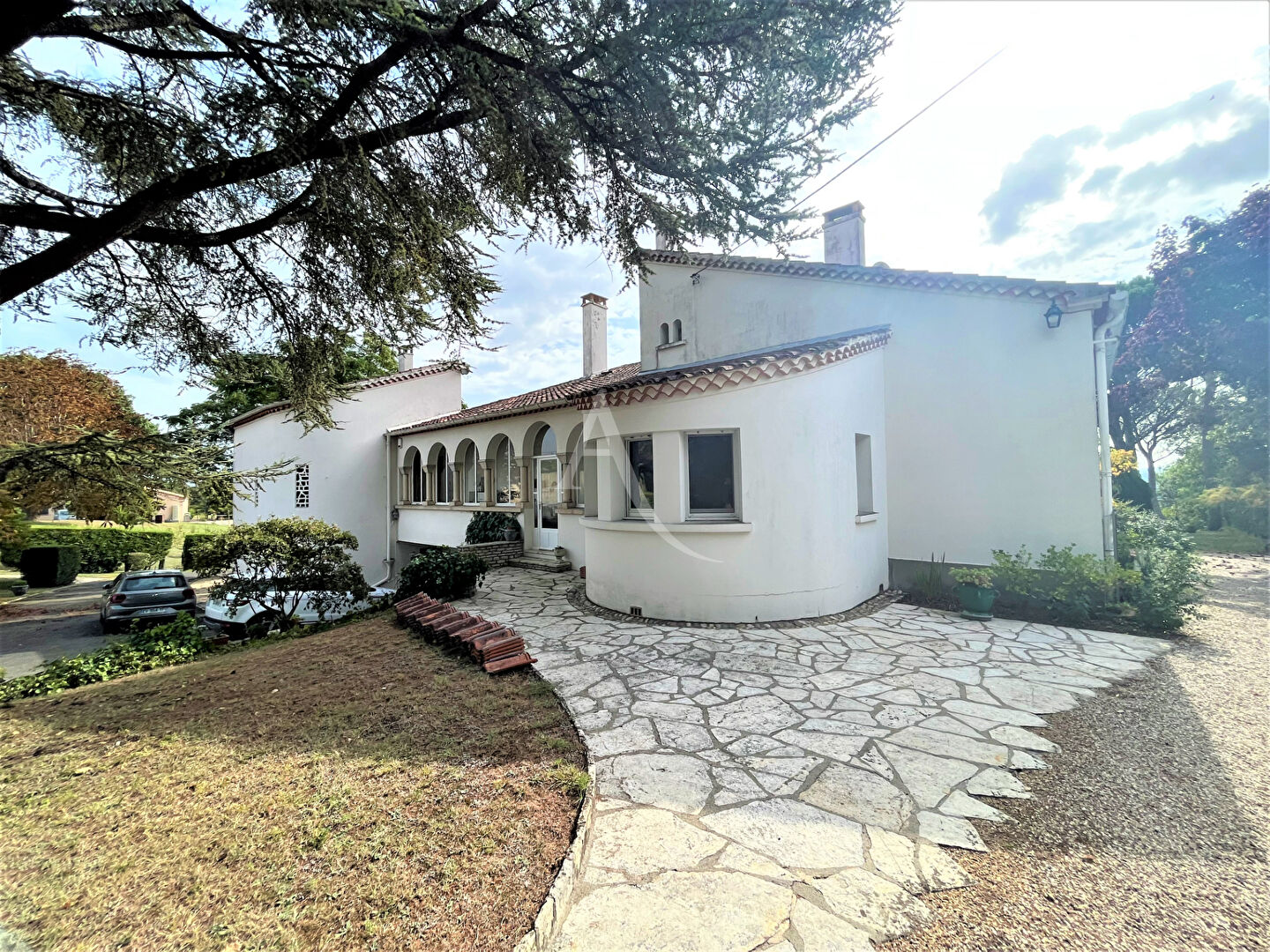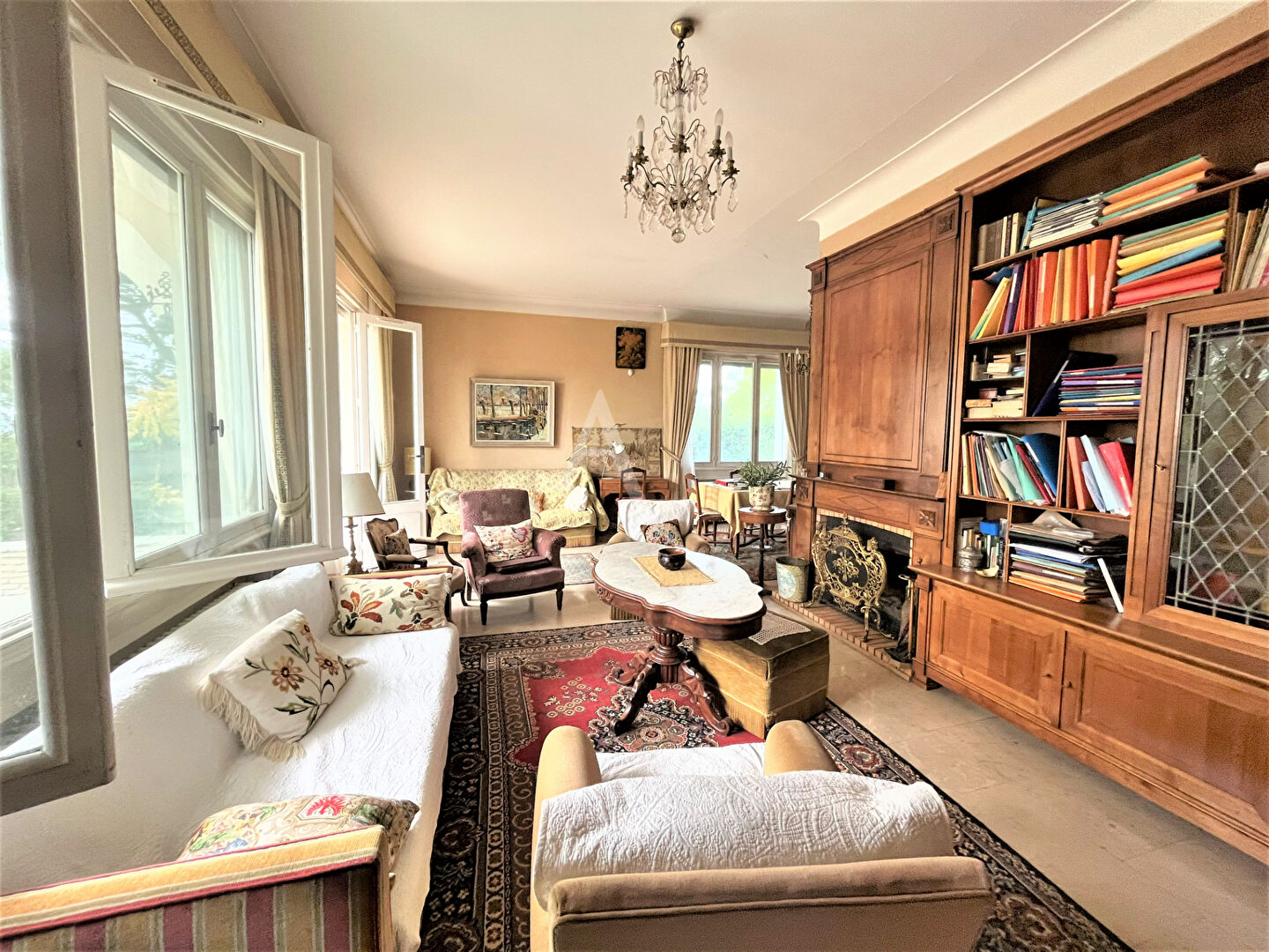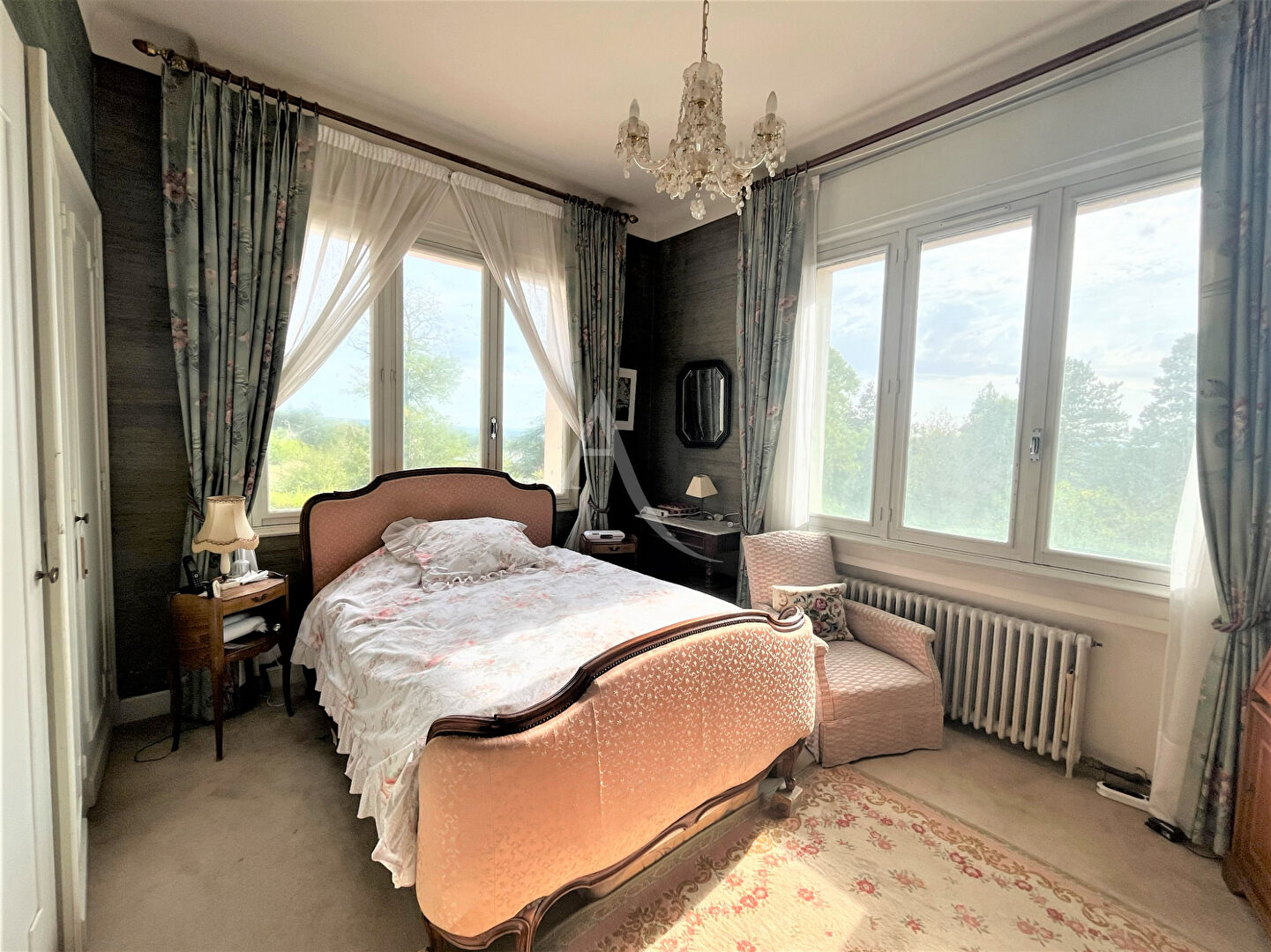 A vendre magnifique maison d' Architecte avec véranda et petit logement. De1960, cette maison est construite avec des matériaux de très bonne qualité. Sol en marbre, plancher châtaigner, moustiquaires à chaque fenêtre en bronze avec volets en bois d' Oregon électriques et avec manivelle, cheminée insert avec double évacuation... Chaque chambre sauf une a son lavabo privé en plus des deux salles d' eau et une salle de bain de la maison. Un dressing. Cuisine de 24 m2 en merisier massif, salon-salle à manger de 42 m2, en plain-pied trois chambres, une salle d' eau et une bibliothèque avec cheminée ancienne et vitraux dans la tour. A l' étage, deux chambres mansardées avec lavabos et une salle d' eau. Au niveau -1 un logement avec salle d' eau et un accès à une terrasse privée. Au sous-sol: une chaufferie, une buanderie, une cave et un garage. Une petite grange en pierre. Piscine à remettre en fonction. Terrain arboré de 9668 m2. Route goudronnée privée pour entrer et sortir de la propriété. Affaire rare, à visiter sans tarder!!