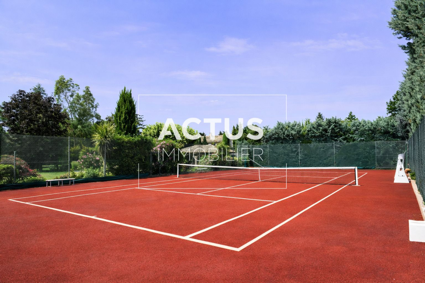 Les extérieurs, particulièrement soignés, offrent de nombreux équipements : court de tennis éclairé, terrain de pétanque, espaces de loisirs et larges zones paysagées propices à la détente.