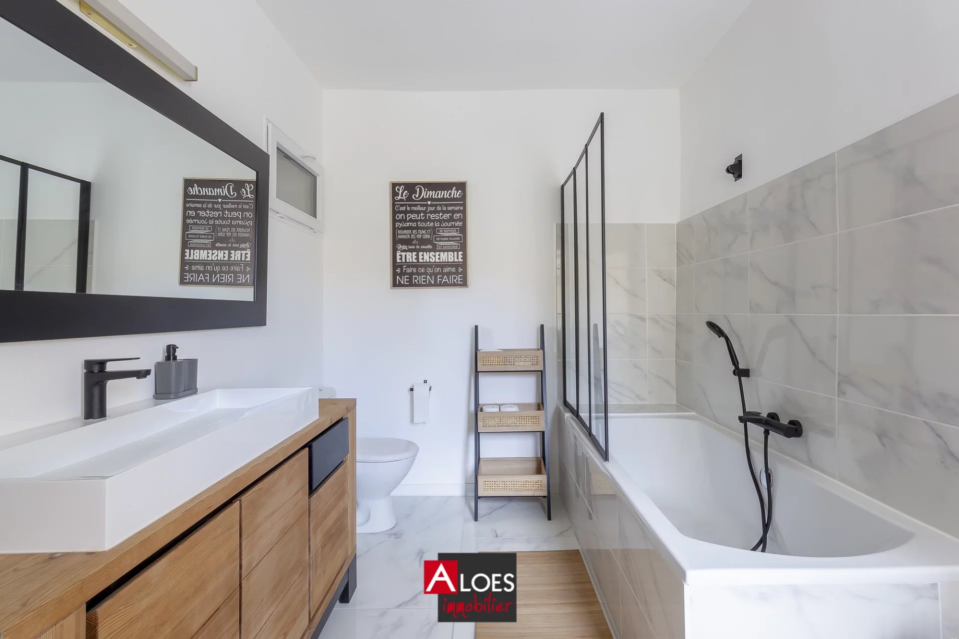 Au premier étage, vous trouverez une chambre, une salle d’eau avec baignoire et WC, ainsi qu’une pièce cellier-buanderie, très pratique pour le rangement et l’organisation du quotidien.