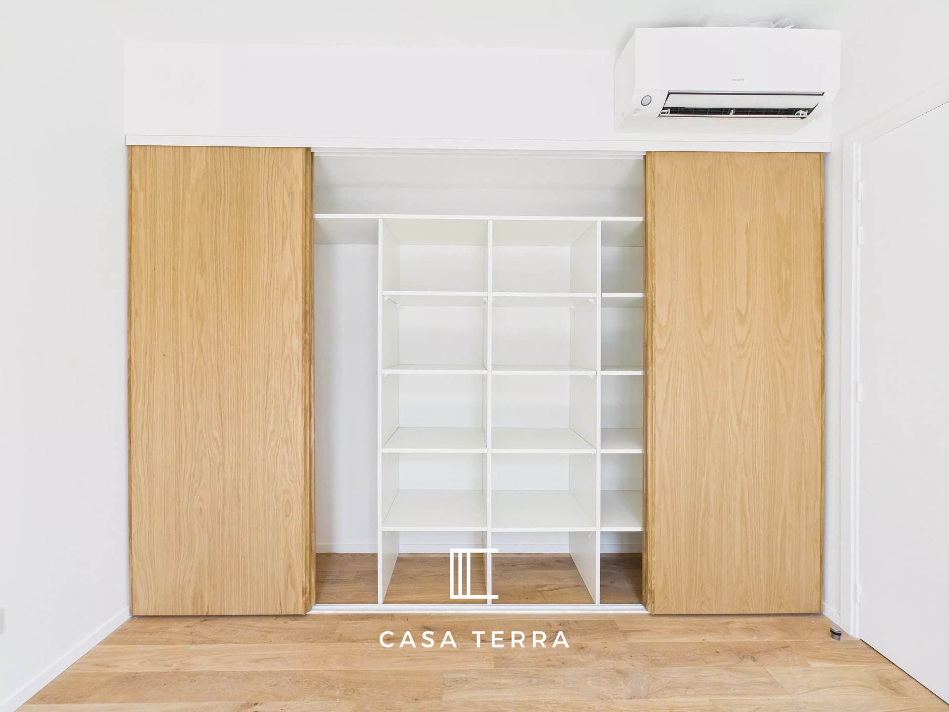 À cela s'ajoute un balcon et des prestations haut de gamme : une climatisation réversible Daikin, un élégant parquet en chêne dans la chambre, un carrelage 80 x 80 cm dans le reste de l'appartement, des placards aménagés avec plaquage chêne, un sèche serviette électrique Acova, une porte palière blindée, etc.