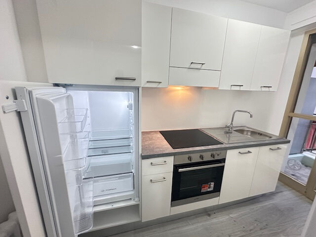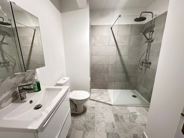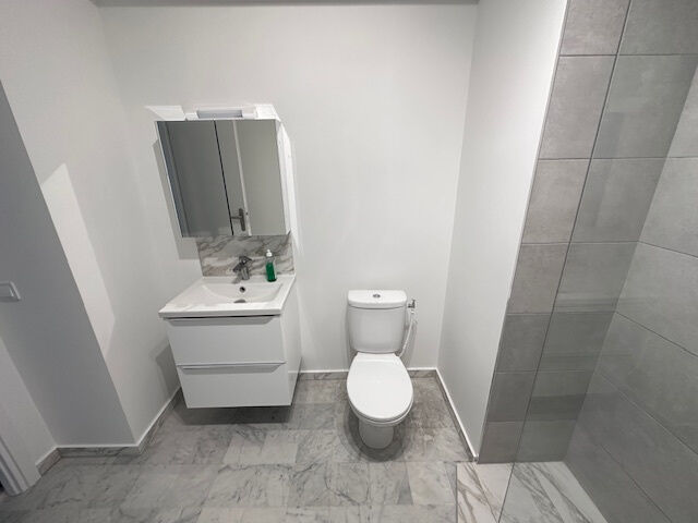 Cuisine indépendante aménagée, pièce de vie avec terrasse et salle d'eau avec WC