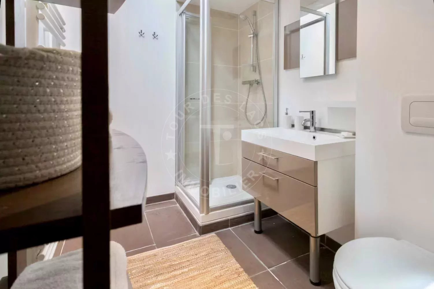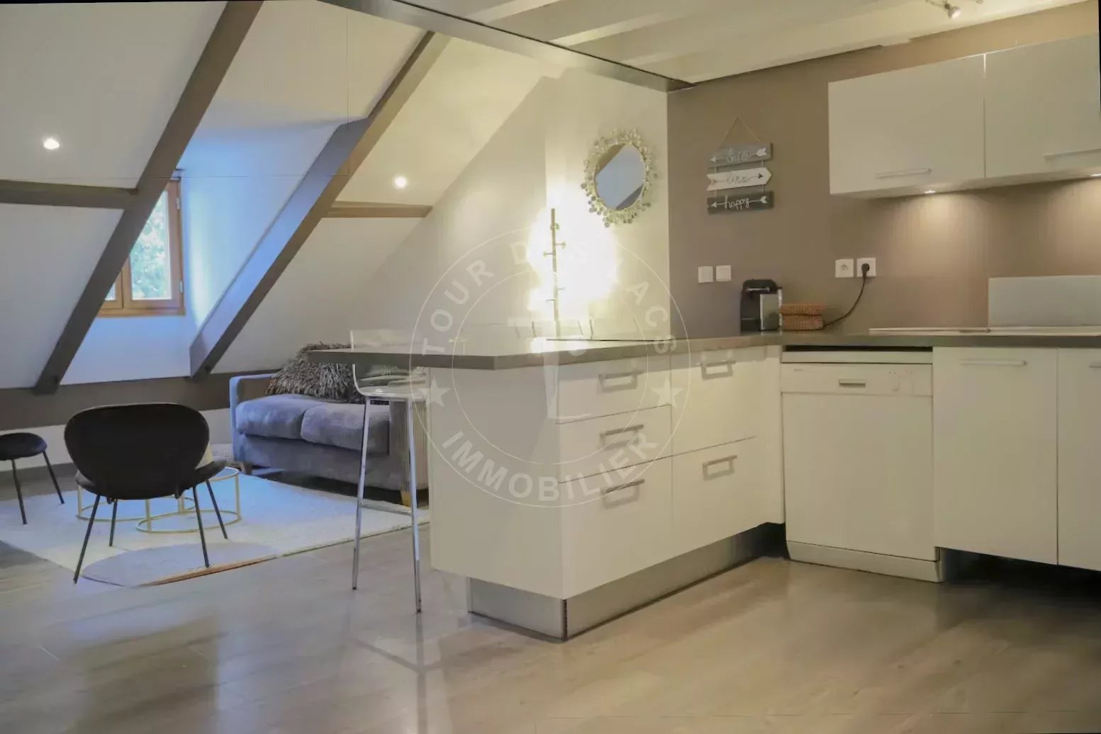 L’appartement séduit par ses volumes généreux et sa luminosité. Il se compose d’un salon-séjour élégant avec rangements intégrés, d’une cuisine contemporaine ouverte, entièrement équipée, ainsi que d’une chambre en mezzanine offrant une atmosphère intime et raffinée. Une salle de douche avec WC, aux finitions soignées, complète l’ensemble.