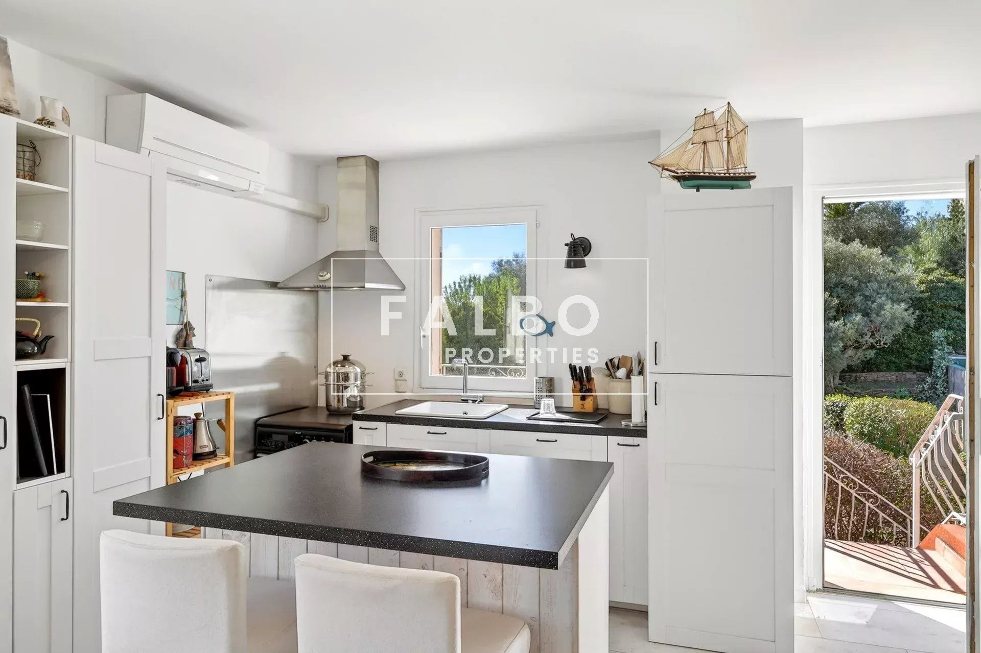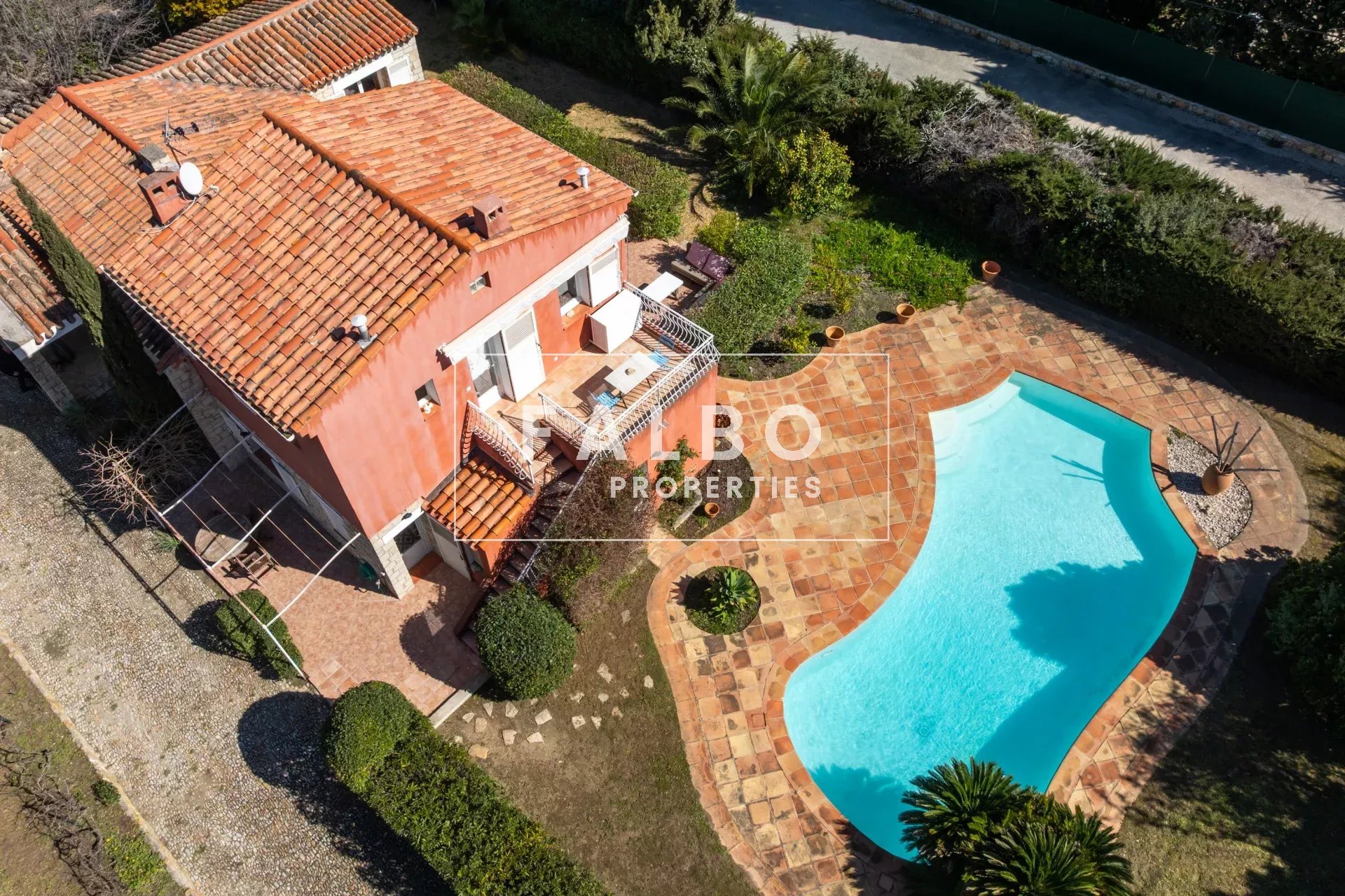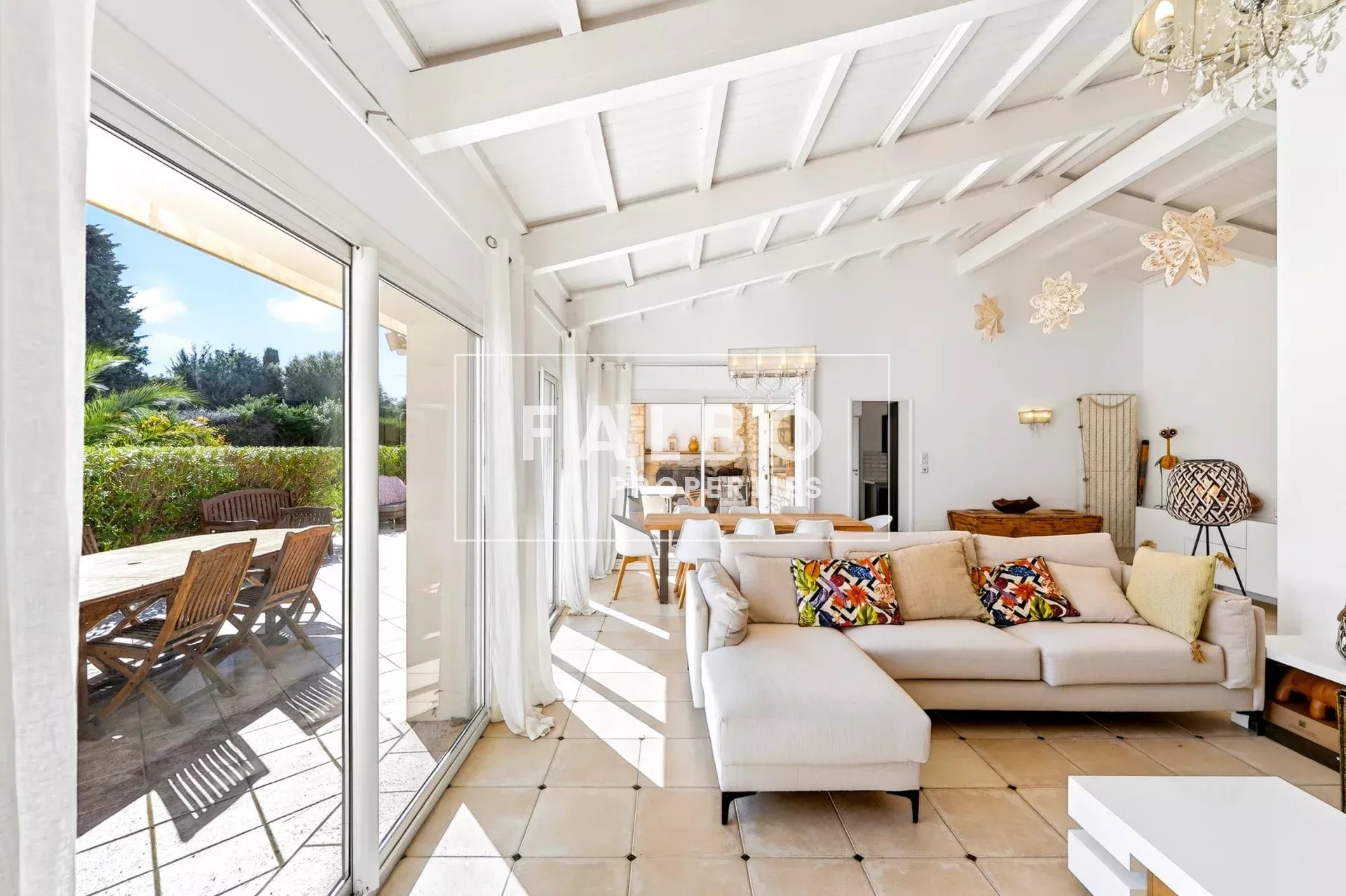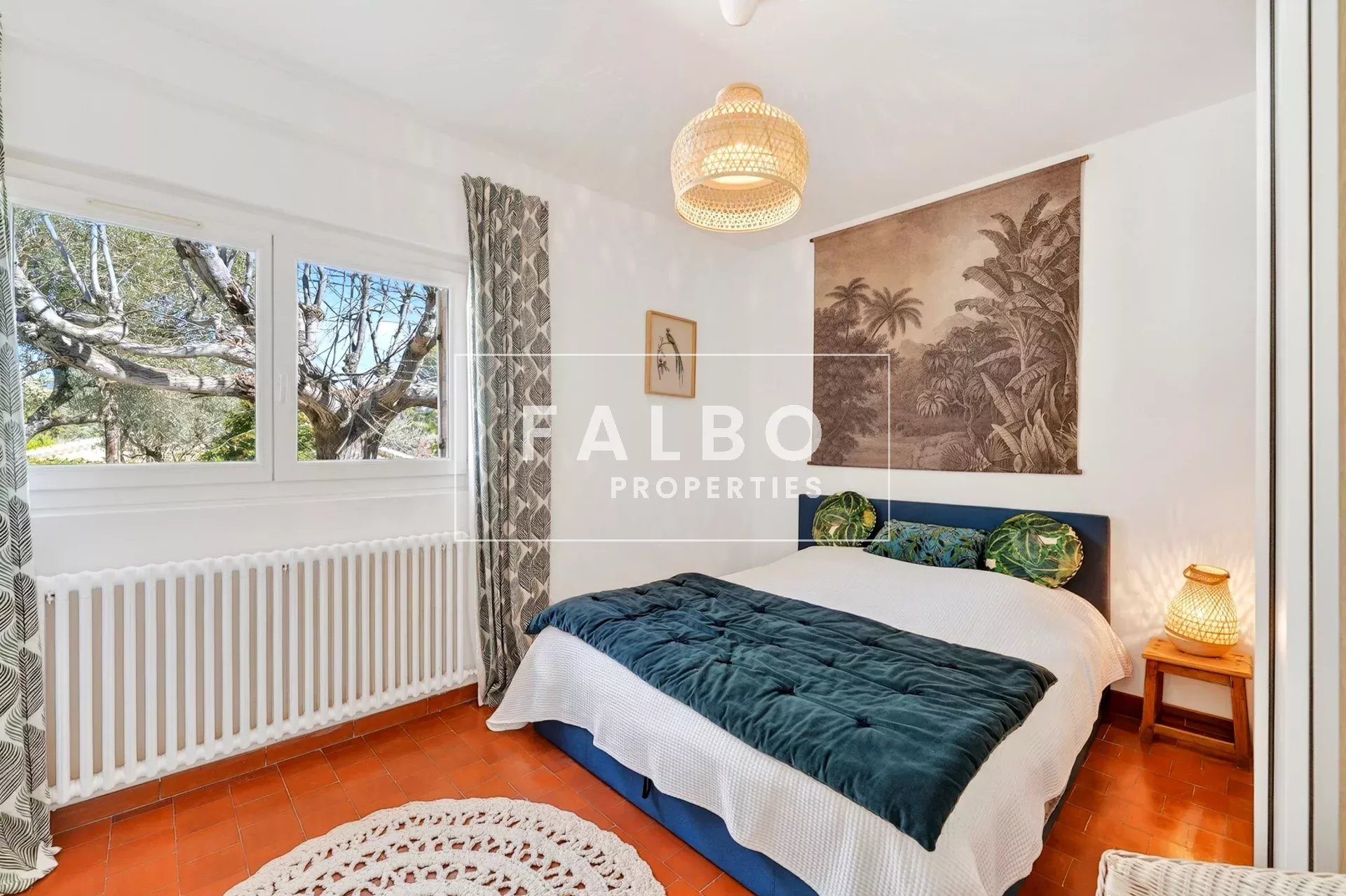 En exclusivité, située dans un domaine fermé et recherché avec gardien, tennis et offrant un accès direct à la mer. Villa traditionnelle des années 50 en bon état avec 120 m2 de plain pieds avec salon cheminée, une salle à manger avec plafonds rampants et de grandes baies sur la terrasse, cuisine avec repas prolongée d'une chaufferie cellier, un partie nuit avec trois chambres et une salle de bains. En complément un appartement indépendant à l'étage de type 2 de 32 m2 plus une chambre indépendante avec sanitaire de 10 m2. Au calme sur un jardin paysager d'environ 1600 m2 avec piscine garage et cave. Accès rapide à l'autoroute et aux commodités complètent le confort quotidien. Possibilité de surélévation.