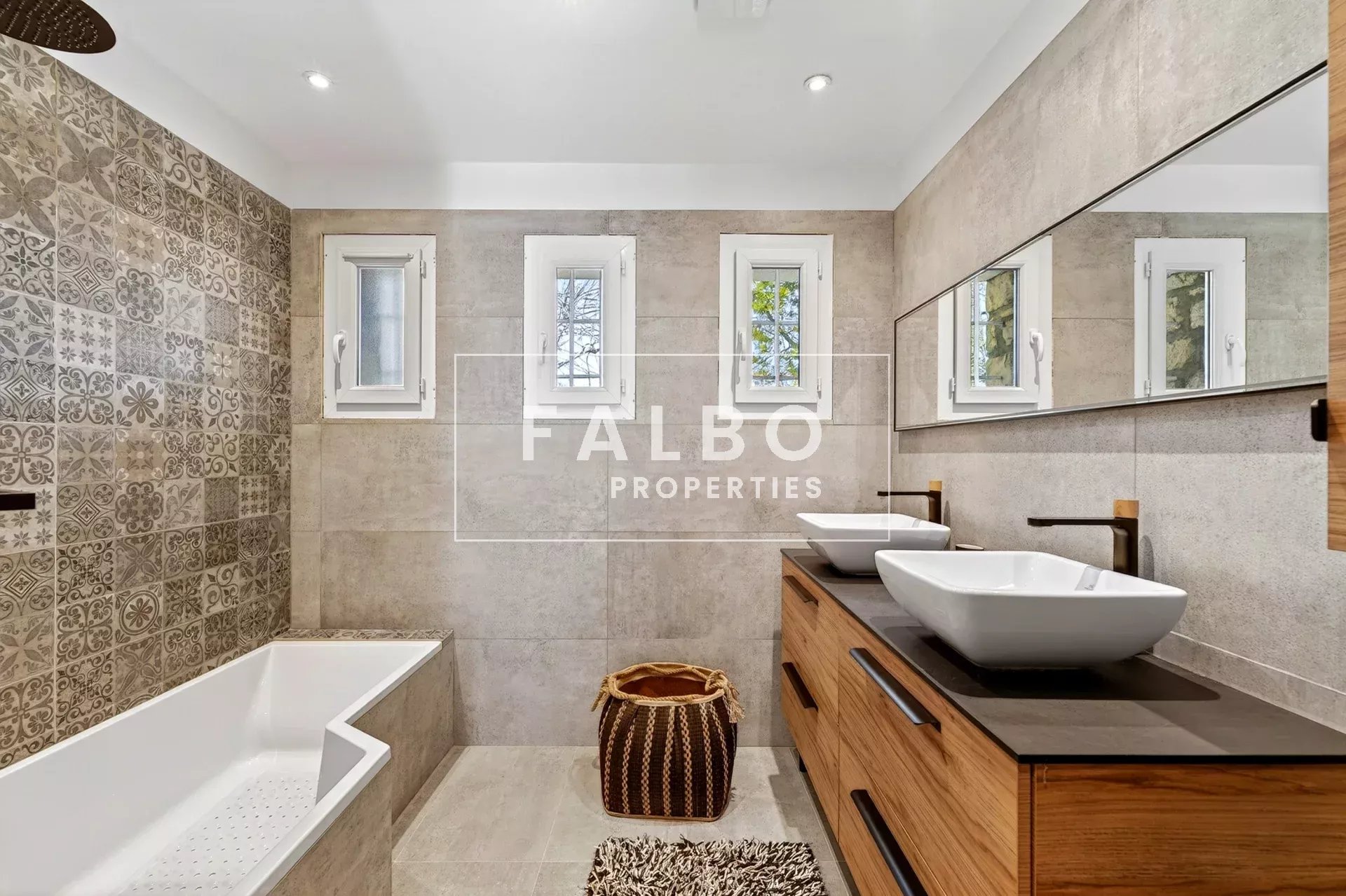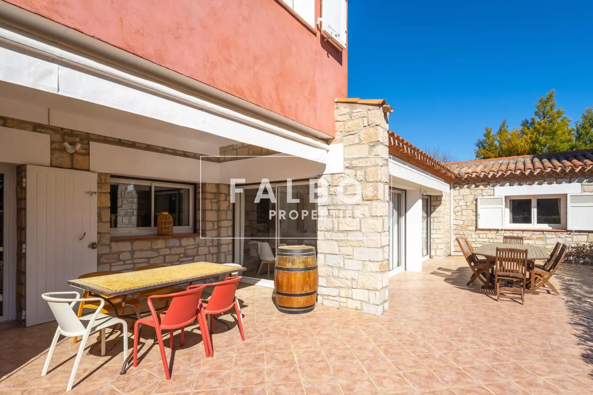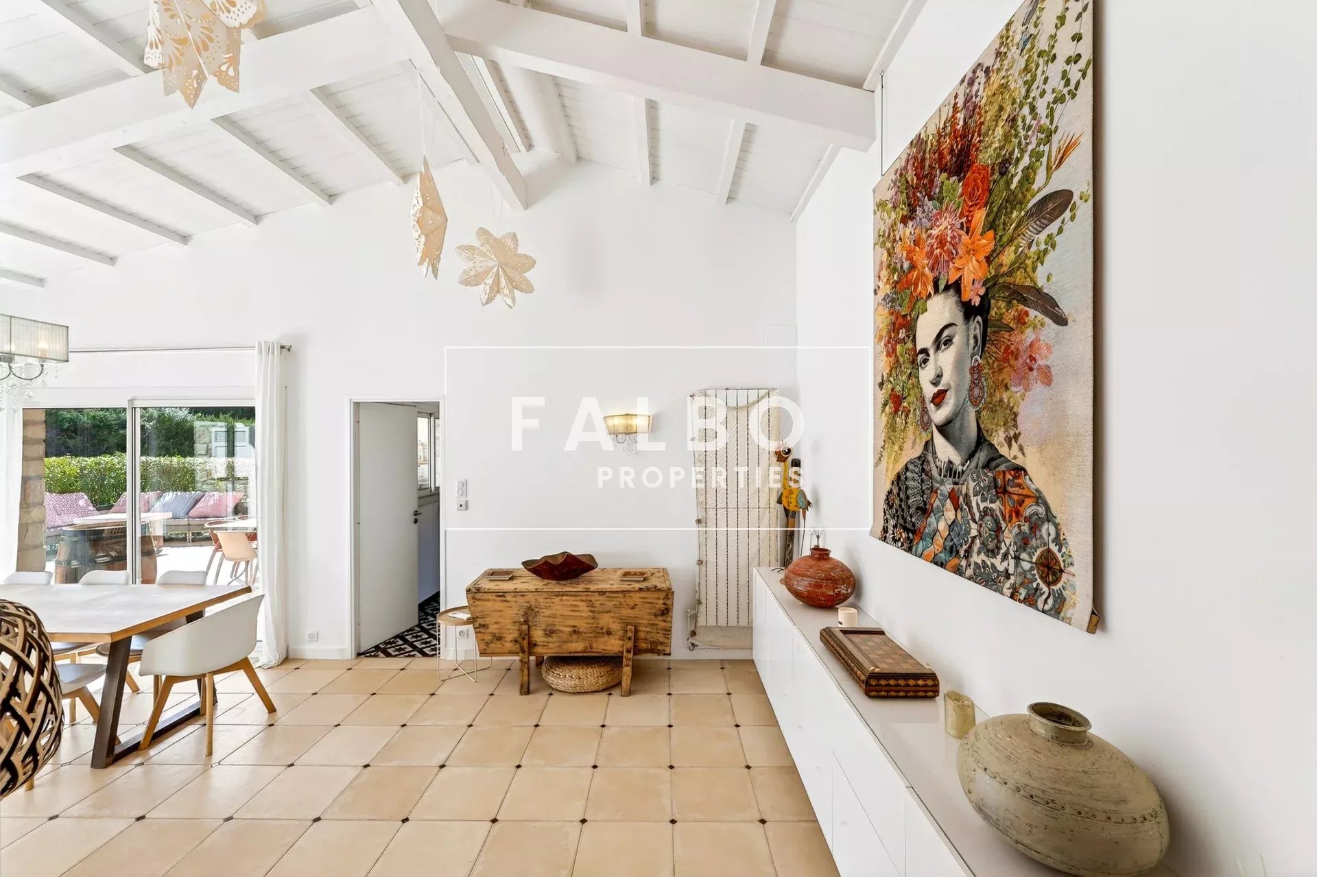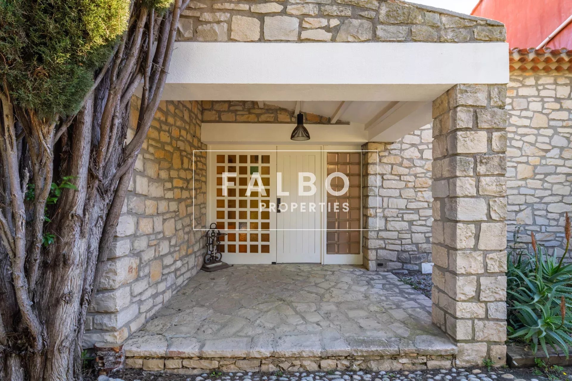 En exclusivité, située dans un domaine fermé et recherché avec gardien, tennis et offrant un accès direct à la mer. Villa traditionnelle des années 50 en bon état avec 120 m2 de plain pieds avec salon cheminée, une salle à manger avec plafonds rampants et de grandes baies sur la terrasse, cuisine avec repas prolongée d'une chaufferie cellier, un partie nuit avec trois chambres et une salle de bains. En complément un appartement indépendant à l'étage de type 2 de 32 m2 plus une chambre indépendante avec sanitaire de 10 m2. Au calme sur un jardin paysager d'environ 1600 m2 avec piscine garage et cave. Accès rapide à l'autoroute et aux commodités complètent le confort quotidien. Possibilité de surélévation.