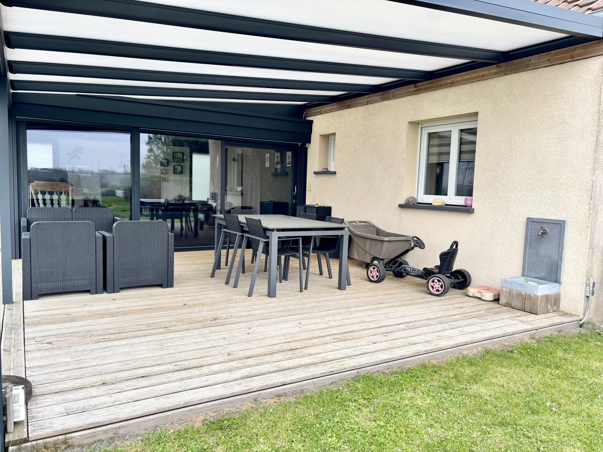 Belle maison individuelle de 2010 habitable de plain pied à 10 minutes de Cambrai(secteur sud). Pièce de vie lumineuse avec salon/séjour et cuisine équipée. Poêle à bois. Véranda d'environ 20 m2 qui offre un bel espace confortable grâce aux grandes baies vitrées coulissantes assurant confort thermique et acoustique sur une vue dégagée. Le RDC dispose également d'une chambre avec dressing et d'une salle de bain avec baignoire et douche à l'italienne. (habitable de plain pied!). Cellier et Wc indépendant. A l'étage, palier desservant deux chambres. Sur l’extérieur, grand jardin d'environ 1500 m2 entièrement clos offrant une grande terrasse avec pergolas. 3 garages et carport. Abri de jardin. Portail électrique . Faire vite pour ce pavillon individuel au calme et proche de Cambrai! Ce bien vous est présenté par Geoffroy Beauloye Eleven immobilier. RSAC 883172983. 06x84x75x35x64