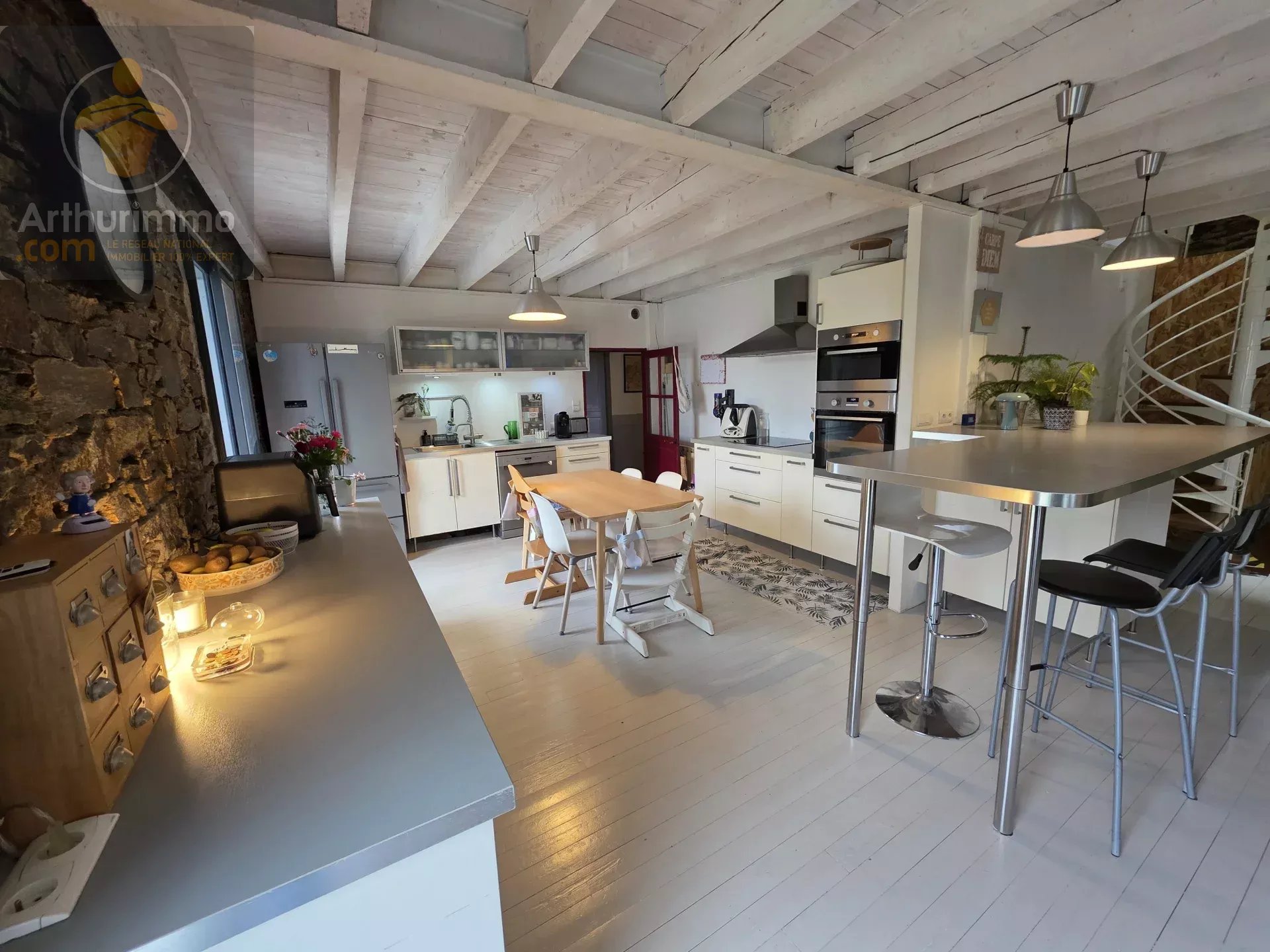 Découvrez cette ravissante maison en pierre, alliant charme et fonctionnalité ! elle offre: une entrée indépendante, un espace de vie lumineux et chaleureux, doté d’une cuisine moderne entièrement aménagée et équipée, agrémentée d’un poêle à bois (73m²) Deux chambres au rez-de-chaussée (16,3 et 22m²), ainsi qu’une salle de bains spacieuse avec douche et baignoire, une buanderie pratique et un WC indépendant. À l’étage, sous un charmant plafond rampant, découvrez un espace nuit généreux et plein de possibilités ! Trois chambres lumineuses et spacieuses, chacune offrant un volume unique grâce à leur surface au sol et leur surface habitable optimisée : Chambre 1 : 35,6 m² au sol (14 m² habitables) Chambre 2 : 32 m² au sol (13,73 m² habitables) Chambre 3 : 28 m² au sol (12 m² habitables) Un bureau ou coin lecture de 14 m² au sol (5,8 m² habitables) Une salle d’eau avec WC de 9 m² au sol (5,41 m² habitables) Un potentiel d’aménagement exceptionnel : les volumes sous plafond rampant apportent du cachet et permettent des rangements sur mesure, des espaces sous toiture aménagés en dressing. Un étage où chaque mètre carré est pensé pour allier confort, style et fonctionnalité ! Un garage de 130 m²(idéal pour artisan ou profession libéral) est attenant à la maison, et l’ensemble est niché dans un jardin paysagé de 500 m², clos et arboré avec 2 portails motorisés. Une maison où il fait bon vivre, à visiter sans tarder ! Visite virtuelle disponible sur le site de l'Agence. Honoraires à la charge du vendeur. Lien géorisque:https://www.georisques.gouv.fr/