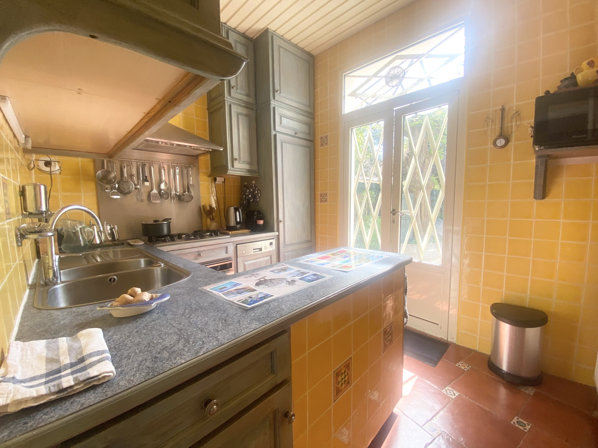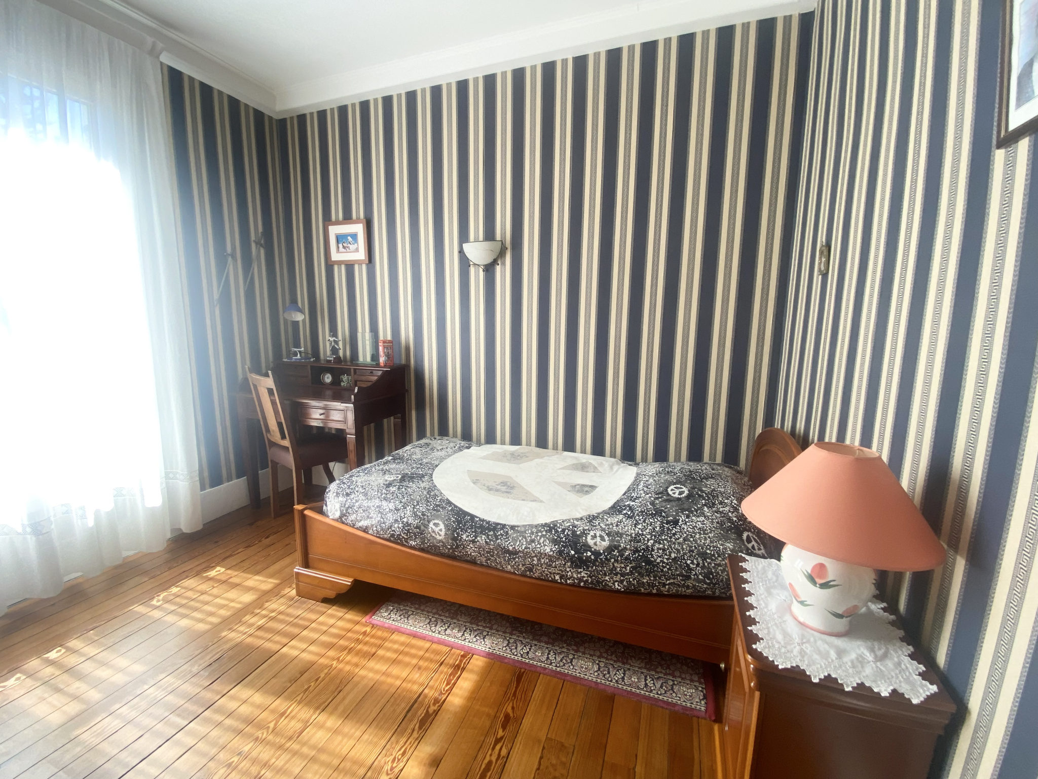 Édifiée sur un terrain arboré de plus de 743 m2, elle offre un cadre de vie paisible et un cachet exceptionnel. Dès l'entrée, les carreaux de ciment d'origine donnent le ton. Sur la gauche, un bureau raffiné présente un superbe parquet massif en pointe de Hongrie typique des belles demeures 1900.