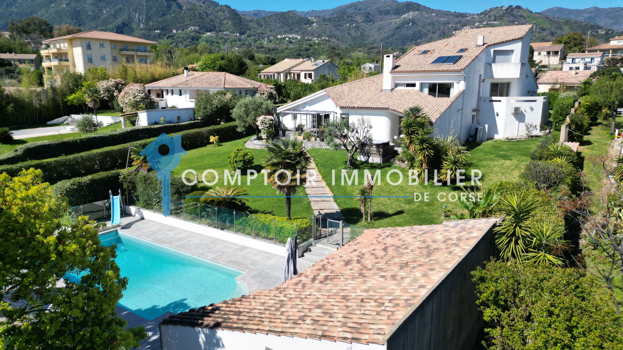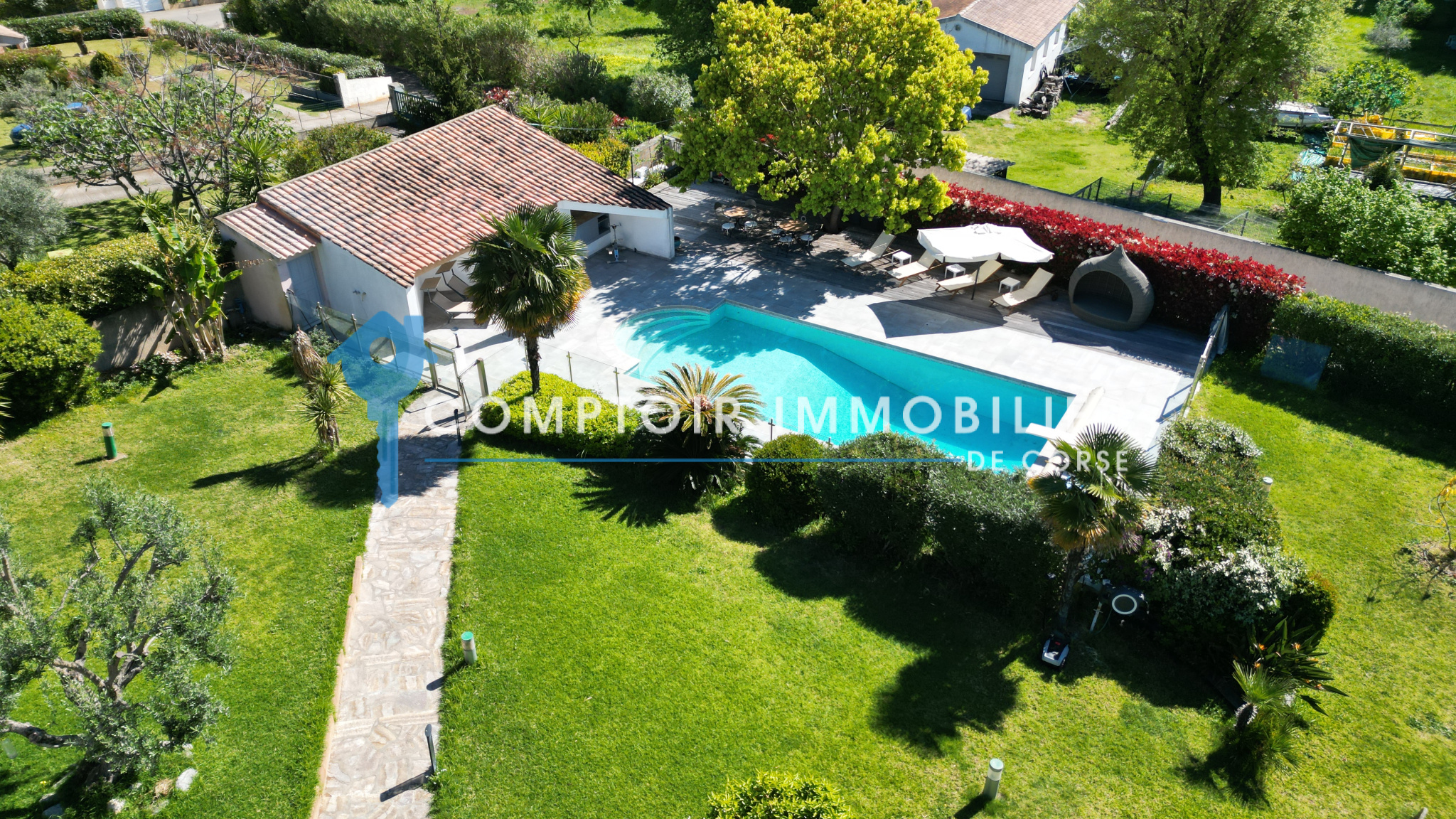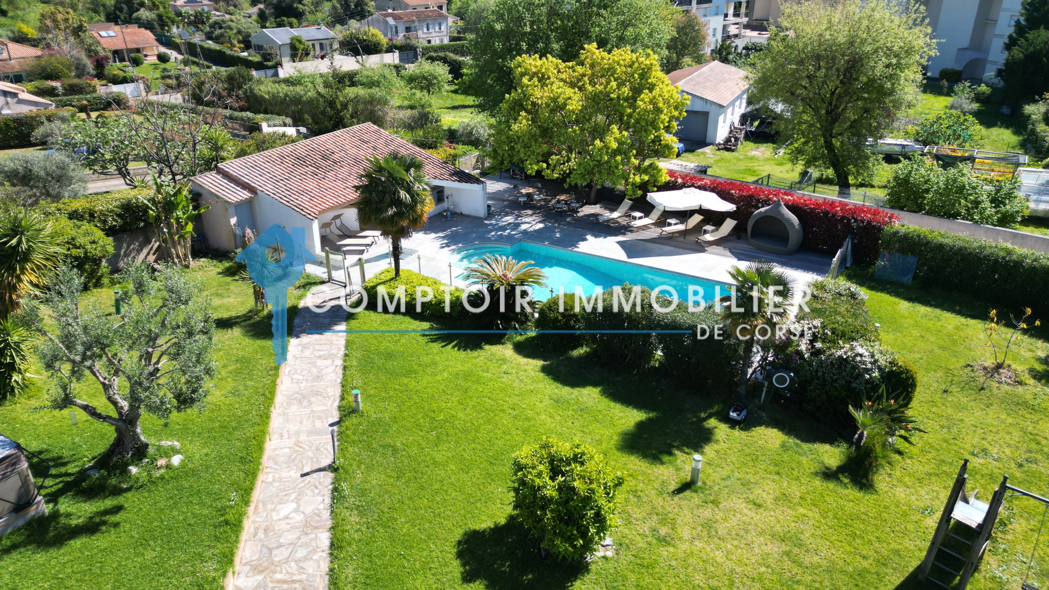 La parcelle, entièrement clôturée avec portail électrique, offre un jardin paysager et arboré, entretenu grâce à :