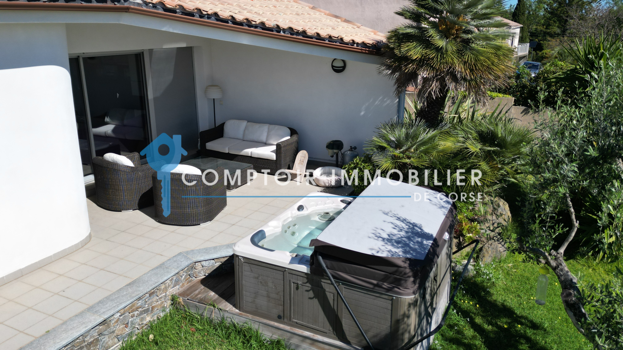 une terrasse principale équipée d'un grand jacuzzi,