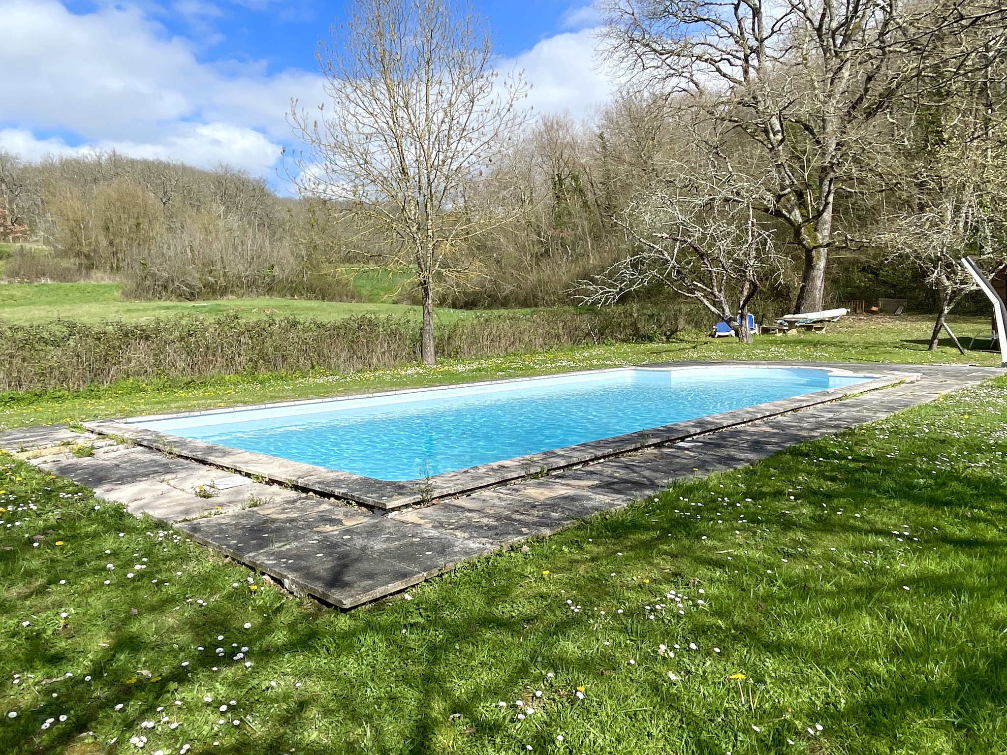 L'espace piscine à l'abri des regards, bénéficie de plages aménagées et d'une agréable vue dégagée sur la campagne, invitant à la détente en toute intimité.