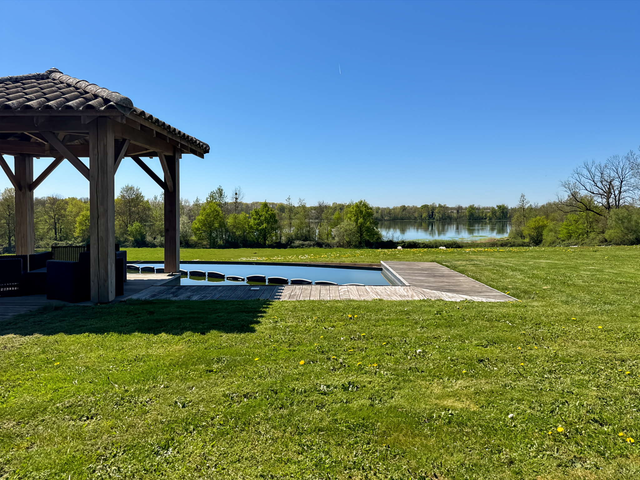 À l'extérieur, le spectacle est tout simplement saisissant. Implantée sur un terrain de près de 2 hectares, la propriété profite d'une vue exceptionnelle sur un lac et des prairies accueillant chevaux et faune environnante. Une piscine à débordement prolonge cette perspective unique et invite à la détente face à ce paysage vivant et apaisant.