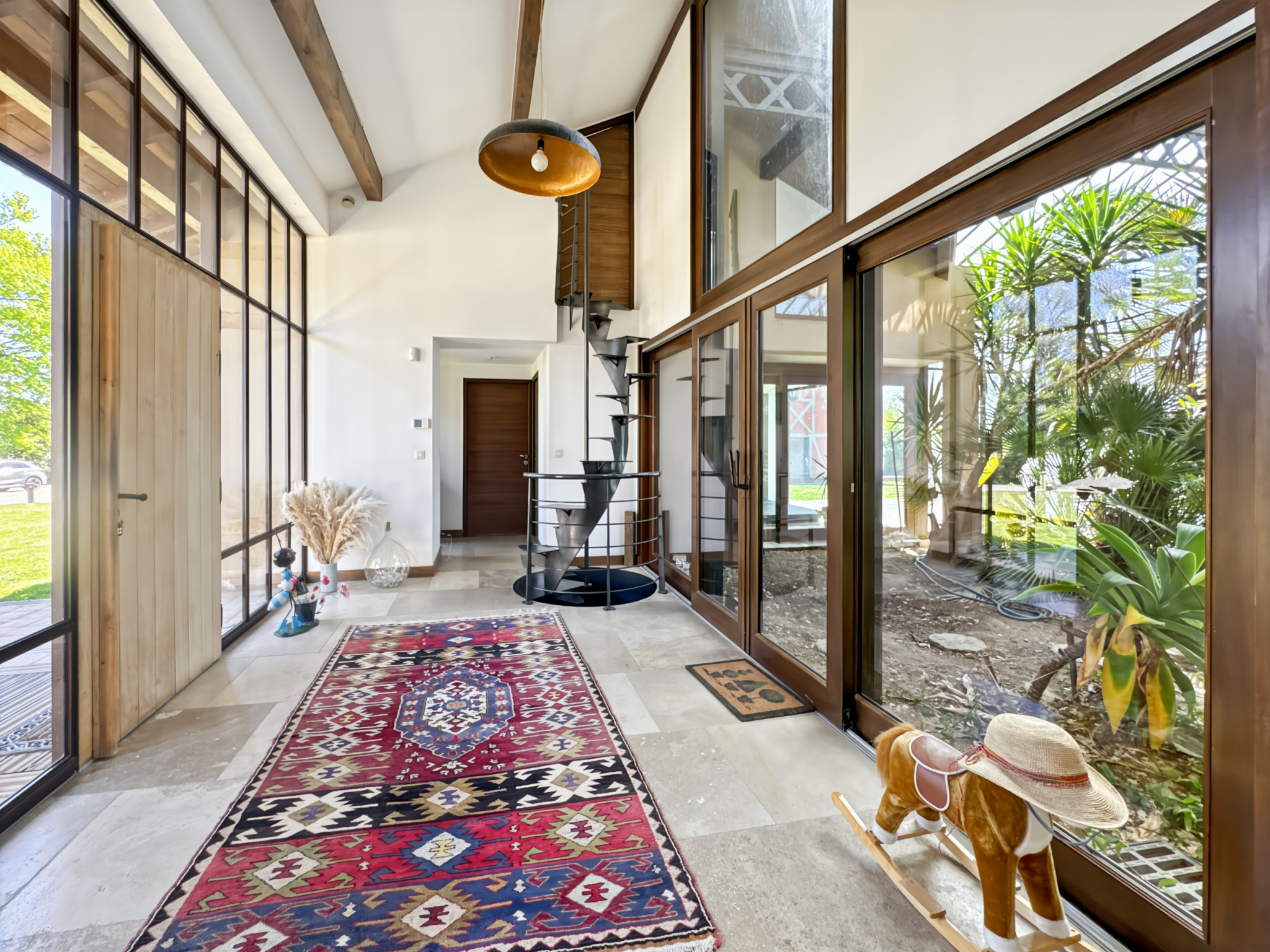 Édifiée en 2008 dans un remarquable style Bressan, lui conférantle charme de l'ancien, cette demeure de caractère de 10 pièces développe environ 300 m2 habitables et séduit dès l'entrée par son cachet unique. Vous serez immédiatement frappé par une somptueuse serre tropicale intégrée à la maison, véritable pièce signature qui confère aux lieux une atmosphère hors du commun.