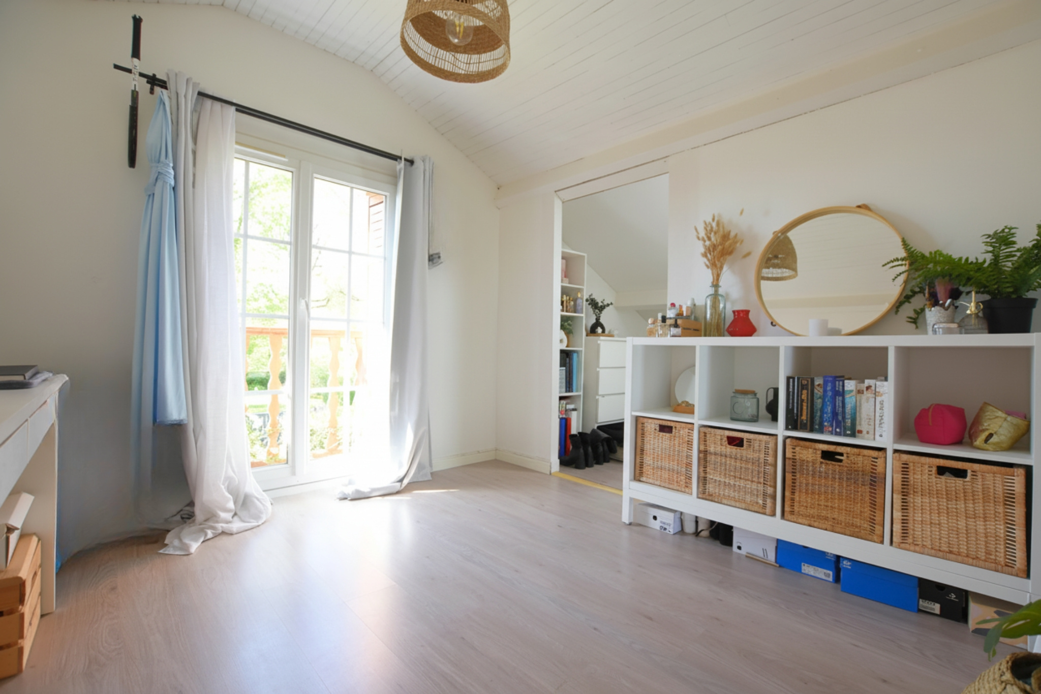 À l'étage, un palier dessert 2 chambres, dont une avec accès à une salle de bains avec WC. Un espace bureau est également présent, avec la possibilité de créer une 3e chambre selon vos besoins.