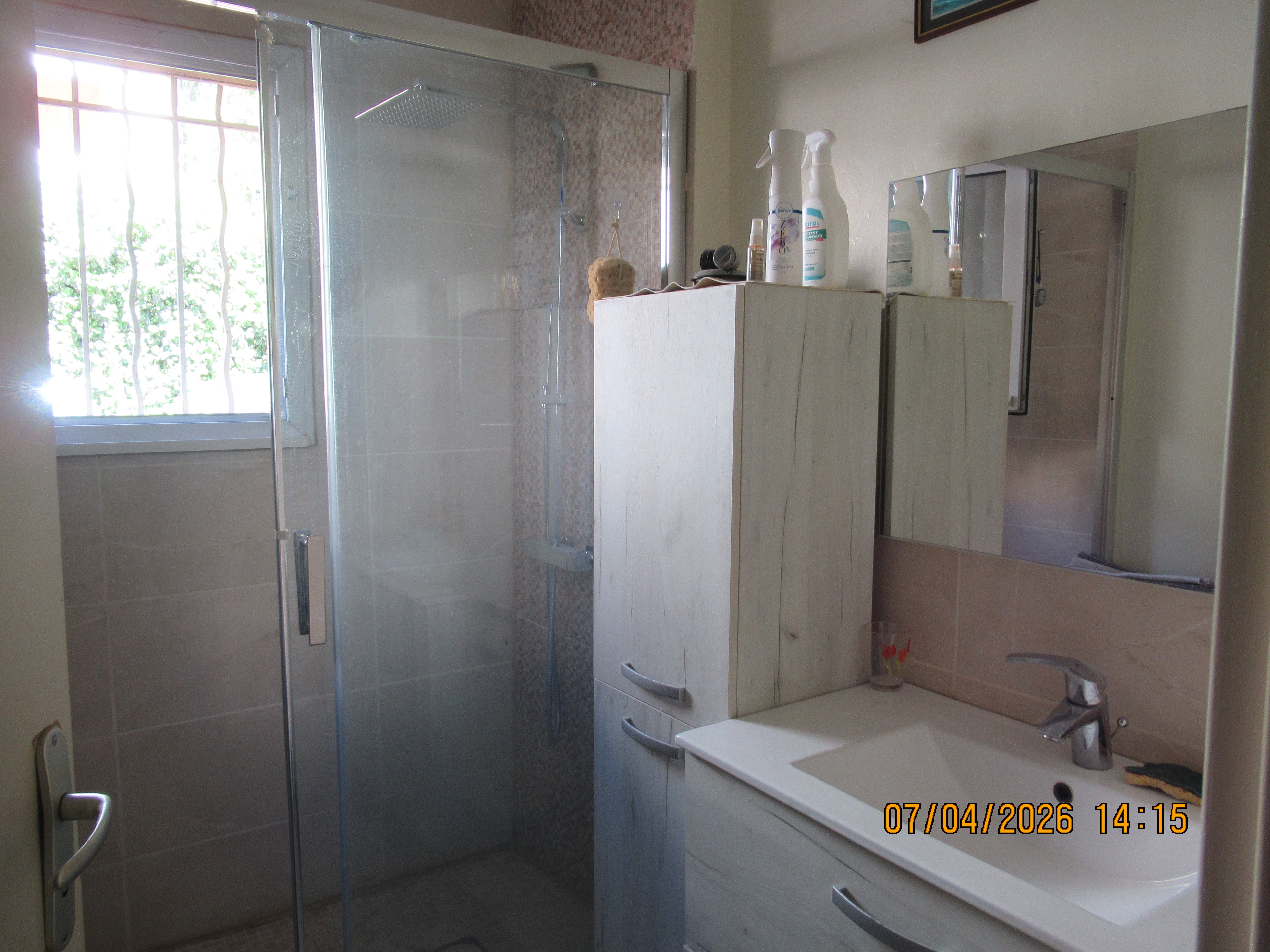 Salle d’eau récente avec douche à l'italienne ,sèche serviette électrique ,lavabo avec meuble et miroir .