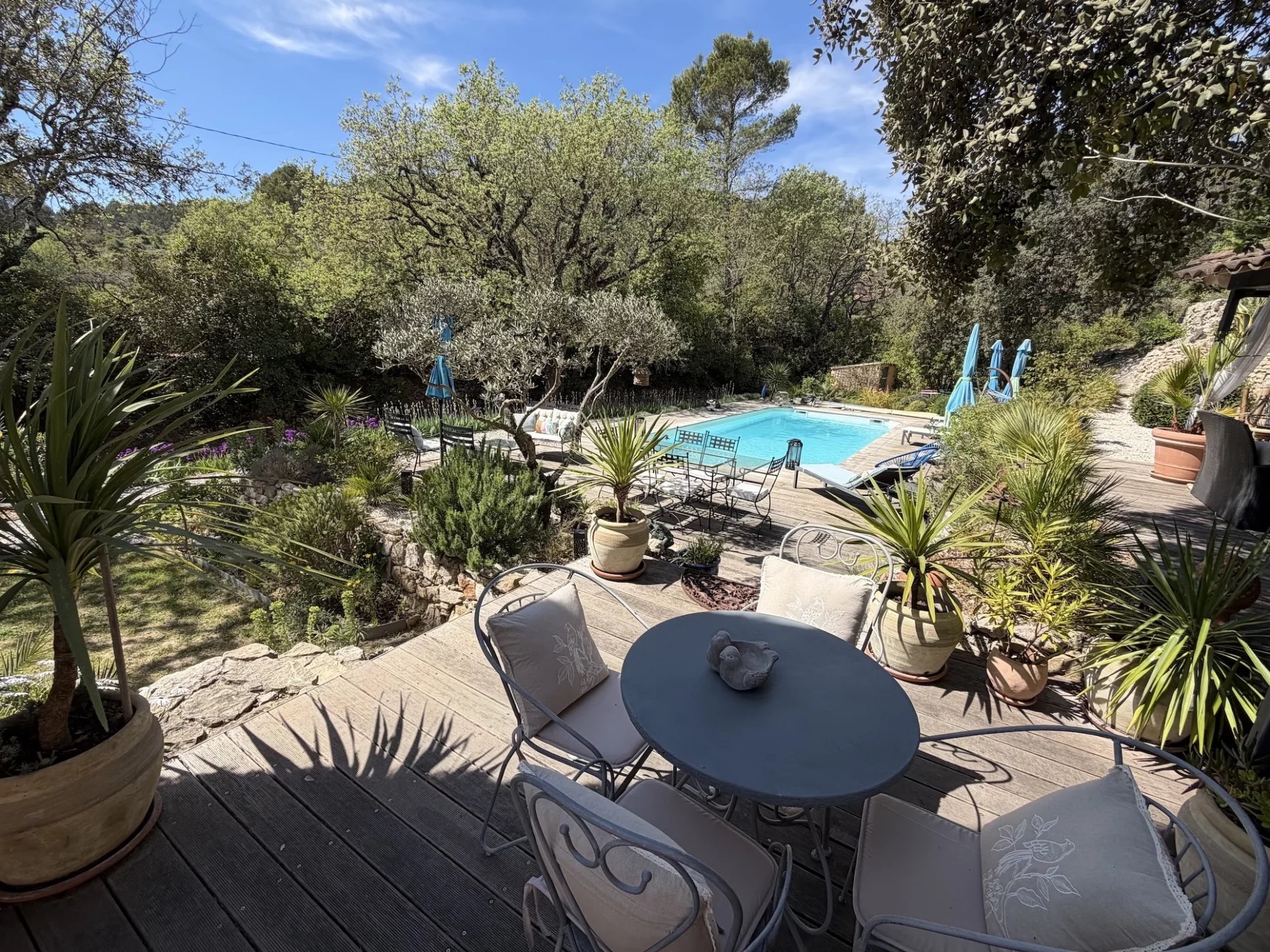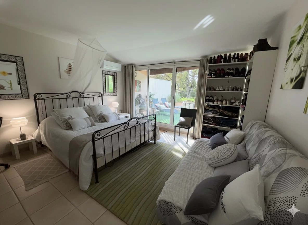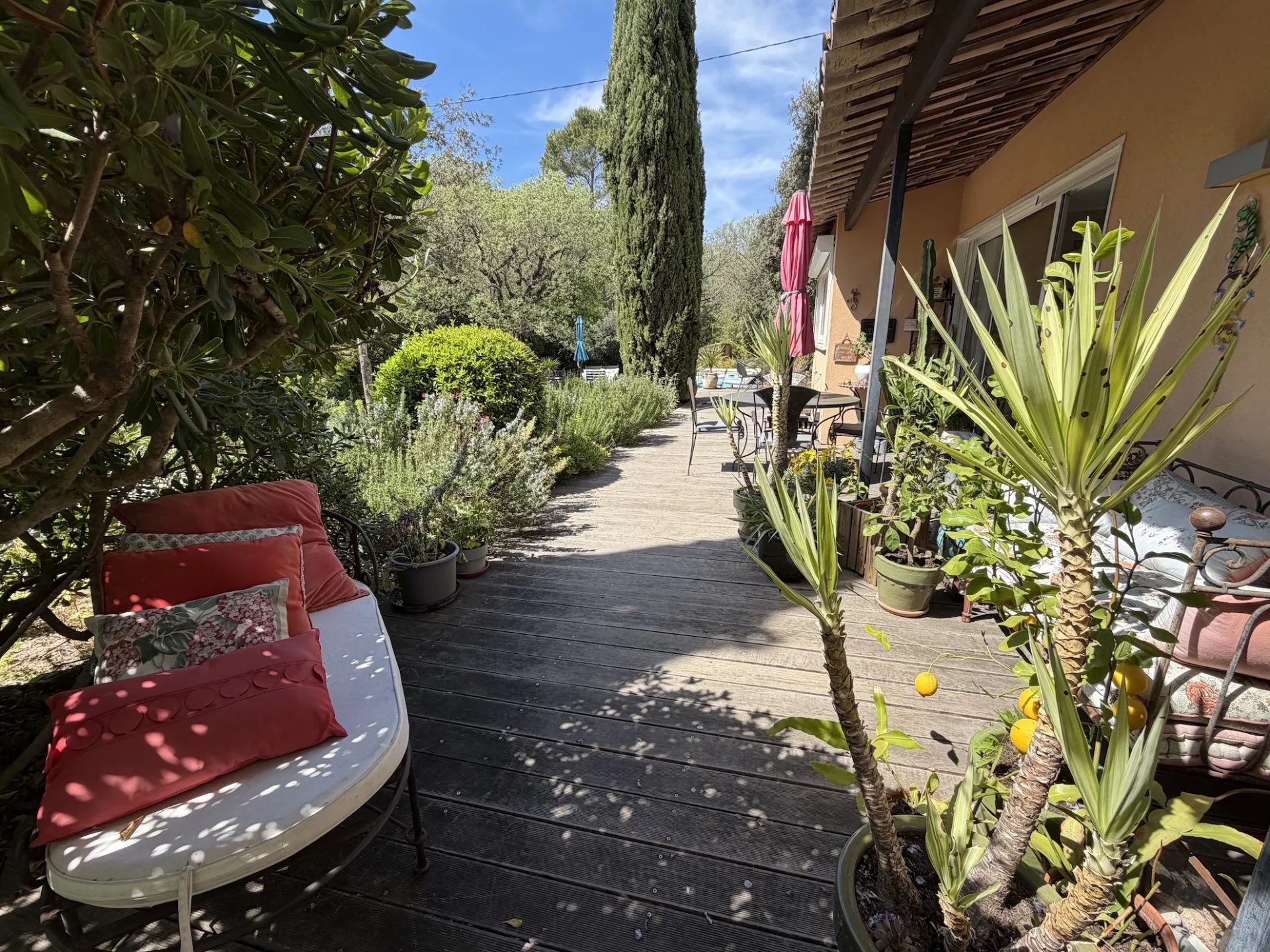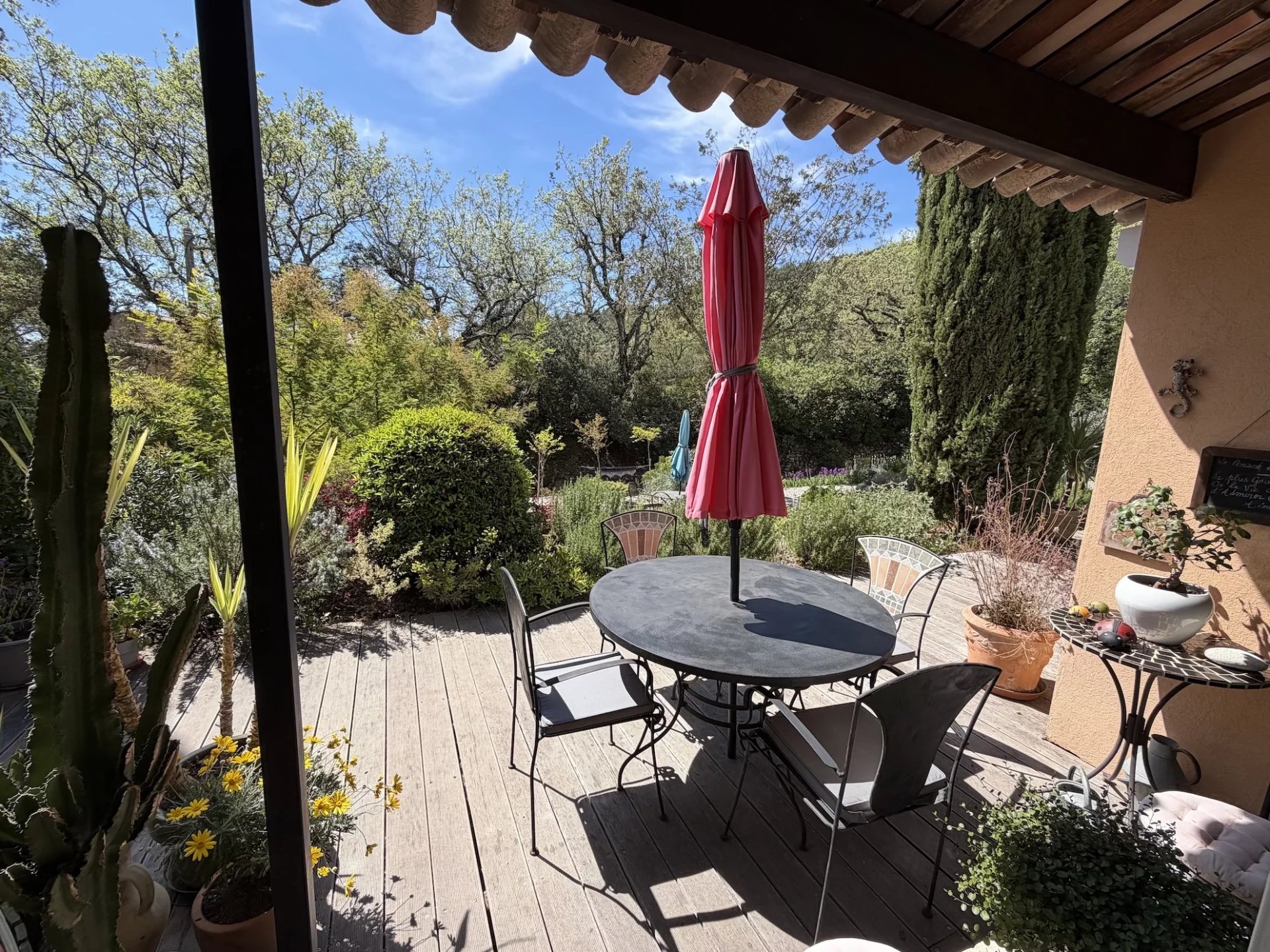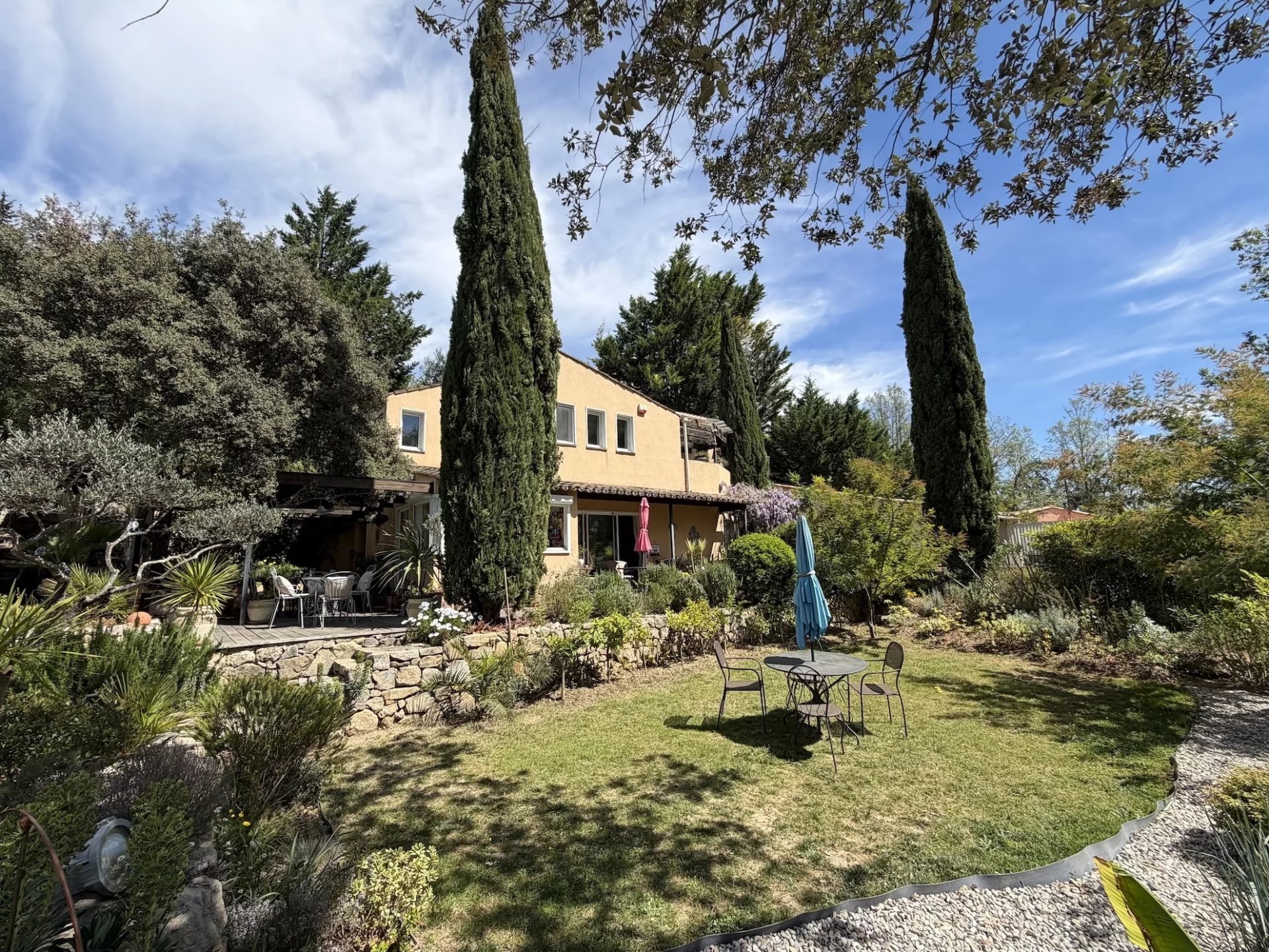 MAISON - COTIGNAC, entre les Gorges du Verdon et la Côte-d'Azur, au pied d'une impressionnante falaise de tuf, vous aurez le privilège de devenir propriétaire d’une jolie maison d’architecte dans un village de caractère unique aux façades colorées certifié Plus Beau Village de France depuis 2022. A proximité à pieds du village et de l’ensemble des commodités, la maison est implantée au cœur d’un terrain clos de 2 365 m² planté de nombreuses essences méditerranéennes. Sans vis à vis, au calme, elle offre une vue dégagée sur la campagne environnante. Le jardin est agrémenté d’une jolie piscine avec ses larges plages dallées. Une belle entrée avec dégagement, agréable salon / salle à manger avec cheminée. Cette pièce lumineuse s’ouvre sur la terrasse au Sud. Jolie cuisine ouverte entièrement équipée, cellier, tonnelle ombragée avec sa cuisine d’été, salon de jardin pour se relaxer, 1 confortable chambre parentale, avec rangements, terrasse solarium pour se détendre, salle d’eau avec wc. Une deuxième chambre. A l’étage : petit salon avec sa bibliothèque, 1 chambre spacieuse s’ouvrant sur une terrasse solarium comme l’espace bibliothèque, dressing, une chambre supplémentaire, salle de bains avec wc. Garage et carport. Située dans un quartier résidentiel recherché, exposée idéalement au Sud la maison est lumineuse et agréable à vivre. En excellent état général, décorée avec gout, les matériaux sont de qualité, les dimensions sont généreuses et les volumes harmonieux. Coup de cœur assuré, en résidence principale ou secondaire, pour cette maison pleine de charme. Excellent rapport locatif saisonnier possible. Les informations sur les risques auxquels ce bien est exposé sont disponibles sur le site Géorisques : georisques.gouv.fr. LA SIGNATURE DE L'ACTE AUTHENTIQUE NE POURRA PAS INTERVENIR AVANT FIN MAI 2026