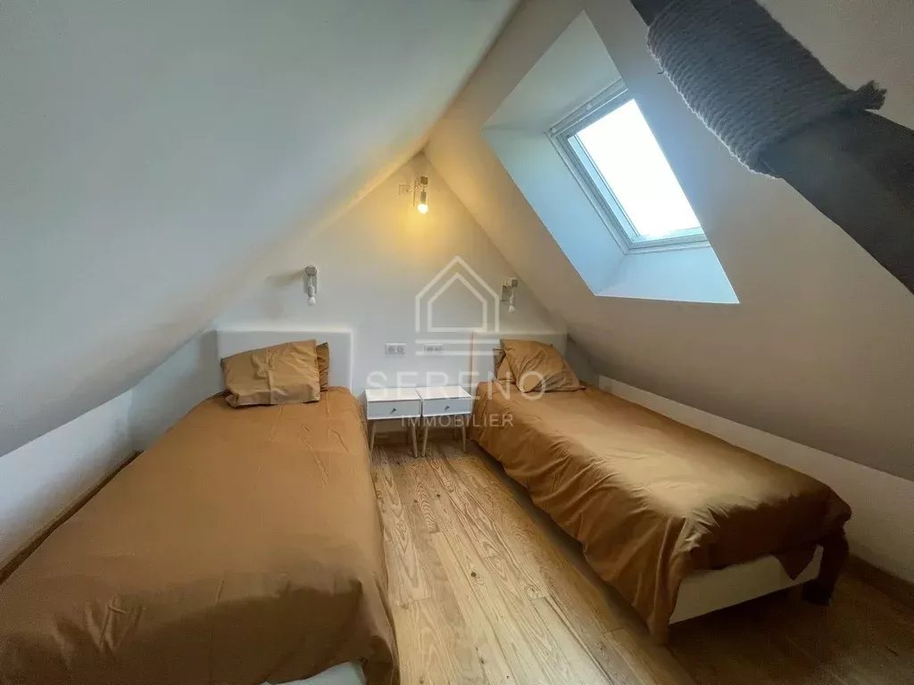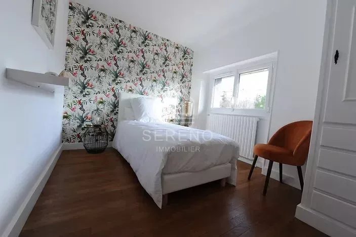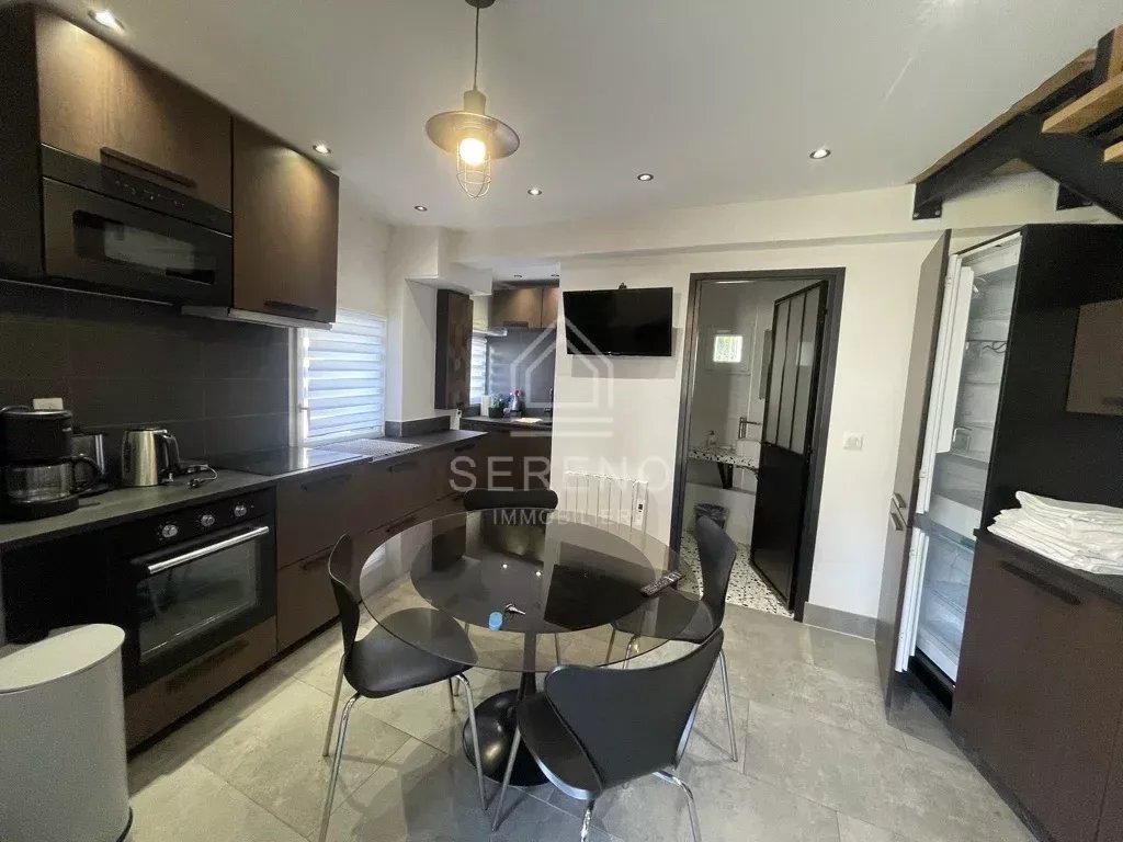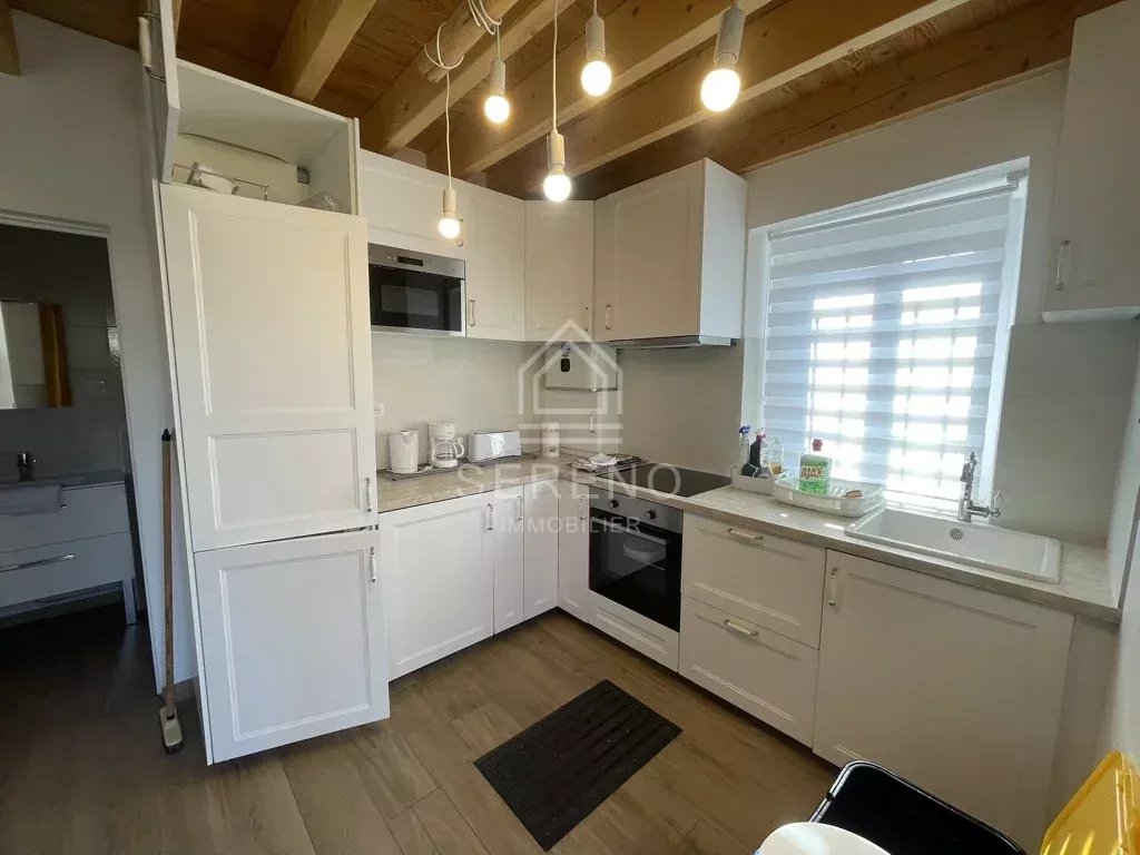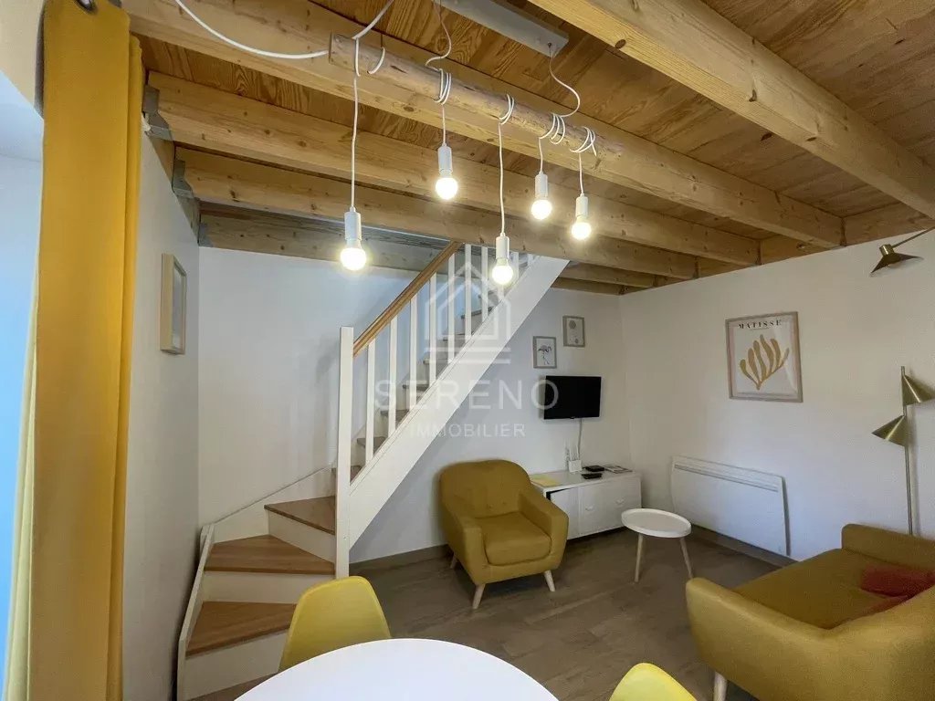 Seconde maison avec terrasse privative et jardinet, comportant séjour avec cuisine aménagée et équipée, salle d’eau avec toilettes, à l’étage une grande chambre avec vaste baie vitrée sur jardin, placards.
