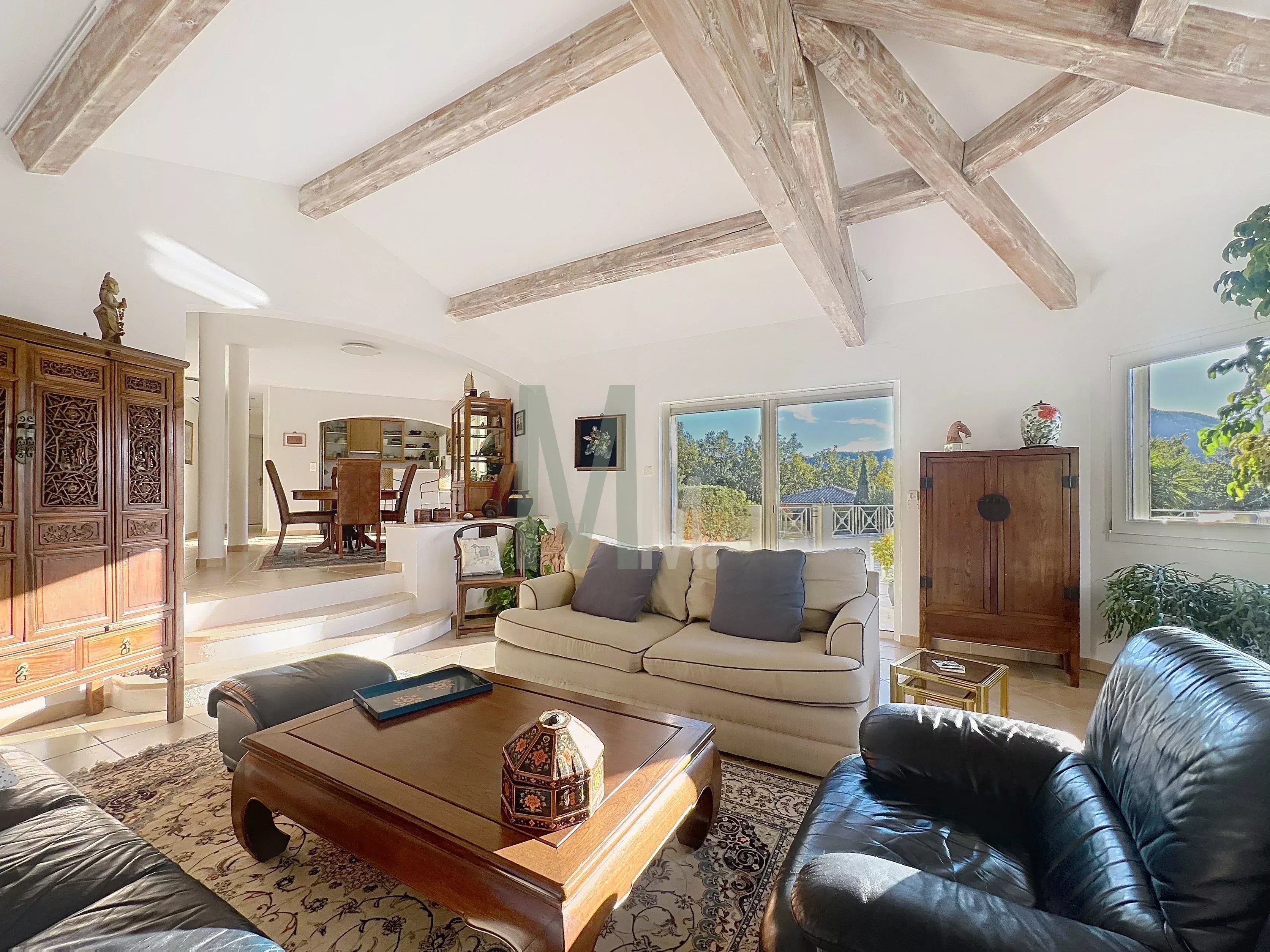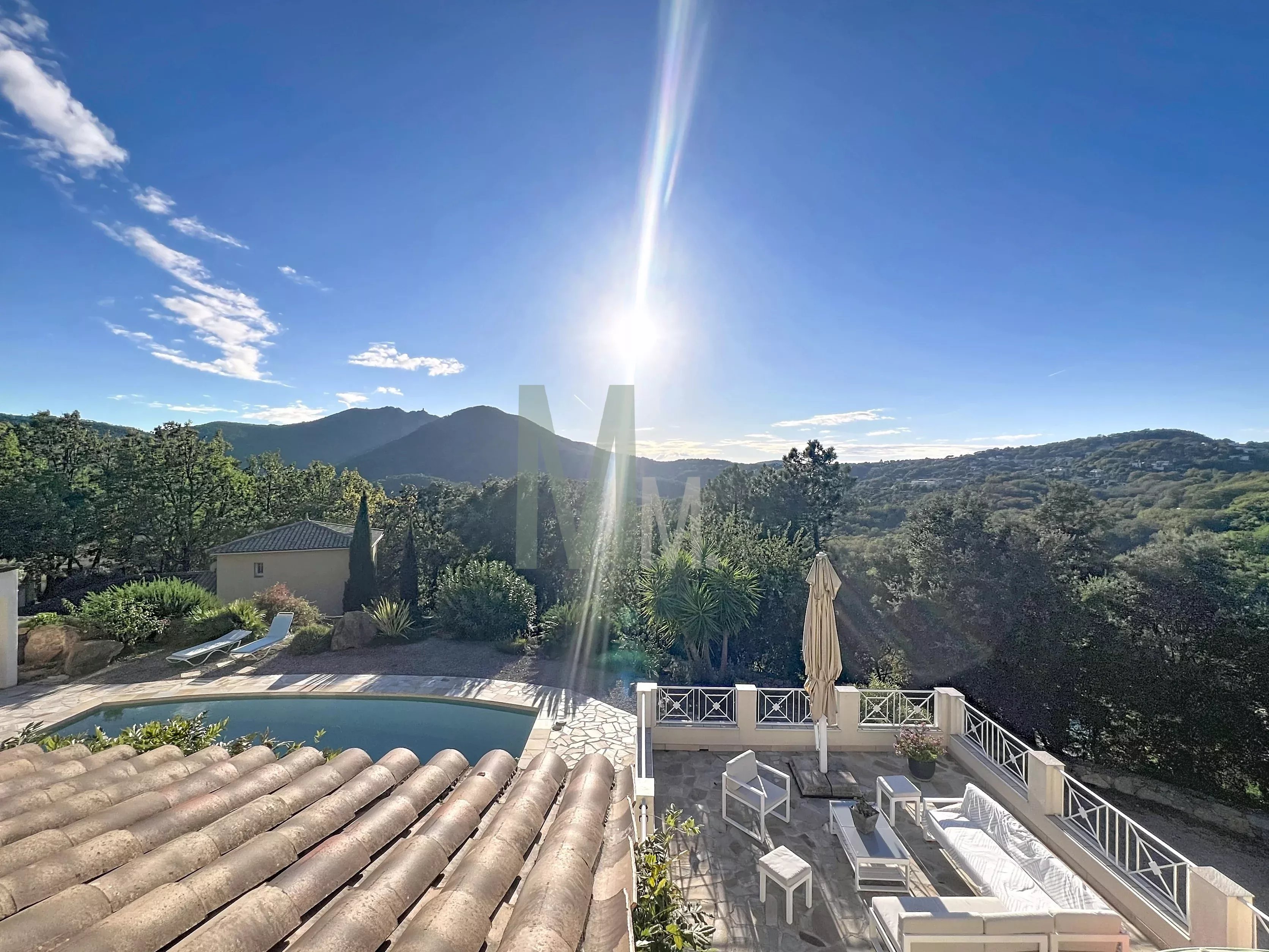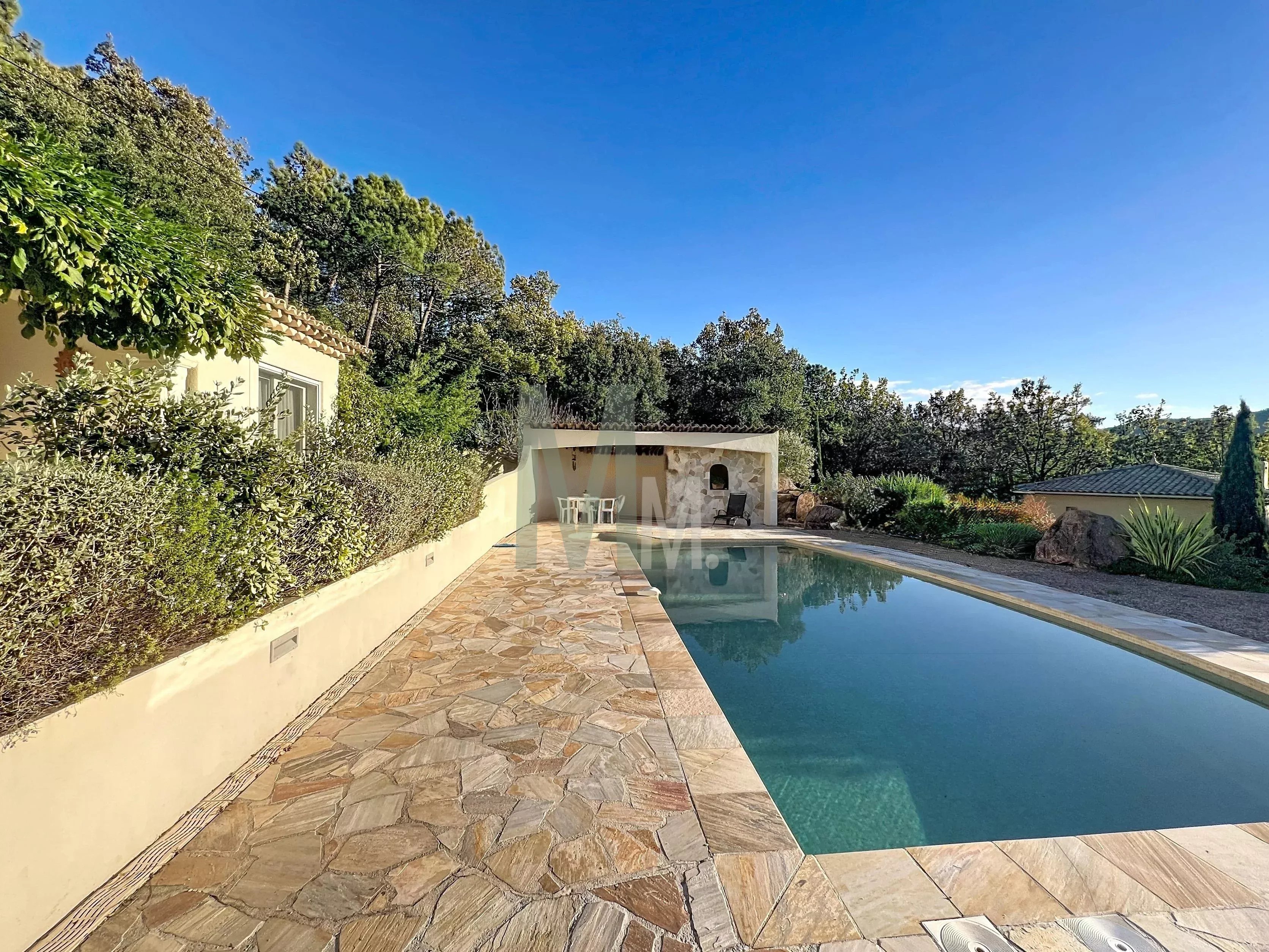Dans un environnement calme et verdoyant, tout en restant à proximité des accès, découvrez cette élégante villa de 200 m² habitables, parfaitement entretenue, offrant une vue panoramique sur l’Estérel. Implantée sur un terrain de 1 500 m², la propriété s’organise sur trois niveaux. Le rez-de-chaussée, de plain-pied, accueille les espaces de vie : une cuisine ouverte sur la salle à manger, un vaste salon lumineux avec cheminée, un bureau, un WC indépendant, ainsi qu’une chambre avec placard et une salle d’eau équipée d’une douche et d’une baignoire. À l’étage, deux chambres avec rangements, une salle de douche et un WC indépendant complètent l’espace nuit. Le rez-de-jardin propose une grande chambre avec salle de douche et WC, pouvant être aménagée en studio indépendant. Une salle de sport, un cellier, une cave à vin, ainsi qu’un spacieux garage permettant d'accueillir deux véhicules et l’ensemble du matériel nécessaire à l’entretien de la propriété, sans oublier le local technique de la piscine. À l’extérieur, la propriété offre une belle piscine avec son pool house, plus de 100 m² de terrasses idéales pour recevoir, ainsi qu’un vaste espace de stationnement. Une propriété idéale pour recevoir en toute sérénité. Contactez l'agence Maison Macéli pour découvrir la villa sans tarder.