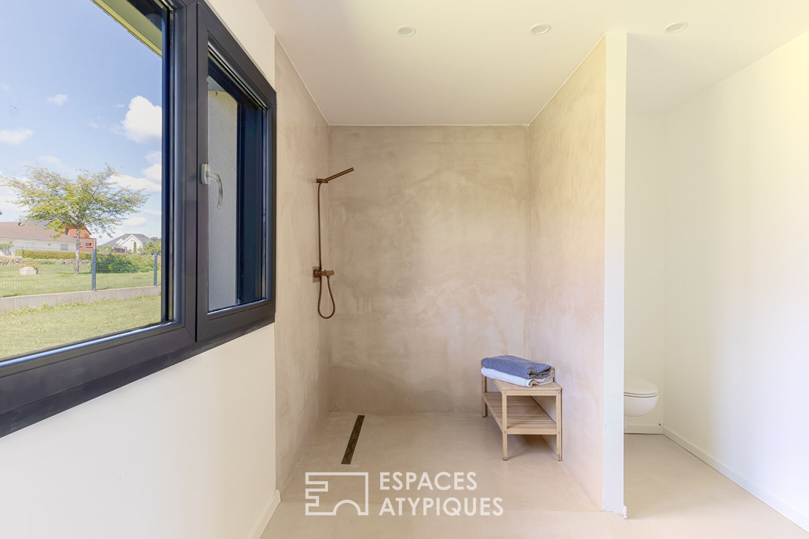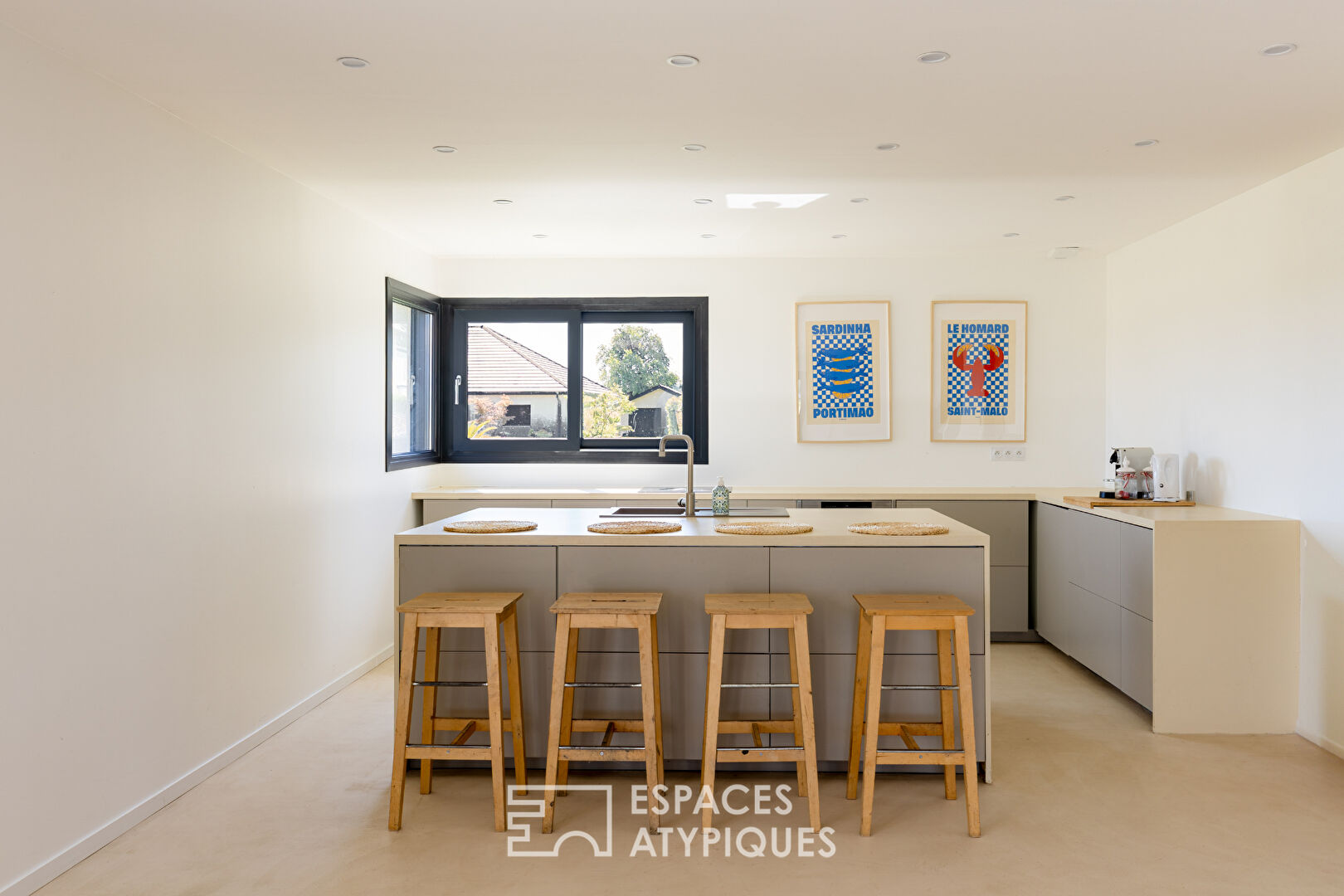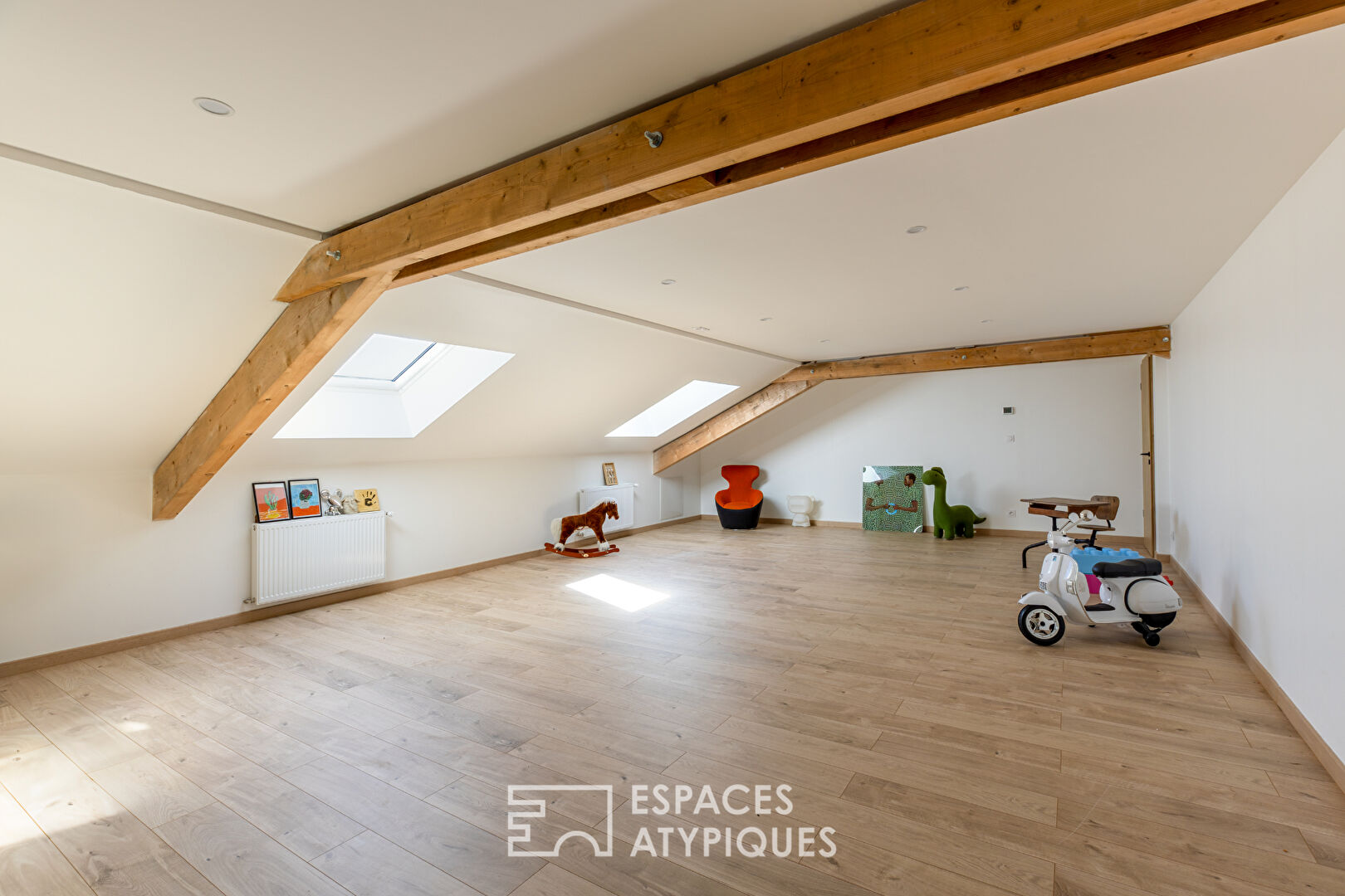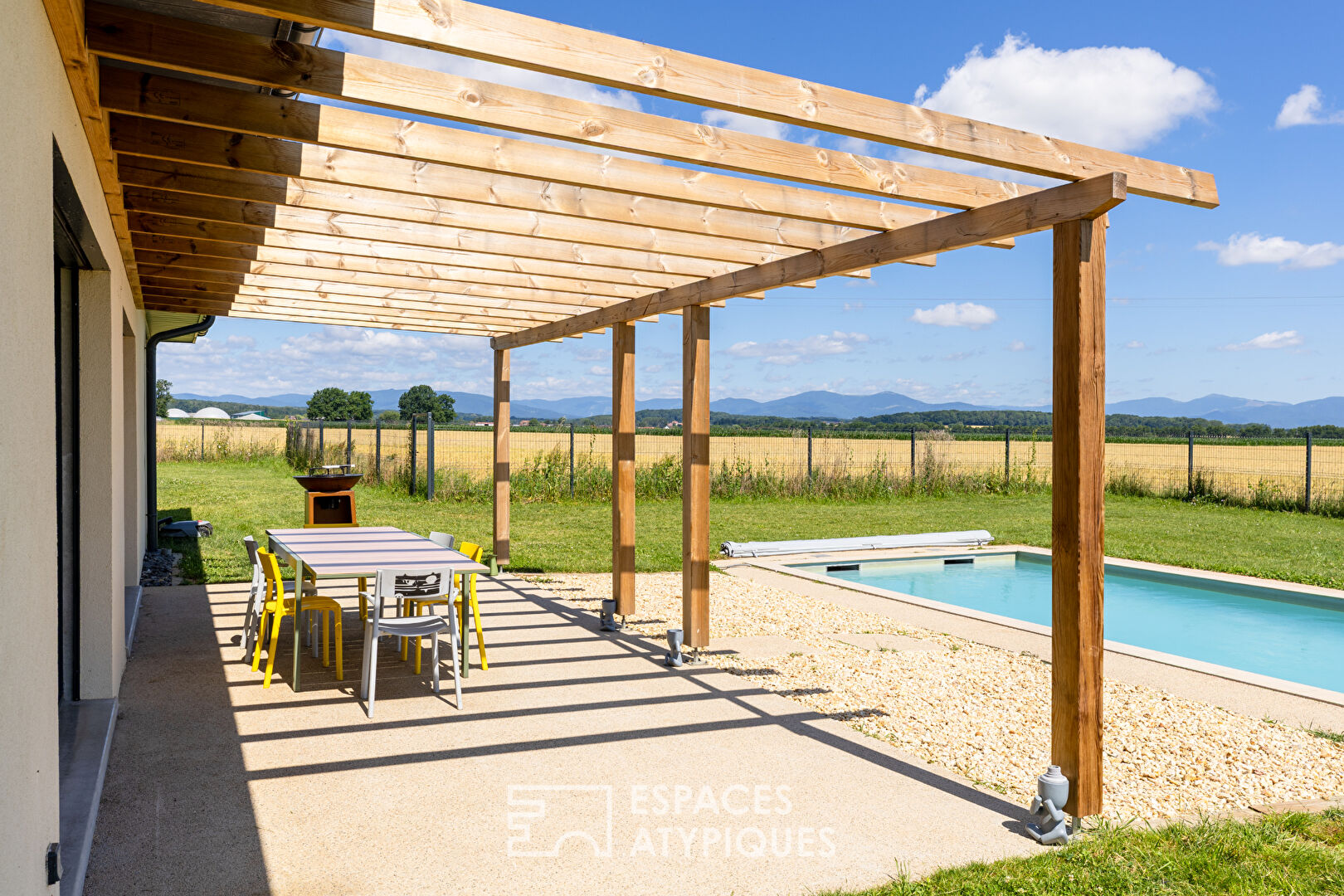 Située à la lisière d'une zone champêtre avec vue sur les Vosges, cette maison contemporaine de 296 m² séduit par ses volumes généreux et son environnement privilégié. Son agencement permet une véritable vie de plain-pied, avec l'ensemble des pièces principales réunies au rez-de-chaussée. Récente et soigneusement conçue, elle associe lignes épurées, volumes ouverts et lumière naturelle. Le sol en béton ciré ainsi que la très belle cheminée suspendue soulignent son caractère résolument moderne, tandis que la grande pièce à vivre, ouverte sur l'extérieur par de larges baies vitrées, s'harmonise parfaitement avec la piscine et le jardin avec vue dégagée. L'entrée mène à un double séjour baigné de lumière, prolongé par une cuisine ouverte pensée pour les moments de partage. L'espace nuit comprend quatre chambres, dont une suite parentale avec double dressing et salle de bain privative. Une seconde salle de bain, ainsi qu'un dressing desservant deux chambres, apportent confort et praticité au quotidien. A l'étage, une vaste pièce ouverte offre un espace modulable, idéal pour un bureau, une salle de jeux ou un espace détente. Côté fonctionnalité, un double garage avec accès direct à la buanderie, deux terrasses et une cour prolongent le confort de vie au quotidien. Son emplacement offre un parfait équilibre entre cadre paisible et proximité des services, pour une vie confortable au quotidien. CLASSE ENERGIE : A / CLASSE CLIMAT : A Montant moyen estimé des dépenses annuelles d'énergie pour un usage standard, établi à partir des prix moyens des énergies indexés sur les années 2021, 2022, 2023 (abonnements compris) : entre 1 170 et 1 650 euros Contact : Morgane 06.08.52.12.02 Morgane SCHLATTER (EI) Agent Commercial - Numéro RSAC : 930539382 - MULHOUSE.