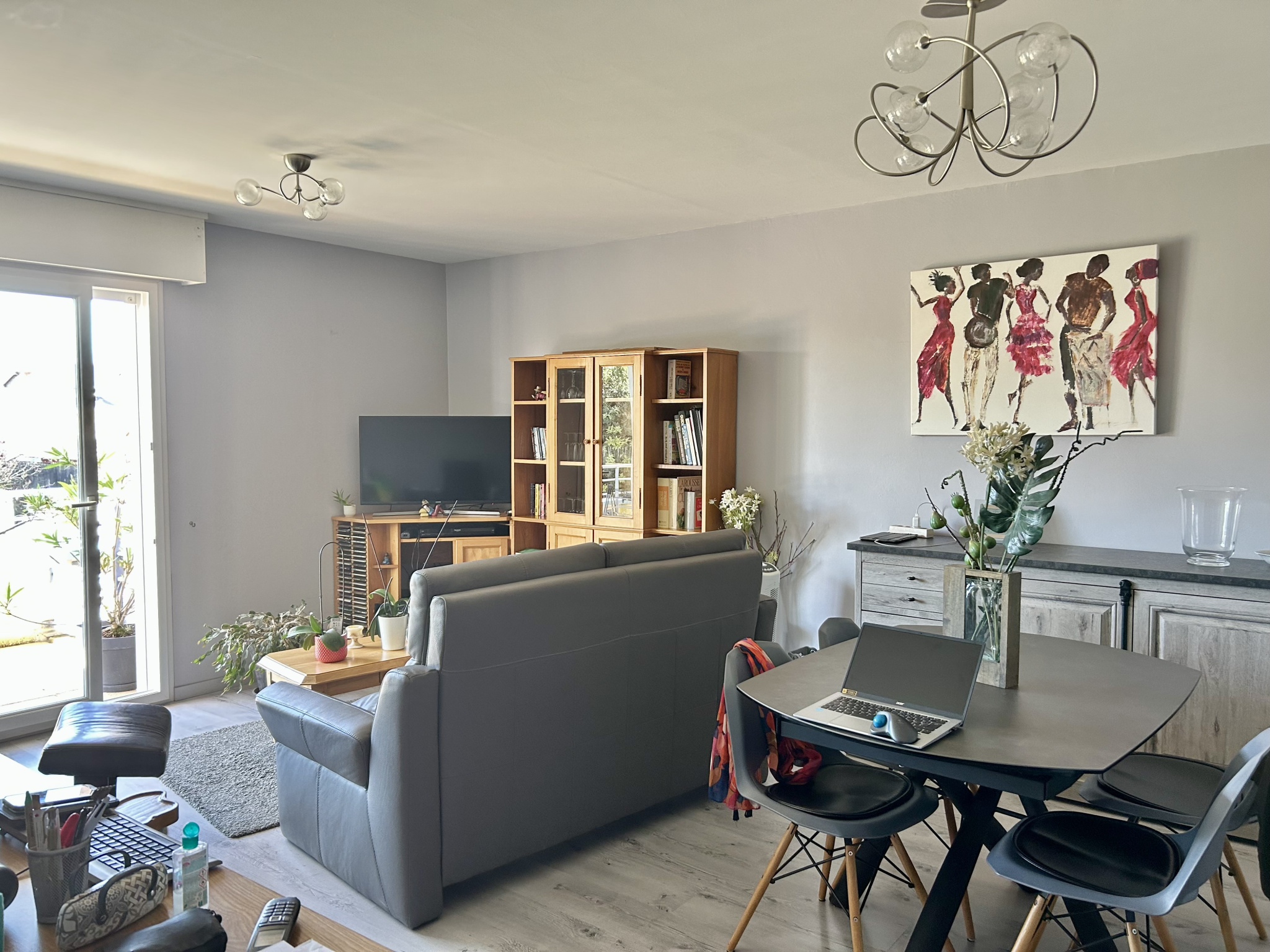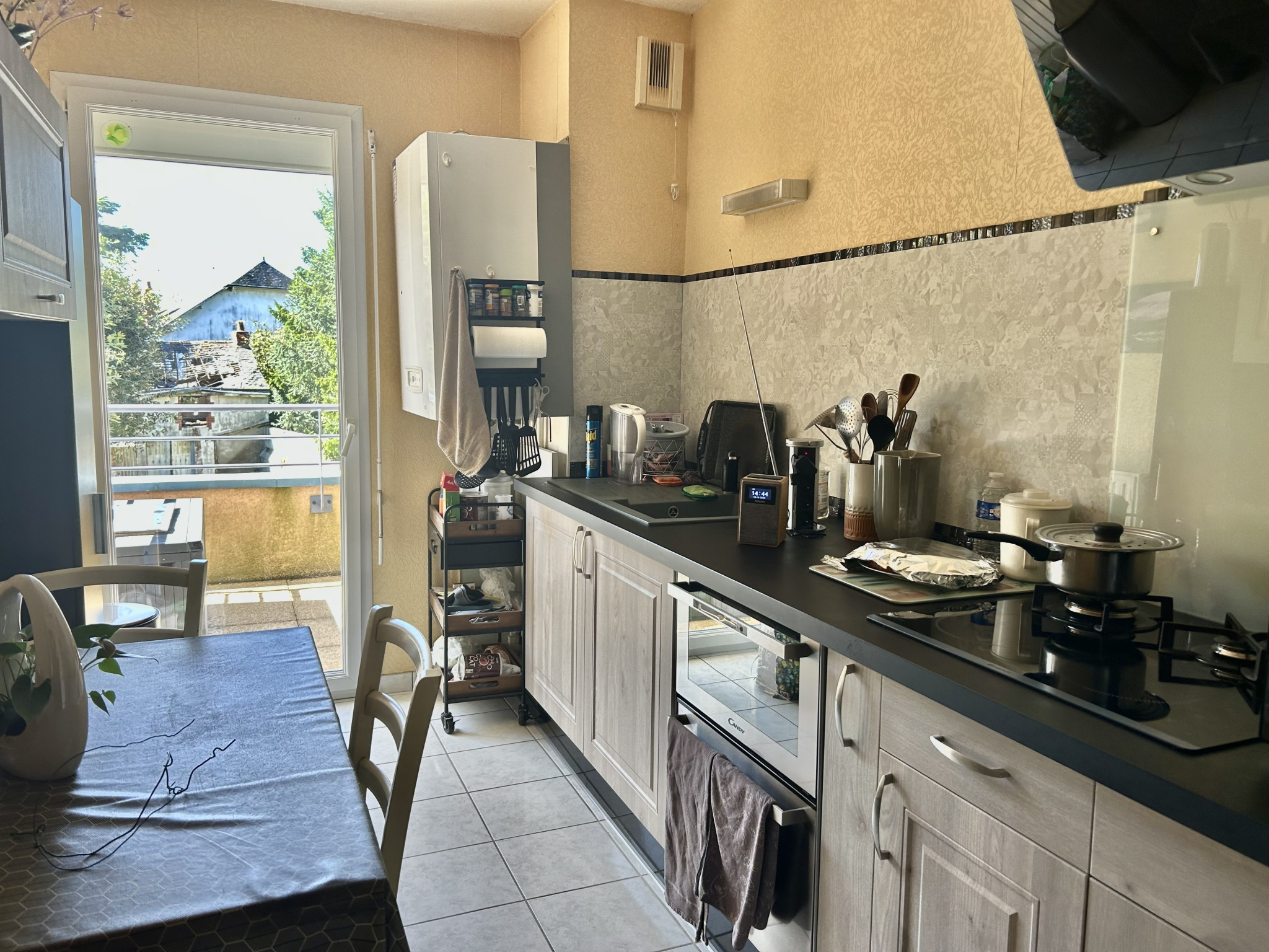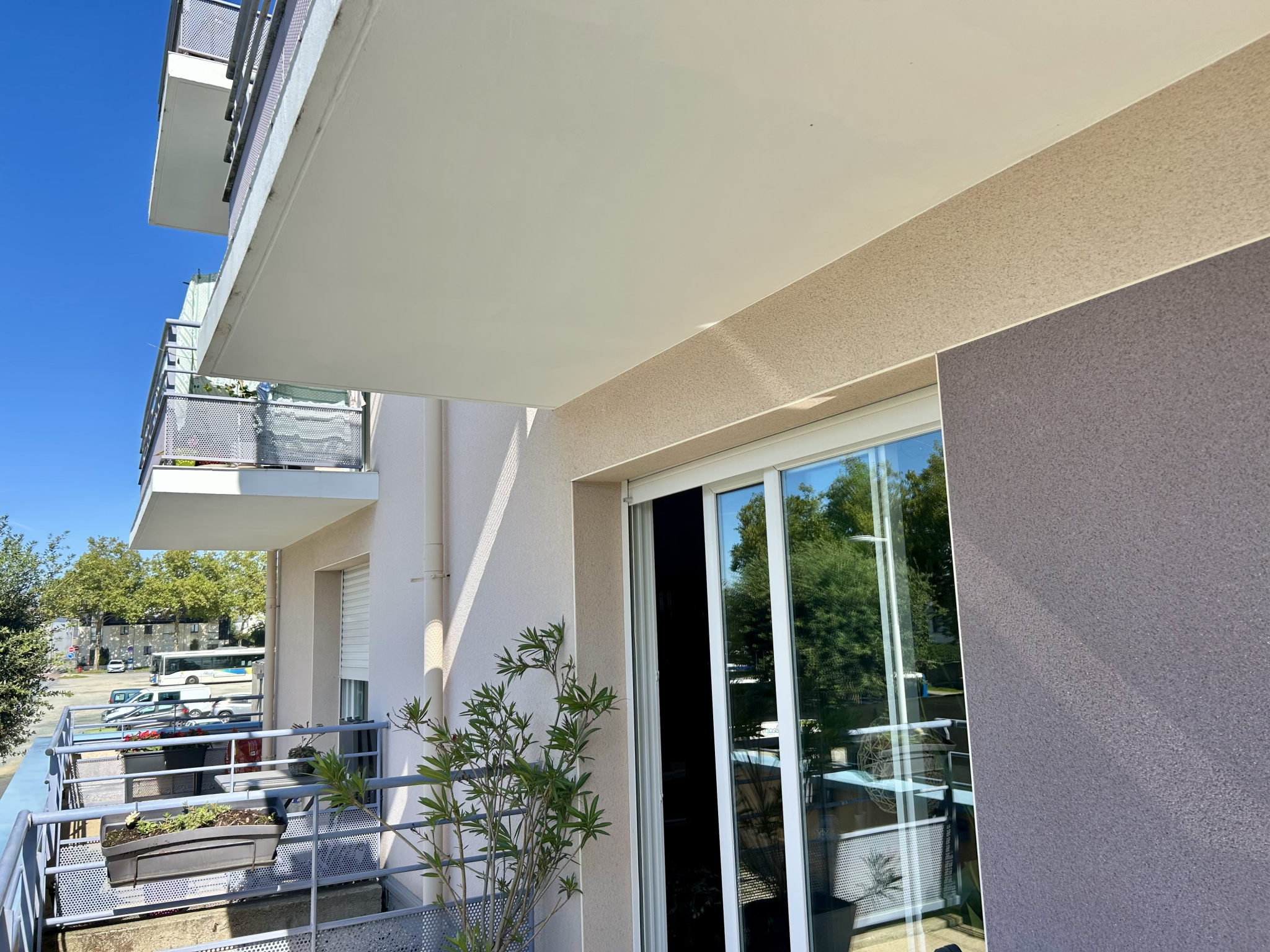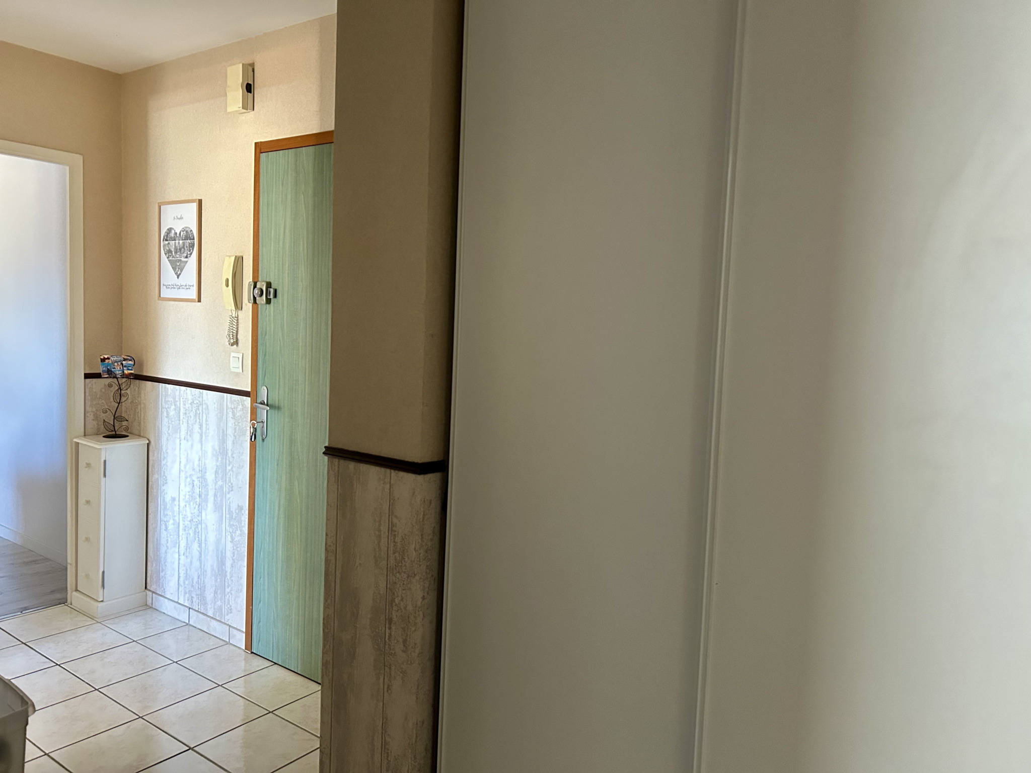 Appartement d'environ 65 m2 situé au 1e étage avec ascenceur comprenant une entrée avec placard coulissant, un salon lumineux de 25 m2 et deux baies vitrées donnant sur un grand balcon de 19 m2, ainsi qu'une cuisine de 9 m2 équipée (four, lave-vaisselle, hotte et plaques de cuisson, sans garantie du propriétaire).
