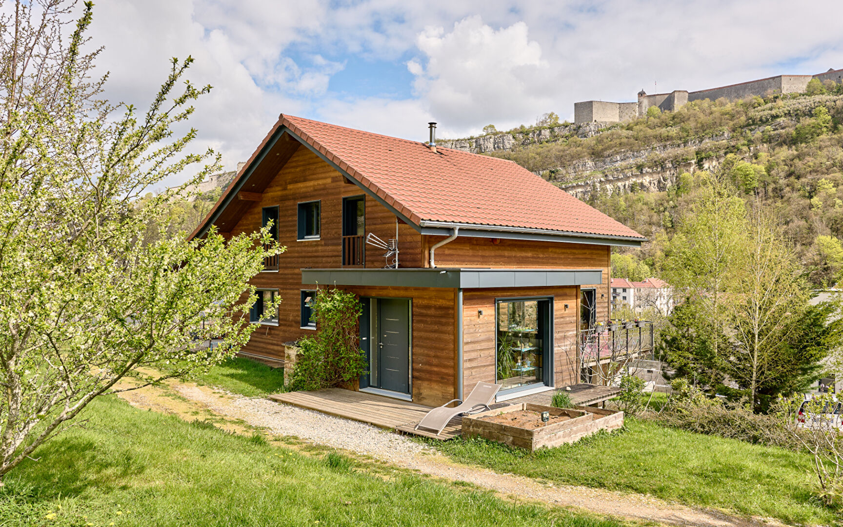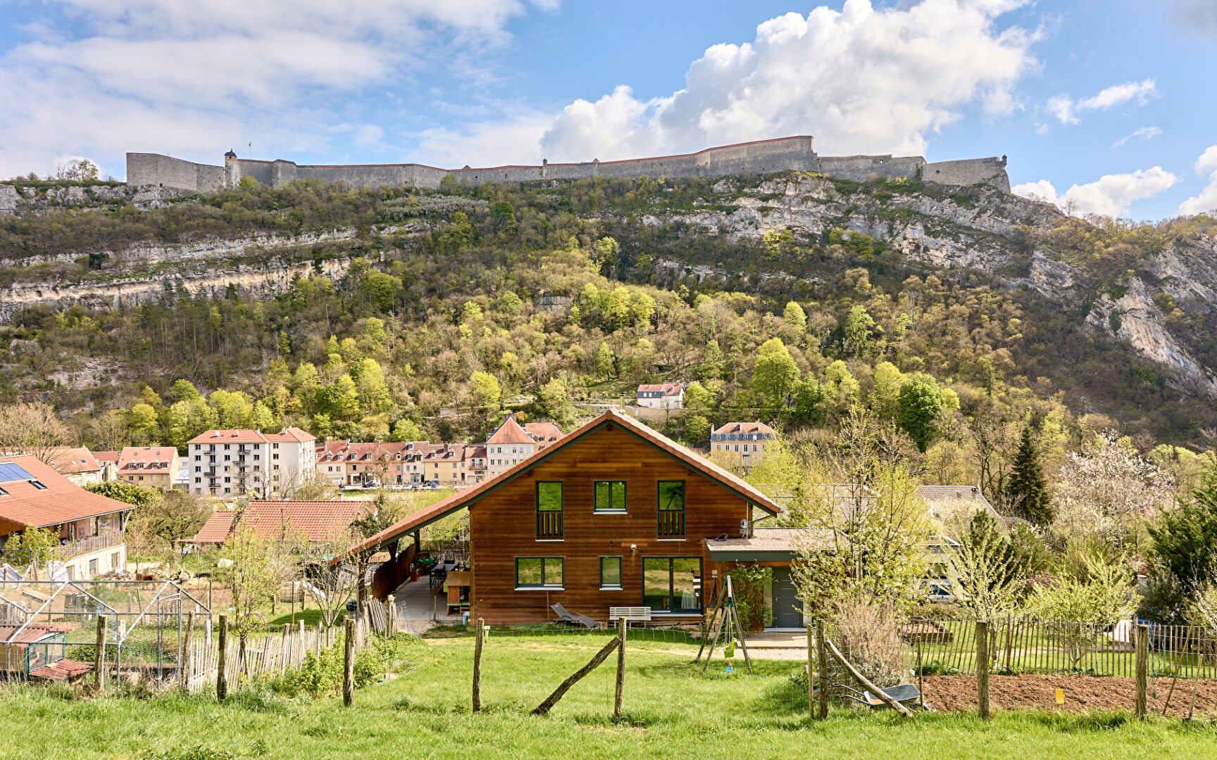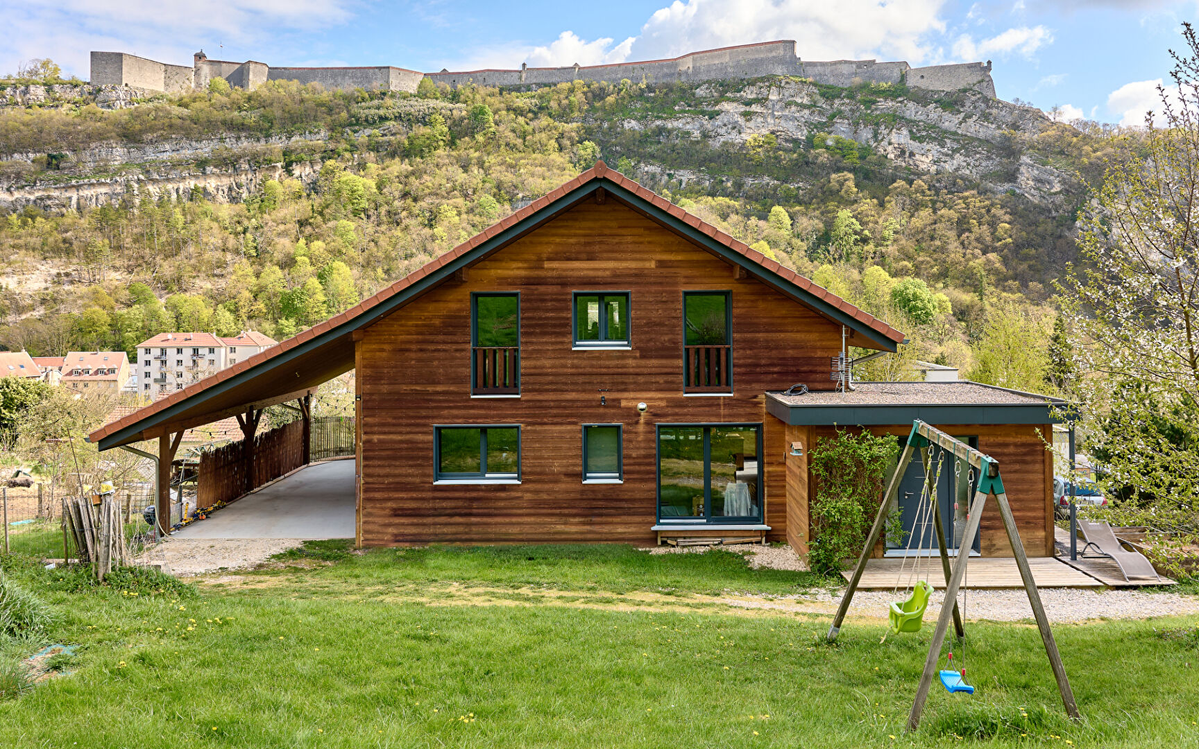 Maison contemporaine en bois à besançon A Besançon, dans le quartier de Velotte, cette maison en bois s'inscrit face à la Citadelle, au pied de Chaudanne. La ville se perçoit à distance, entre reliefs, végétation et lignes qui se prolongent dans le paysage. En bordure immédiate de forêt, elle déploie 181 m² habitables sur un terrain arboré, où la végétation compose un écrin naturel et préserve une sensation d'espace. La lumière traverse les volumes avec douceur, révélant une continuité fluide entre intérieur et extérieur. UNE PRÉSENCE DISCRÈTE AU-DESSUS DE LA VILLE La maison s'installe dans le quartier prisé de Mazagran, en contrebas du fort de Chaudanne, dans cette partie de Velotte où l'on prend rapidement de la hauteur. En quelques minutes le centre de Besançon reste accessible et pourtant, en arrivant, l'atmosphère bascule. Le rythme ralentit, les sons s'atténuent, le paysage reprend sa place. Depuis les pièces de vie, la Citadelle s'inscrit dans l'axe, visible au quotidien. La maison profite d'une position dominante, en bordure de forêt, avec le Doubs et le chemin de Mazagran en contrebas. Sortir marcher directement depuis chez soi, longer les chemins, s'échapper quelques instants sans prendre la voiture. Le quartier résidentiel, habité, avec une présence discrète de voisinage structure sans contraindre. L'ensemble compose un équilibre entre vie citadine et environnement naturel, une manière d'habiter Besançon avec plus d'espace et de respiration. UNE MAISON QUI S'ADAPTE AUX RYTHMES DE VIE Construite en 2018 en ossature bois, la maison développe une organisation claire sur deux niveaux. La pièce de vie s'articule autour d'un volume généreux, où séjour et cuisine ouverte partagent un même espace fluide, prolongé vers l'extérieur. La lumière circule toute la journée, portée par de larges ouvertures qui relient intérieur et jardin. La terrasse couverte devient un prolongement direct, utilisée aussi bien pour les repas que pour les moments plus informels. Le rez-de-chaussée accueille une chambre avec salle d'eau privative, permettant une vie de plain-pied ou l'accueil dans de bonnes conditions. A l'étage, trois chambres prennent place sous les volumes de toiture, accompagnées d'un espace ouvert qui se prête facilement au télétravail, à un coin lecture ou à un espace partagé. Le sous-sol complet structure également le quotidien. Il accueille les fonctions techniques et de rangement, tout en laissant la possibilité d'aménager un espace indépendant. Un bureau pour une activité libérale, un studio, une salle dédiée ou un espace de sport trouvent, avec un accès autonome déjà prévu. La maison s'adapte ainsi à différents rythmes de vie, entre habitation principale et activité à domicile. L'ensemble repose sur des choix durables : isolation en laine de bois, plancher chauffant, poêle de masse. Une base technique qui apporte un confort régulier et accompagne les saisons avec constance. UN JARDIN EN LIEN DIRECT AVEC LE PAYSAGE Le terrain, d'une surface généreuse, entoure la maison et suit la pente de manière douce. Une partie proche de la maison, facile à vivre au quotidien, et d'autres espaces plus ouverts, où le regard porte plus loin vers la végétation et la lisière de forêt. Le jardin est déjà structuré, avec des arbres en place, un verger, un espace potager, un rucher et un poulailler. La terrasse couverte, d'une surface confortable, devient un point central dès les beaux jours. Elle abrite sans isoler, permettant de profiter du jardin même lorsque la météo varie. Un balcon prolonge également certaines pièces, offrant une lecture plus lointaine du paysage. Certains espaces peuvent évoluer, accueillir une piscine en retrait, prolonger la maison ou structurer de nouveaux usages. La Citadelle de Besançon s'inscrit dans l'axe, visible au quotidien depuis le jardin, comme un repère calme qui accompagne les heures. En contrebas, le Doubs dessine ses courbes et structure le paysage, tandis que les reliefs enveloppent la ville. AVIS AGENCE Une maison récente et bien construite, pensée pour une vie de famille actuelle, où les usages s'articulent naturellement entre intérieur, extérieur et activité professionnelle, dans un environnement équilibré entre ville et nature.