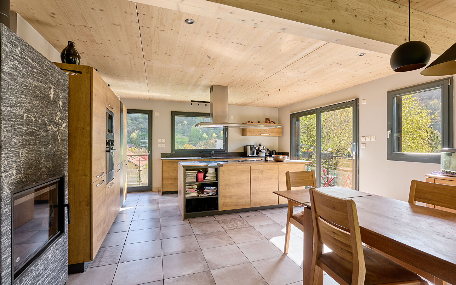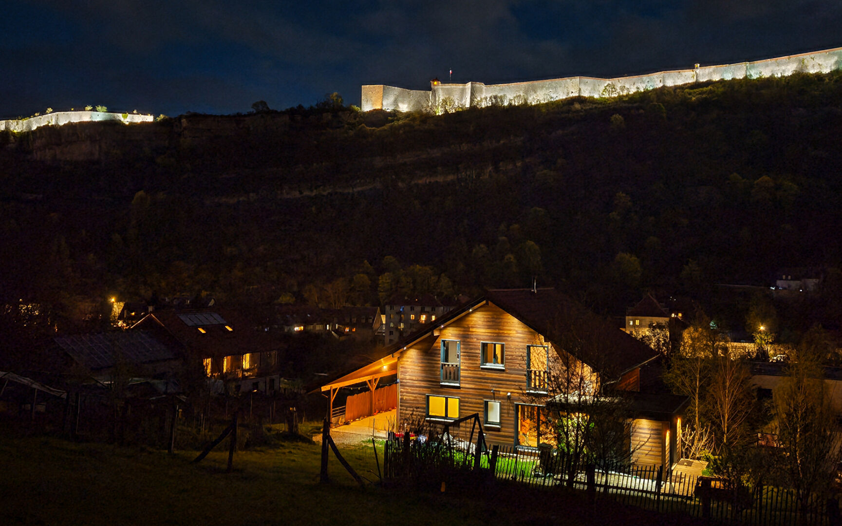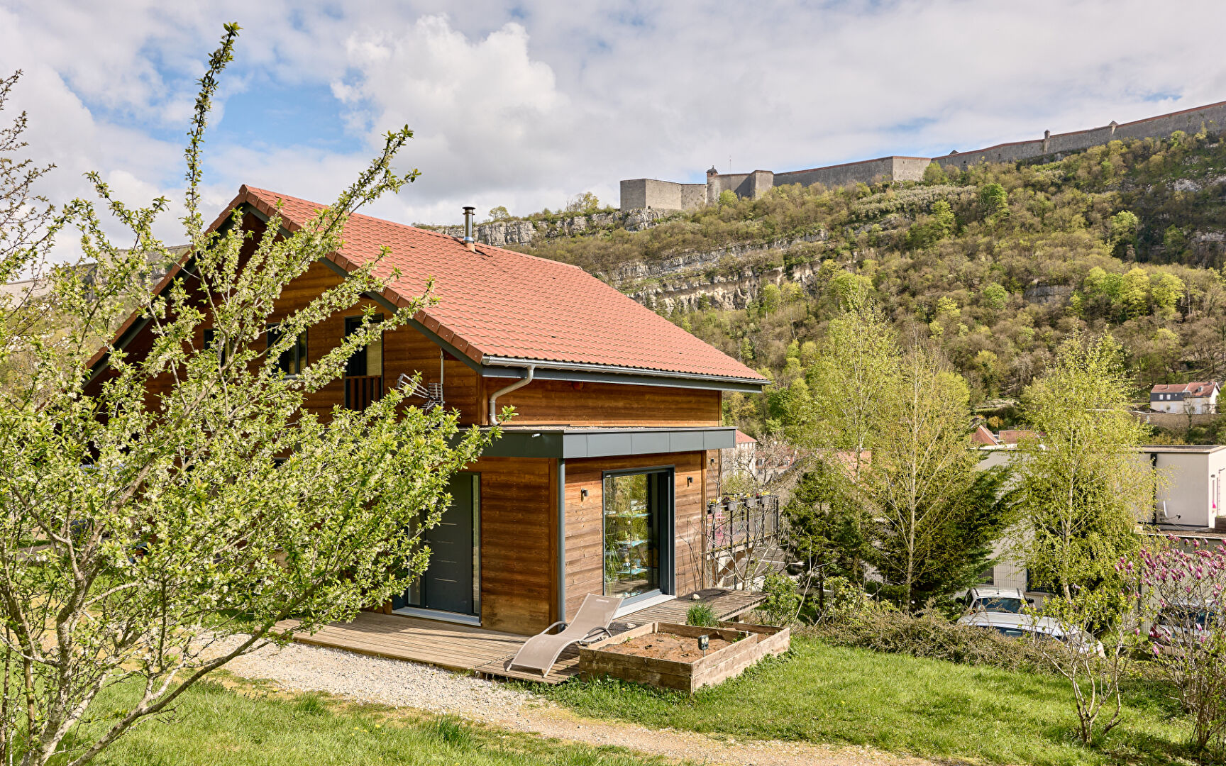 Maison contemporaine en bois à besançon A Besançon, dans le quartier de Velotte, cette maison en bois s'inscrit face à la Citadelle, au pied de Chaudanne. La ville se perçoit à distance, entre reliefs, végétation et lignes qui se prolongent dans le paysage. En bordure immédiate de forêt, elle déploie 181 m² habitables sur un terrain arboré, où la végétation compose un écrin naturel et préserve une sensation d'espace. La lumière traverse les volumes avec douceur, révélant une continuité fluide entre intérieur et extérieur. UNE PRÉSENCE DISCRÈTE AU-DESSUS DE LA VILLE La maison s'installe dans le quartier prisé de Mazagran, en contrebas du fort de Chaudanne, dans cette partie de Velotte où l'on prend rapidement de la hauteur. En quelques minutes le centre de Besançon reste accessible et pourtant, en arrivant, l'atmosphère bascule. Le rythme ralentit, les sons s'atténuent, le paysage reprend sa place. Depuis les pièces de vie, la Citadelle s'inscrit dans l'axe, visible au quotidien. La maison profite d'une position dominante, en bordure de forêt, avec le Doubs et le chemin de Mazagran en contrebas. Sortir marcher directement depuis chez soi, longer les chemins, s'échapper quelques instants sans prendre la voiture. Le quartier résidentiel, habité, avec une présence discrète de voisinage structure sans contraindre. L'ensemble compose un équilibre entre vie citadine et environnement naturel, une manière d'habiter Besançon avec plus d'espace et de respiration. UNE MAISON QUI S'ADAPTE AUX RYTHMES DE VIE Construite en 2018 en ossature bois, la maison développe une organisation claire sur deux niveaux. La pièce de vie s'articule autour d'un volume généreux, où séjour et cuisine ouverte partagent un même espace fluide, prolongé vers l'extérieur. La lumière circule toute la journée, portée par de larges ouvertures qui relient intérieur et jardin. La terrasse couverte devient un prolongement direct, utilisée aussi bien pour les repas que pour les moments plus informels. Le rez-de-chaussée accueille une chambre avec salle d'eau privative, permettant une vie de plain-pied ou l'accueil dans de bonnes conditions. A l'étage, trois chambres prennent place sous les volumes de toiture, accompagnées d'un espace ouvert qui se prête facilement au télétravail, à un coin lecture ou à un espace partagé. Le sous-sol complet structure également le quotidien. Il accueille les fonctions techniques et de rangement, tout en laissant la possibilité d'aménager un espace indépendant. Un bureau pour une activité libérale, un studio, une salle dédiée ou un espace de sport trouvent, avec un accès autonome déjà prévu. La maison s'adapte ainsi à différents rythmes de vie, entre habitation principale et activité à domicile. L'ensemble repose sur des choix durables : isolation en laine de bois, plancher chauffant, poêle de masse. Une base technique qui apporte un confort régulier et accompagne les saisons avec constance. UN JARDIN EN LIEN DIRECT AVEC LE PAYSAGE Le terrain, d'une surface généreuse, entoure la maison et suit la pente de manière douce. Une partie proche de la maison, facile à vivre au quotidien, et d'autres espaces plus ouverts, où le regard porte plus loin vers la végétation et la lisière de forêt. Le jardin est déjà structuré, avec des arbres en place, un verger, un espace potager, un rucher et un poulailler. La terrasse couverte, d'une surface confortable, devient un point central dès les beaux jours. Elle abrite sans isoler, permettant de profiter du jardin même lorsque la météo varie. Un balcon prolonge également certaines pièces, offrant une lecture plus lointaine du paysage. Certains espaces peuvent évoluer, accueillir une piscine en retrait, prolonger la maison ou structurer de nouveaux usages. La Citadelle de Besançon s'inscrit dans l'axe, visible au quotidien depuis le jardin, comme un repère calme qui accompagne les heures. En contrebas, le Doubs dessine ses courbes et structure le paysage, tandis que les reliefs enveloppent la ville. AVIS AGENCE Une maison récente et bien construite, pensée pour une vie de famille actuelle, où les usages s'articulent naturellement entre intérieur, extérieur et activité professionnelle, dans un environnement équilibré entre ville et nature.