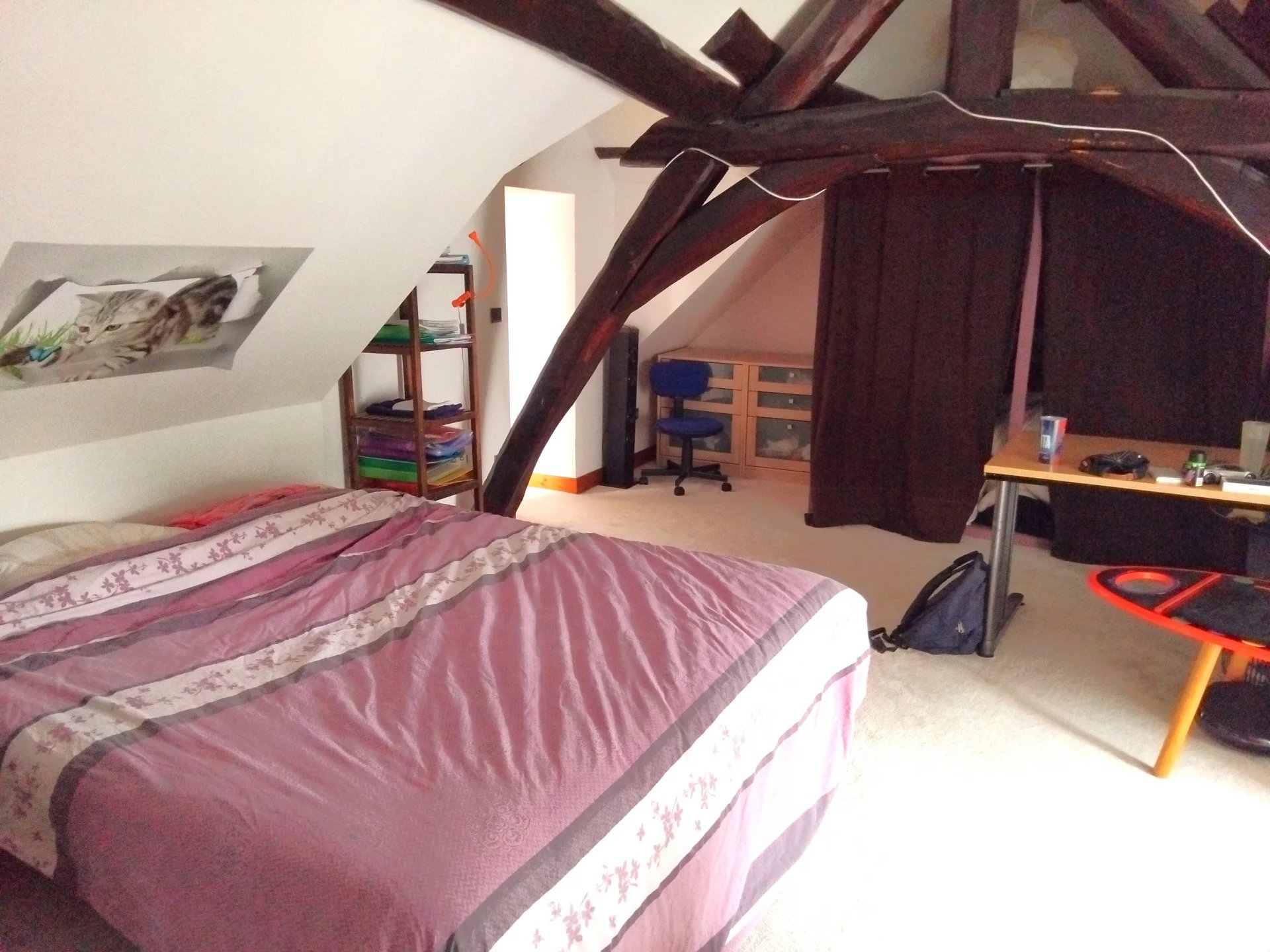 Elle se compose d'un grand salon, d'un cuisine séparée, de trois chambres, d'une mezzanine sur deux niveaux, d'un dortoir dans les combles et de deux salles d'eau. Pour la partie extérieure, vous verrez une agréable terrasse bien orientée et à l'abri des regards, un grand garage, un bureau, un appentis et une cave.