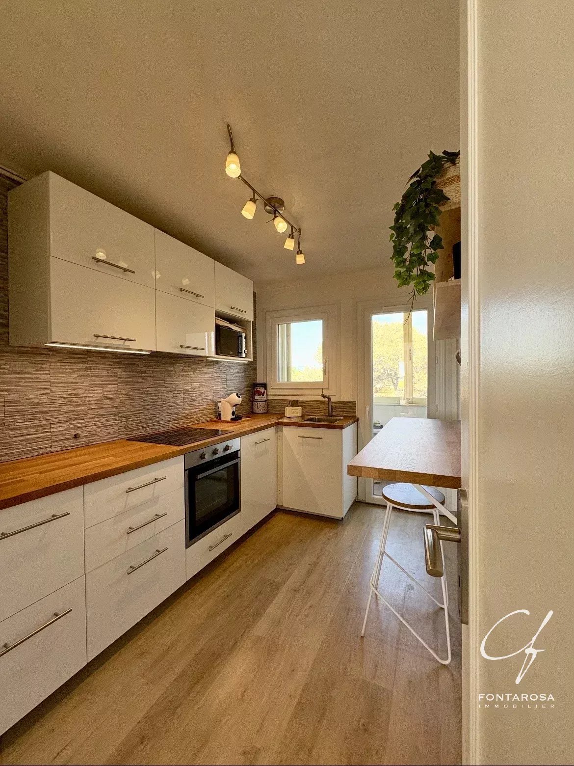 L’appartement se compose d’une cuisine aménagée et entièrement équipée, prolongée par une loggia aménagée en buanderie. Le séjour spacieux et baigné de lumière s’ouvre sur une belle terrasse avec vue dégagée, entourée de verdure, idéale pour profiter des beaux jours en toute tranquillité.