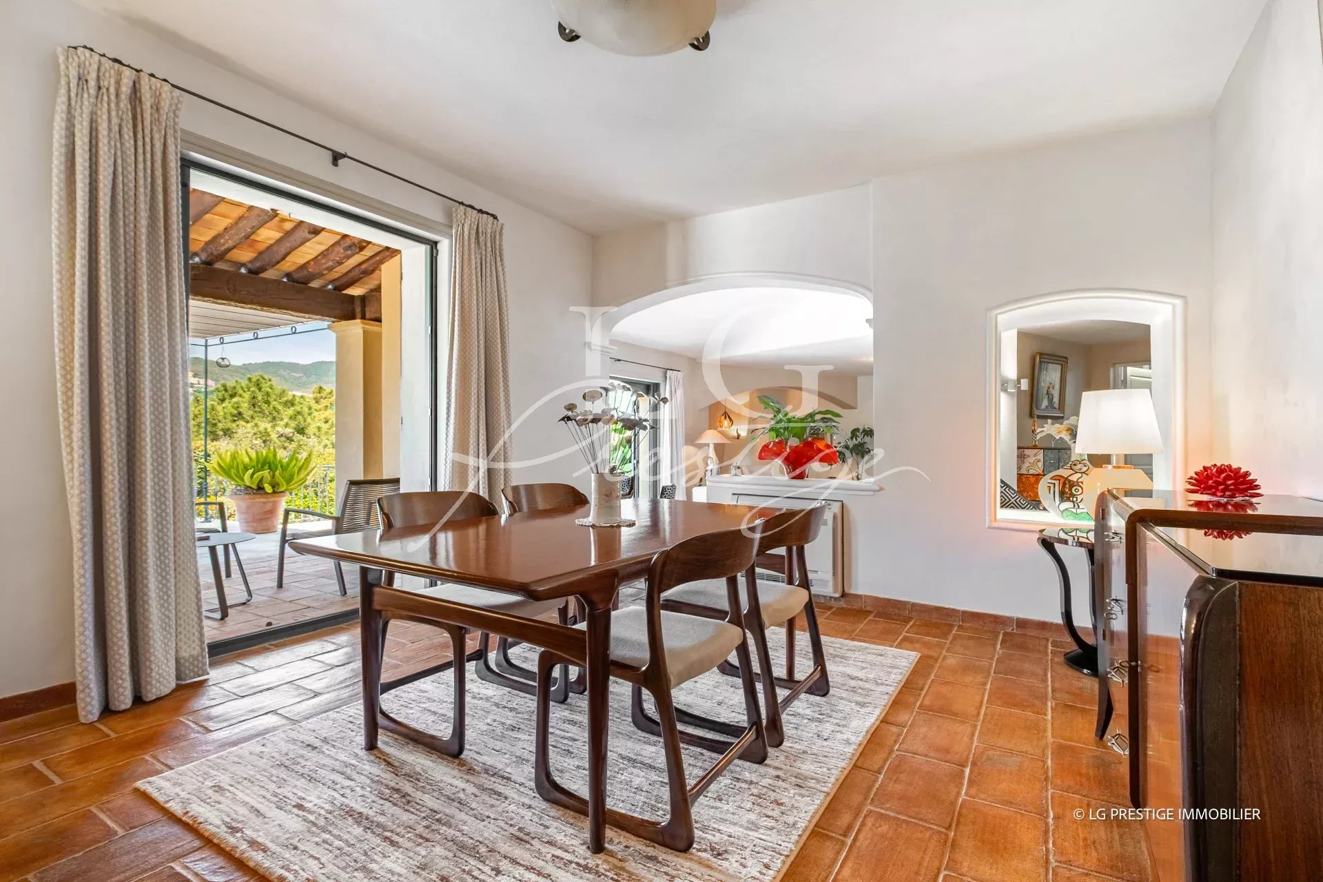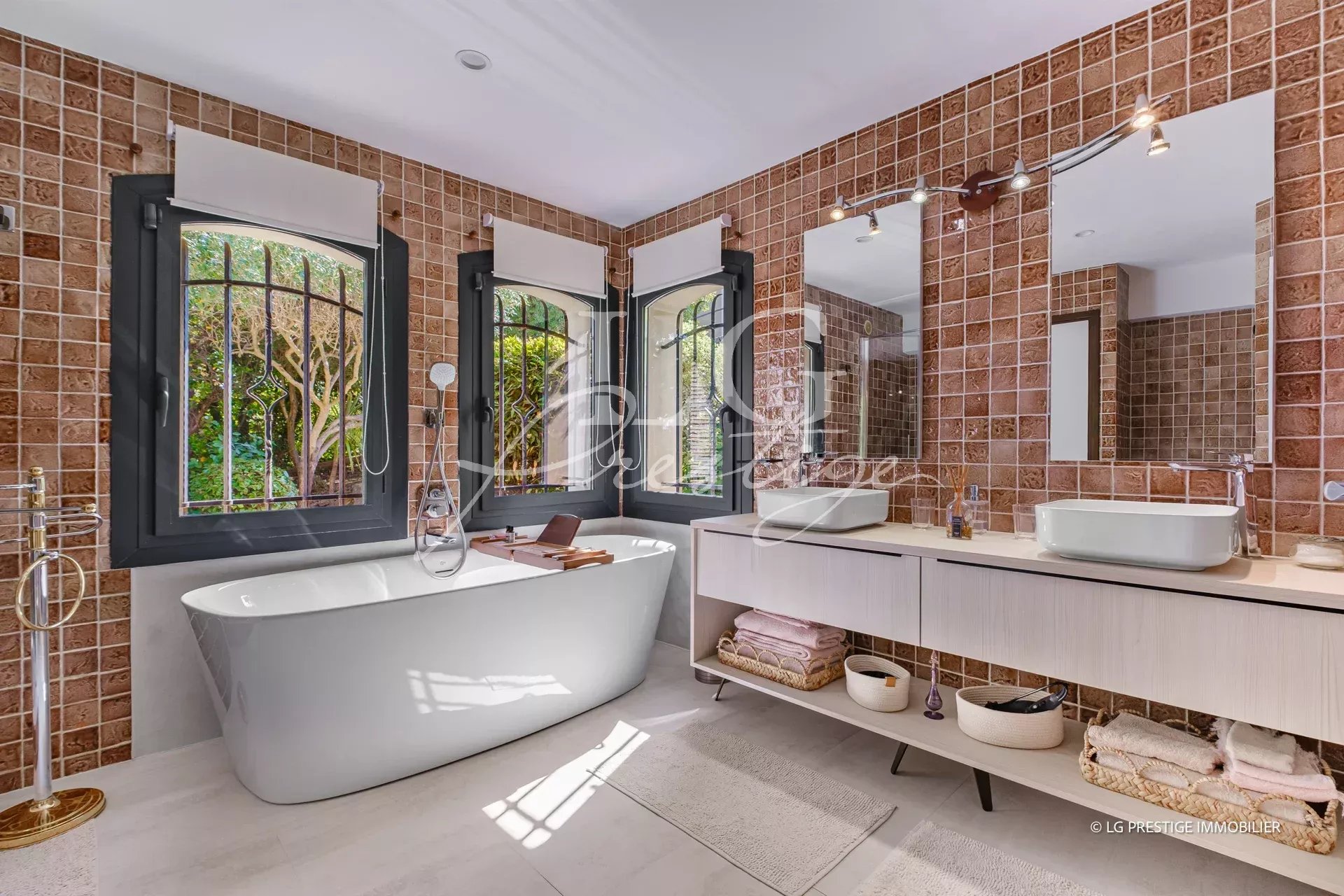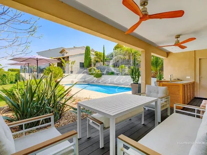 A MANDELIEU - DOMAINE DES VIGNERONS - Nichée au cœur du quartier résidentiel très recherché de Minelle, cette villa de style Méditerranéen provençal Chic, offre une vue panoramique sur le golf et le Massif de l'Estérel, elle se compose : séjour avec coin cheminée - salle à manger, cuisine entièrement équipée, 4 chambres et 3 salles de douches/bains accueillent famille et invités dans un confort absolu . Les espaces de vie, baignés de lumière, s’ouvrent sur de larges terrasses qui invitent à la détente et à la convivialité - Garage, local à vélos, pool house, piscine chauffée. Située au bout d’une impasse, elle bénéficie d’un calme absolu, sans vis-à-vis, et d’une luminosité exceptionnelle tout au long de la journée Récemment rénovée avec des matériaux nobles et des finitions raffinées, la maison allie un style Méditerranéen et atmosphère chaleureuse À l’extérieur, la grande piscine entièrement rénovée s’entoure d’une belle plage ensoleillée et d’un jardin paysager où règnent sérénité et intimité.