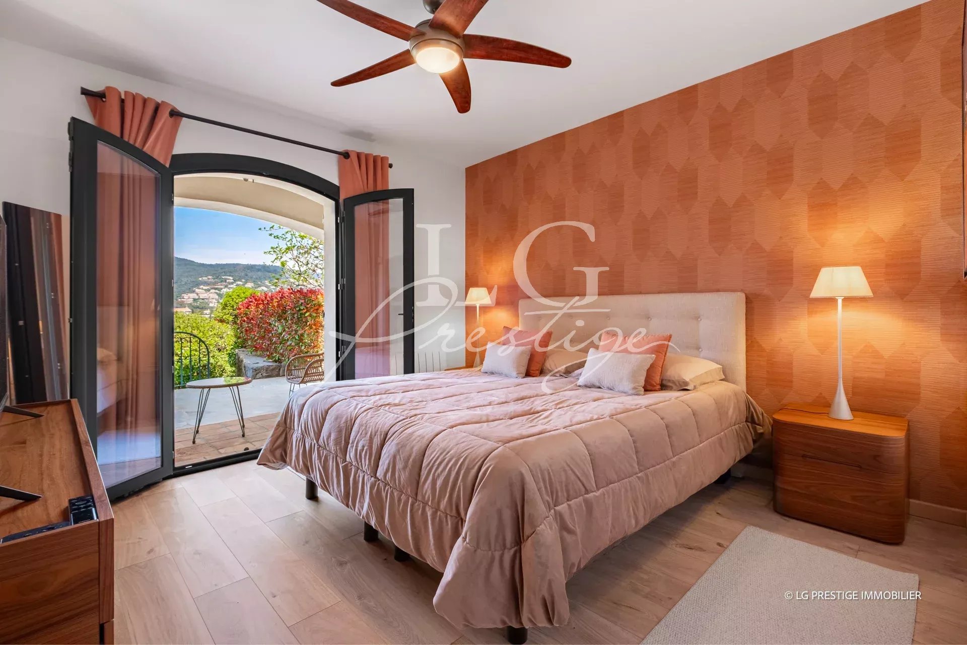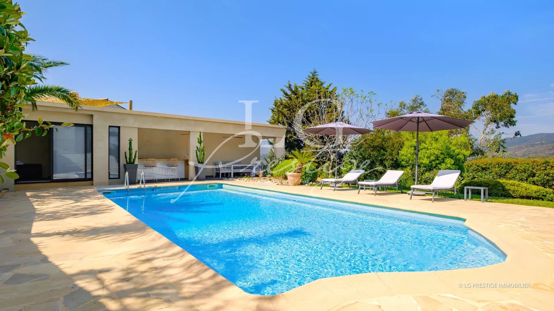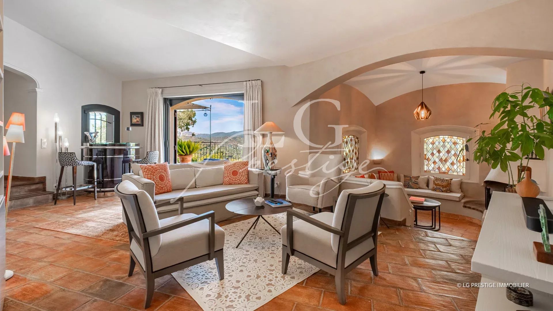 A MANDELIEU - DOMAINE DES VIGNERONS - Nichée au cœur du quartier résidentiel très recherché de Minelle, cette villa de style Méditerranéen provençal Chic, offre une vue panoramique sur le golf et le Massif de l'Estérel, elle se compose : séjour avec coin cheminée - salle à manger, cuisine entièrement équipée, 4 chambres et 3 salles de douches/bains accueillent famille et invités dans un confort absolu . Les espaces de vie, baignés de lumière, s’ouvrent sur de larges terrasses qui invitent à la détente et à la convivialité - Garage, local à vélos, pool house, piscine chauffée. Située au bout d’une impasse, elle bénéficie d’un calme absolu, sans vis-à-vis, et d’une luminosité exceptionnelle tout au long de la journée Récemment rénovée avec des matériaux nobles et des finitions raffinées, la maison allie un style Méditerranéen et atmosphère chaleureuse À l’extérieur, la grande piscine entièrement rénovée s’entoure d’une belle plage ensoleillée et d’un jardin paysager où règnent sérénité et intimité.