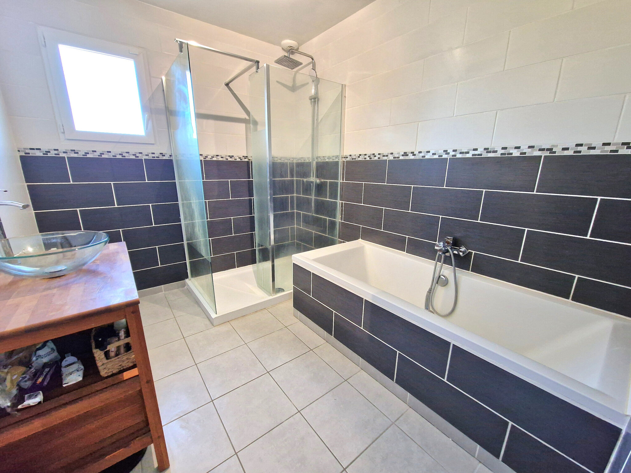 Cette habitation se compose, au rez-de-chaussée, d'une entrée ouvrant sur un vaste espace de vie lumineux comprenant un séjour avec cuisine ouverte, entièrement aménagée et équipée, pour une surface totale de 47 m². Un couloir dessert ensuite trois chambres, un WC indépendant ainsi qu'une salle de bains équipée d'une baignoire, d'une douche et d'une vasque.