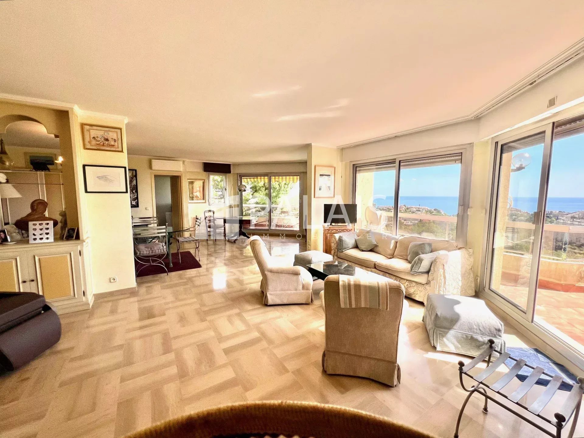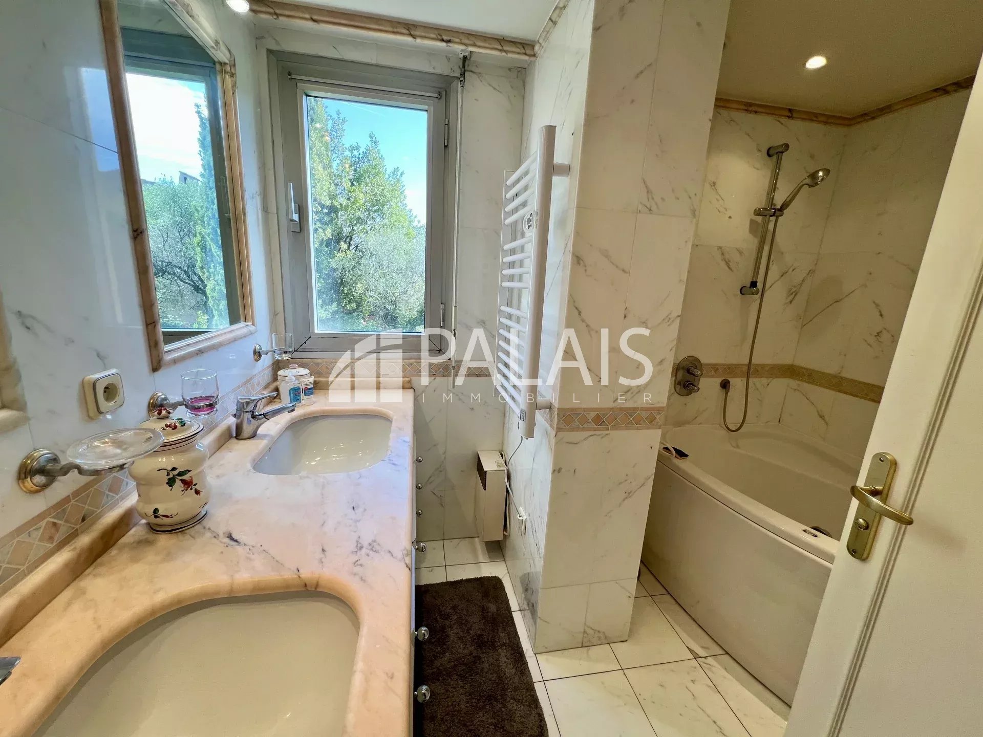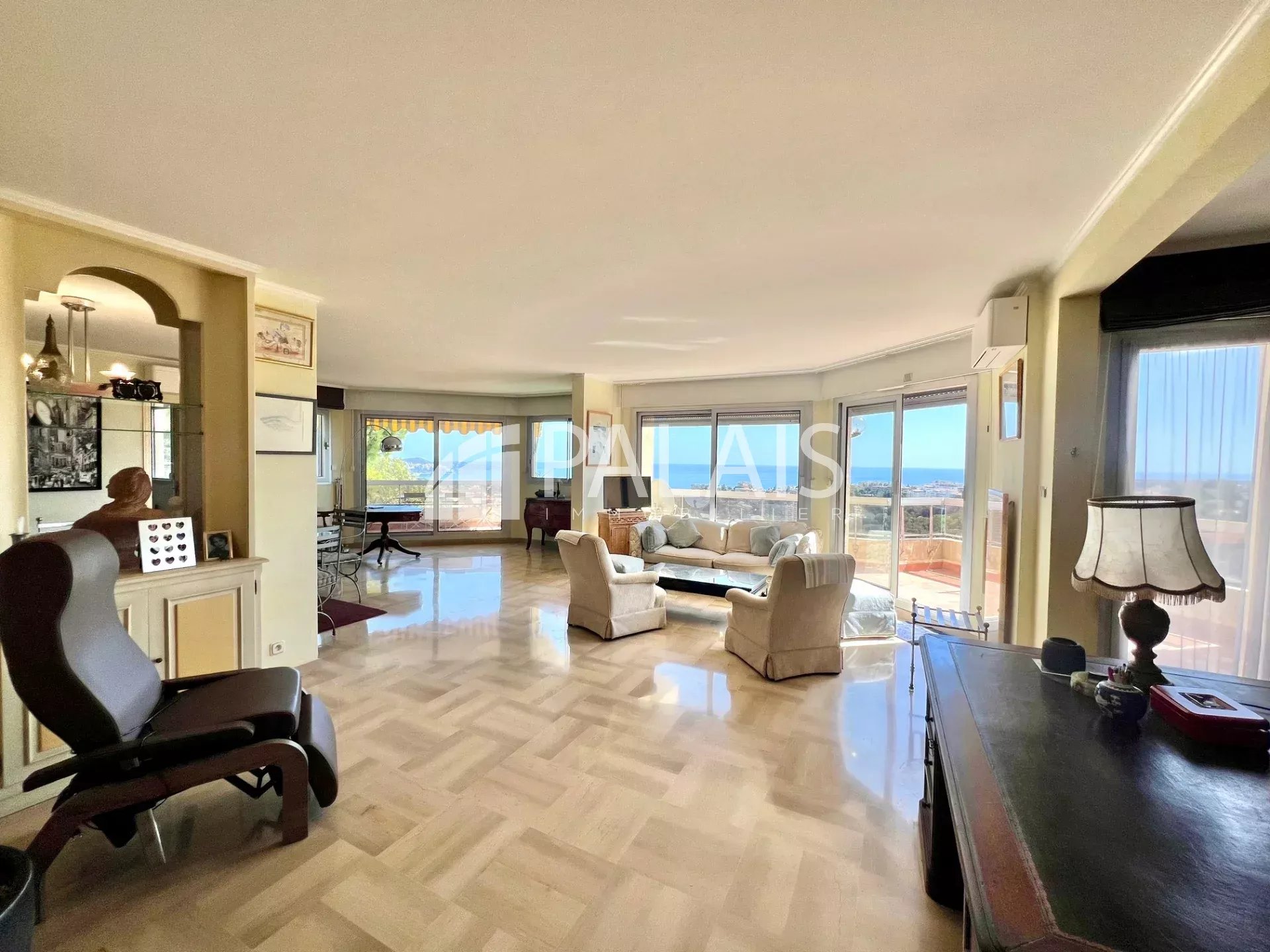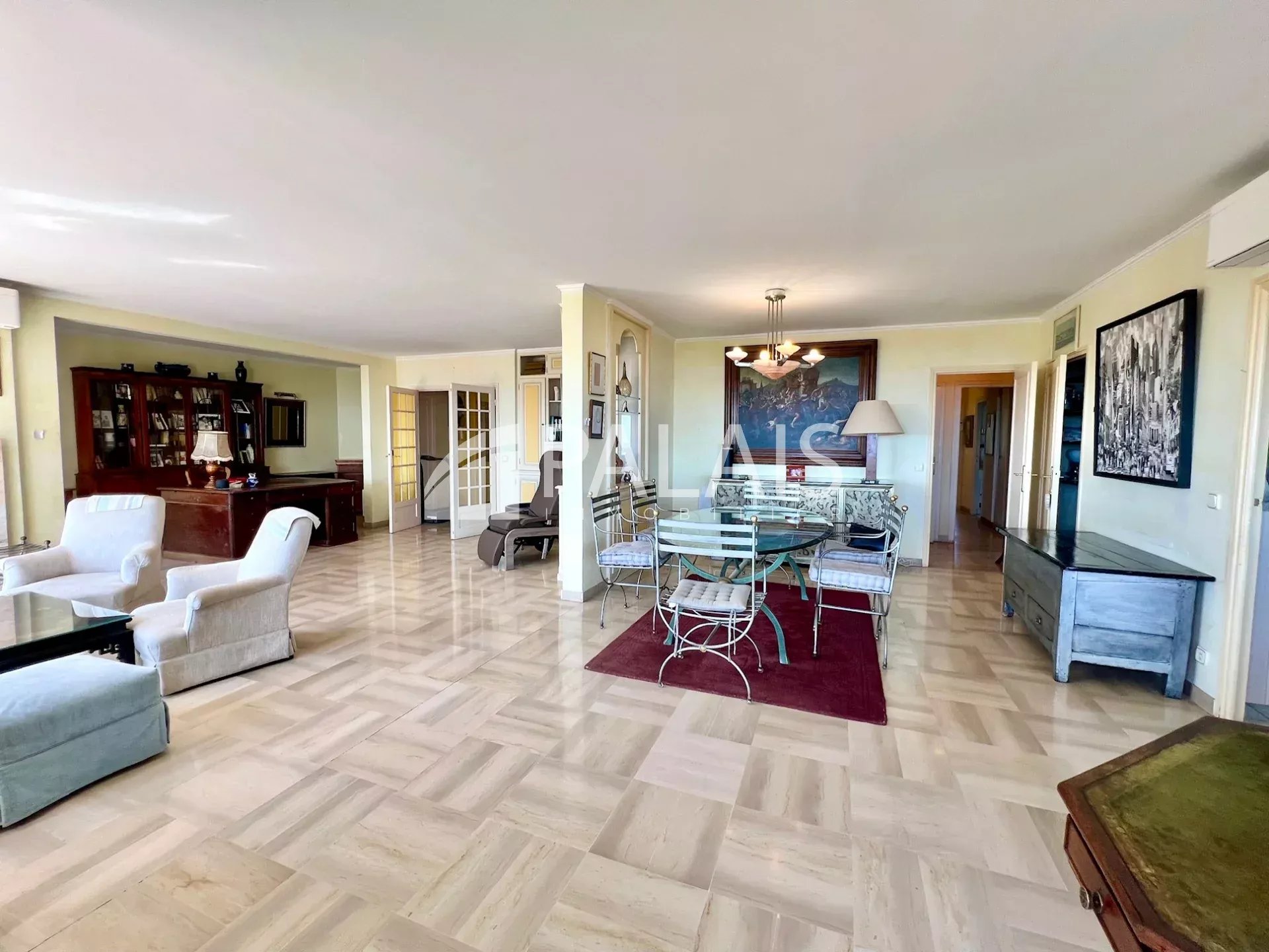 Situé au sein d’une élégante copropriété de standing, au calme absolu, dans un environnement verdoyant avec piscine et tennis, ce magnifique appartement au dernier étage offre un cadre de vie privilégié. Traversant, climatisé et très lumineux, il se compose d’une cuisine, de quatre chambres, d’une salle de bains, de deux salles d’eau et de deux toilettes indépendantes. Vous serez séduit par son vaste séjour double de 61 m² qui s’ouvre sur deux agréables terrasses, offrant une vue panoramique imprenable sur la Méditerranée. Ce bien rare est complété par deux caves, un garage fermé. Des travaux de rafraîchissement sont à prévoir, laissant entrevoir un beau potentiel de valorisation.