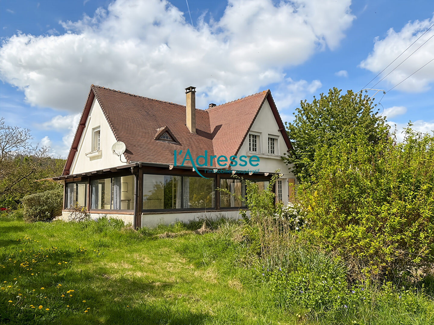 Jolie construction traditionnelle élevée sur un terrain de 1 386m² comprenant au rez de chaussée un séjour avec cheminée ouvrant sur une belle véranda de 30m². Cuisine indépendante aménagée équipée. Deux chambres et une salle de bains (douche). A l'étage : Palier desservant trois chambres dont deux de belle taille et un wc. En rez de jardin : Buanderie, cellier et garage. Chauffage mixte ( gaz citerne chaudière frisquet et pompe à chaleur réversible) Village avec écoles sur place.