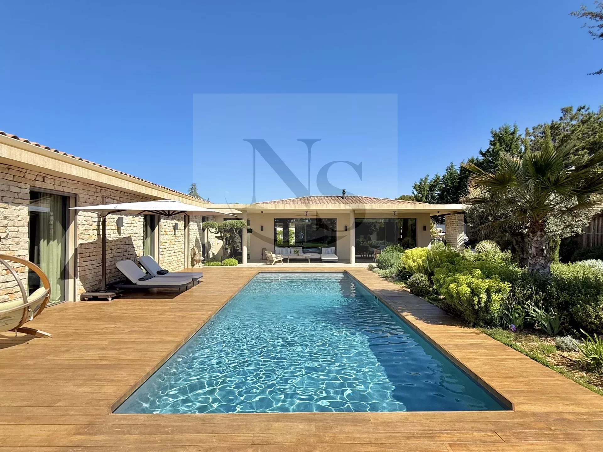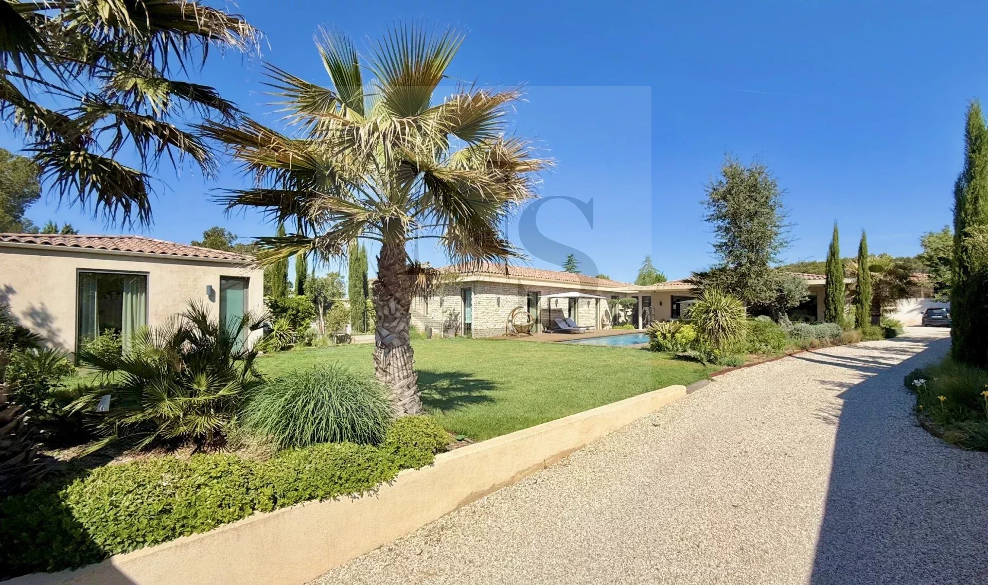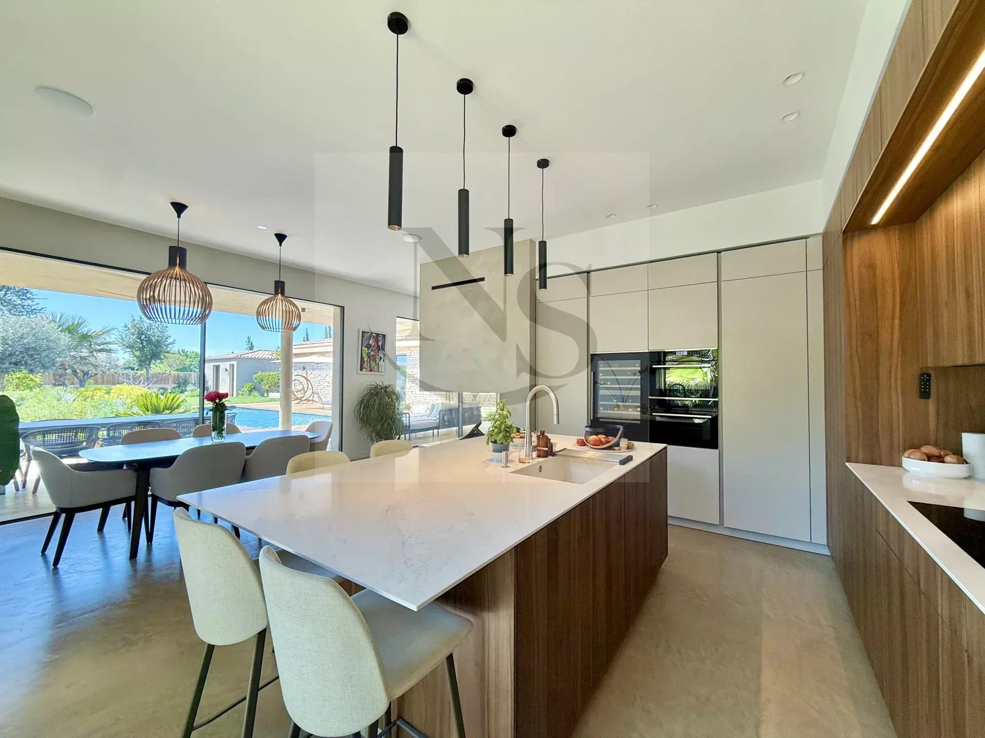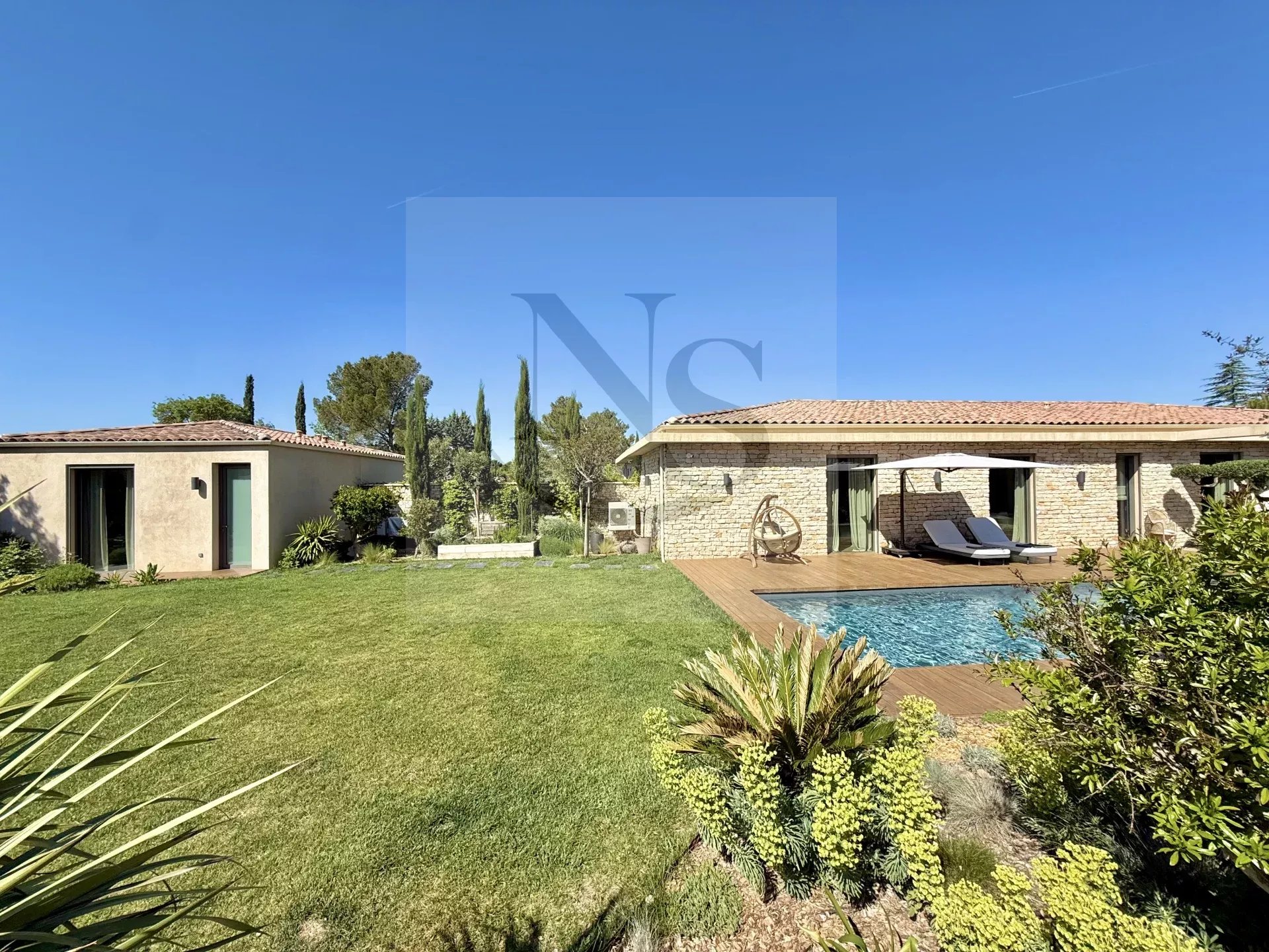 Le groupe NICOLAS STAES vous présente à la vente à 5 minutes d’Aix-en-Provence proche du village d’Éguilles, nichée dans un environnement privilégié, cette villa contemporaine de plain-pied développe 225 m² habitables au cœur d’un écrin paysager de 1 500 m², sublimé par une élégante inspiration méditerranéenne aux accents exotiques. Pensée comme un véritable lieu de vie ouvert sur l’extérieur, la propriété séduit par ses volumes généreux et sa luminosité remarquable. Le vaste espace de réception, baigné de lumière naturelle, s’articule autour d’un large salon et d’une cuisine américaine ultra équipée, prolongés par de spacieuses terrasses invitant à une vie dedans-dehors en toute fluidité. L’espace nuit se compose de quatre suites raffinées, chacune offrant confort et intimité, tandis qu’un pavillon d’invités indépendant vient compléter cet ensemble rare, idéal pour recevoir en toute discrétion. Facile à vivre au quotidien, la villa bénéficie des dernières normes de construction, alliant performance énergétique, confort moderne et prestations de haute qualité. Un garage ainsi que plusieurs places de parking viennent compléter ce bien. Proche de toutes commodités ainsi que des bus de ville et de l’école d’IBS. Une propriété où design contemporain et douceur de vivre s’unissent parfaitement.