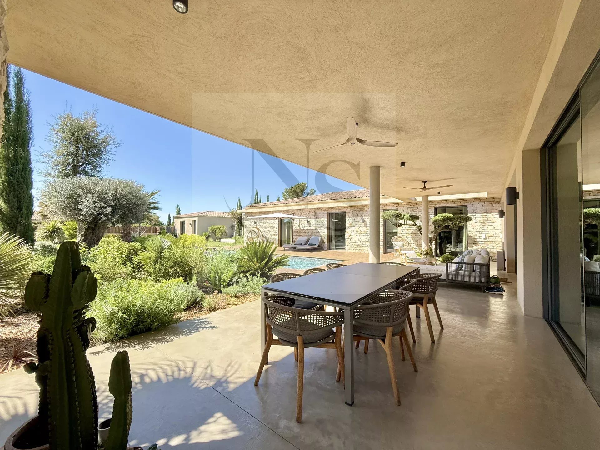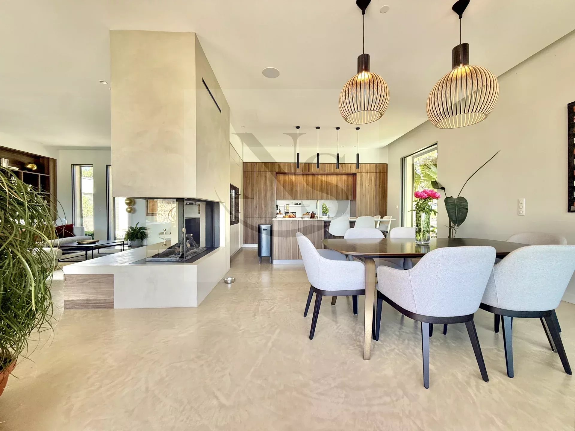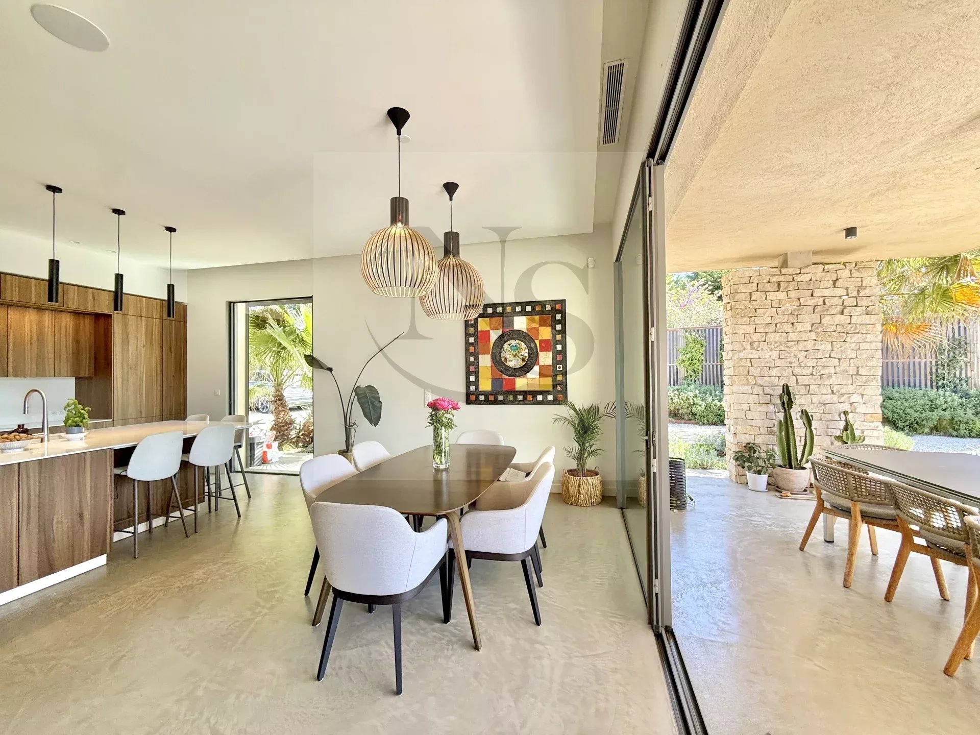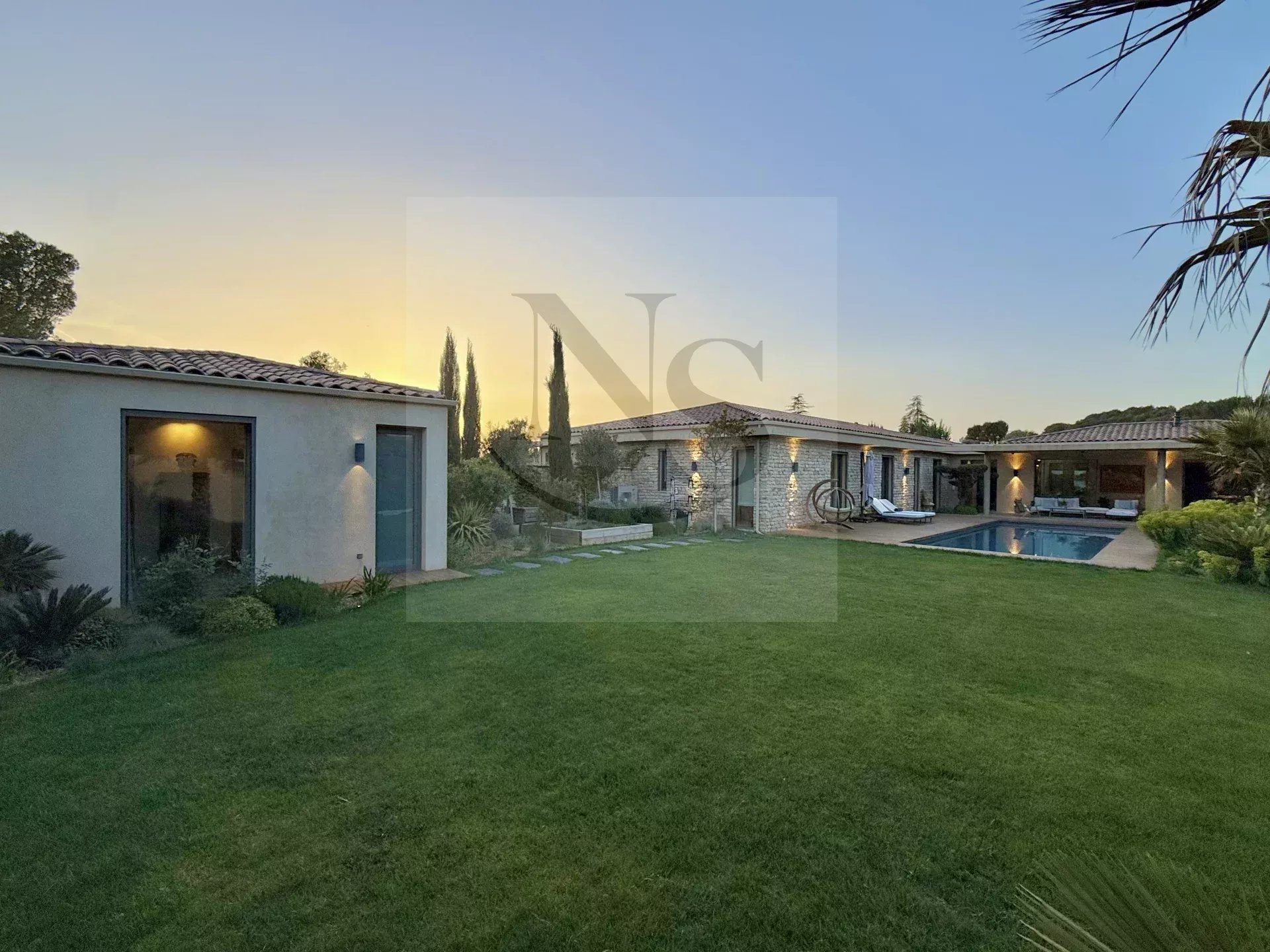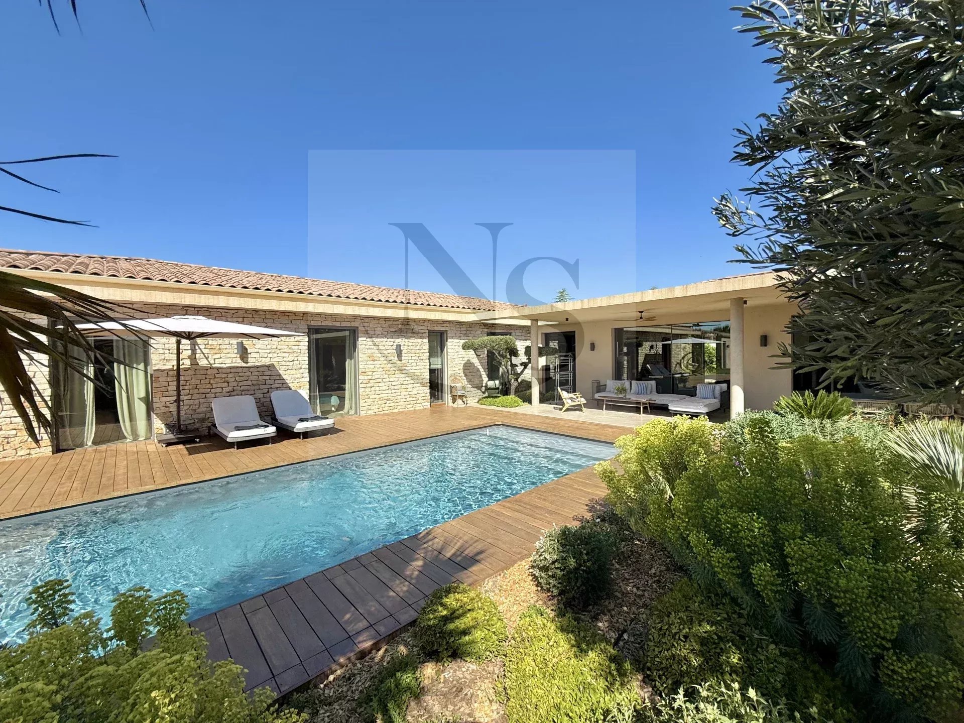 Le groupe NICOLAS STAES vous présente à la vente à 5 minutes d’Aix-en-Provence proche du village d’Éguilles, nichée dans un environnement privilégié, cette villa contemporaine de plain-pied développe 225 m² habitables au cœur d’un écrin paysager de 1 500 m², sublimé par une élégante inspiration méditerranéenne aux accents exotiques. Pensée comme un véritable lieu de vie ouvert sur l’extérieur, la propriété séduit par ses volumes généreux et sa luminosité remarquable. Le vaste espace de réception, baigné de lumière naturelle, s’articule autour d’un large salon et d’une cuisine américaine ultra équipée, prolongés par de spacieuses terrasses invitant à une vie dedans-dehors en toute fluidité. L’espace nuit se compose de quatre suites raffinées, chacune offrant confort et intimité, tandis qu’un pavillon d’invités indépendant vient compléter cet ensemble rare, idéal pour recevoir en toute discrétion. Facile à vivre au quotidien, la villa bénéficie des dernières normes de construction, alliant performance énergétique, confort moderne et prestations de haute qualité. Un garage ainsi que plusieurs places de parking viennent compléter ce bien. Proche de toutes commodités ainsi que des bus de ville et de l’école d’IBS. Une propriété où design contemporain et douceur de vivre s’unissent parfaitement.