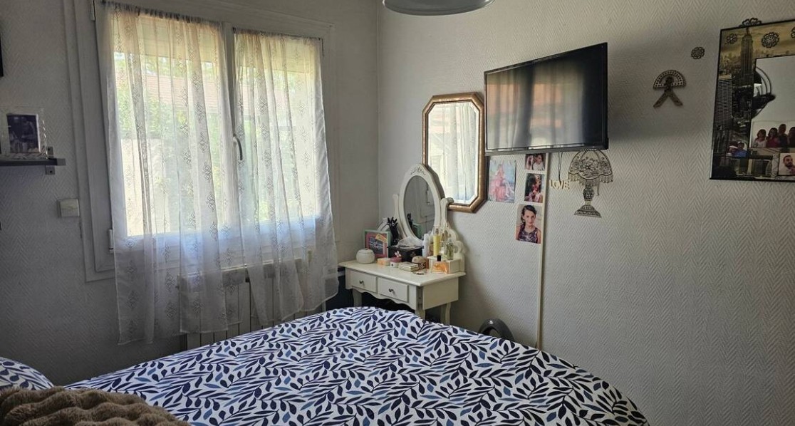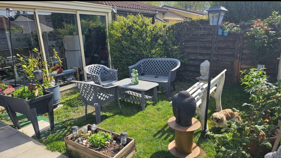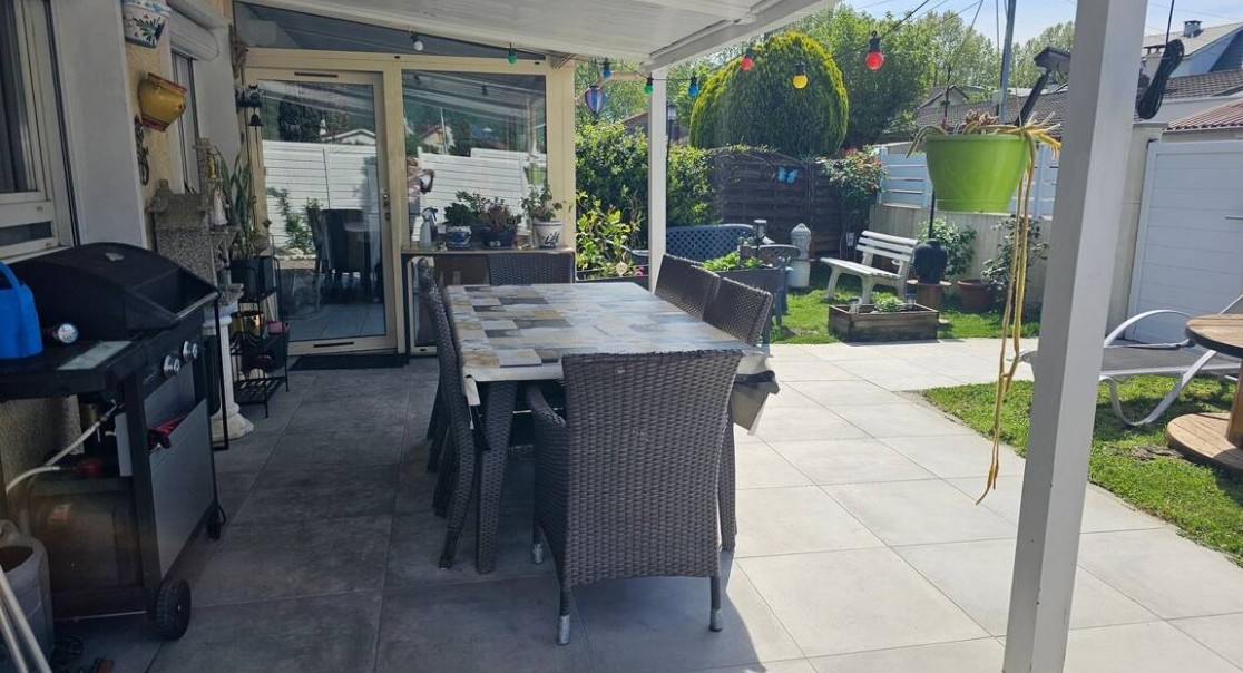 vends maison plain pied 96m2 3/4 chambres véranda fermée terrasse abritée devant et derriére maison 2 jardins, aucun frais de copropriété proche de toutes commodités une chambre avec baie vitrée donnant sur terrain grande piéce a vivre lumineuse