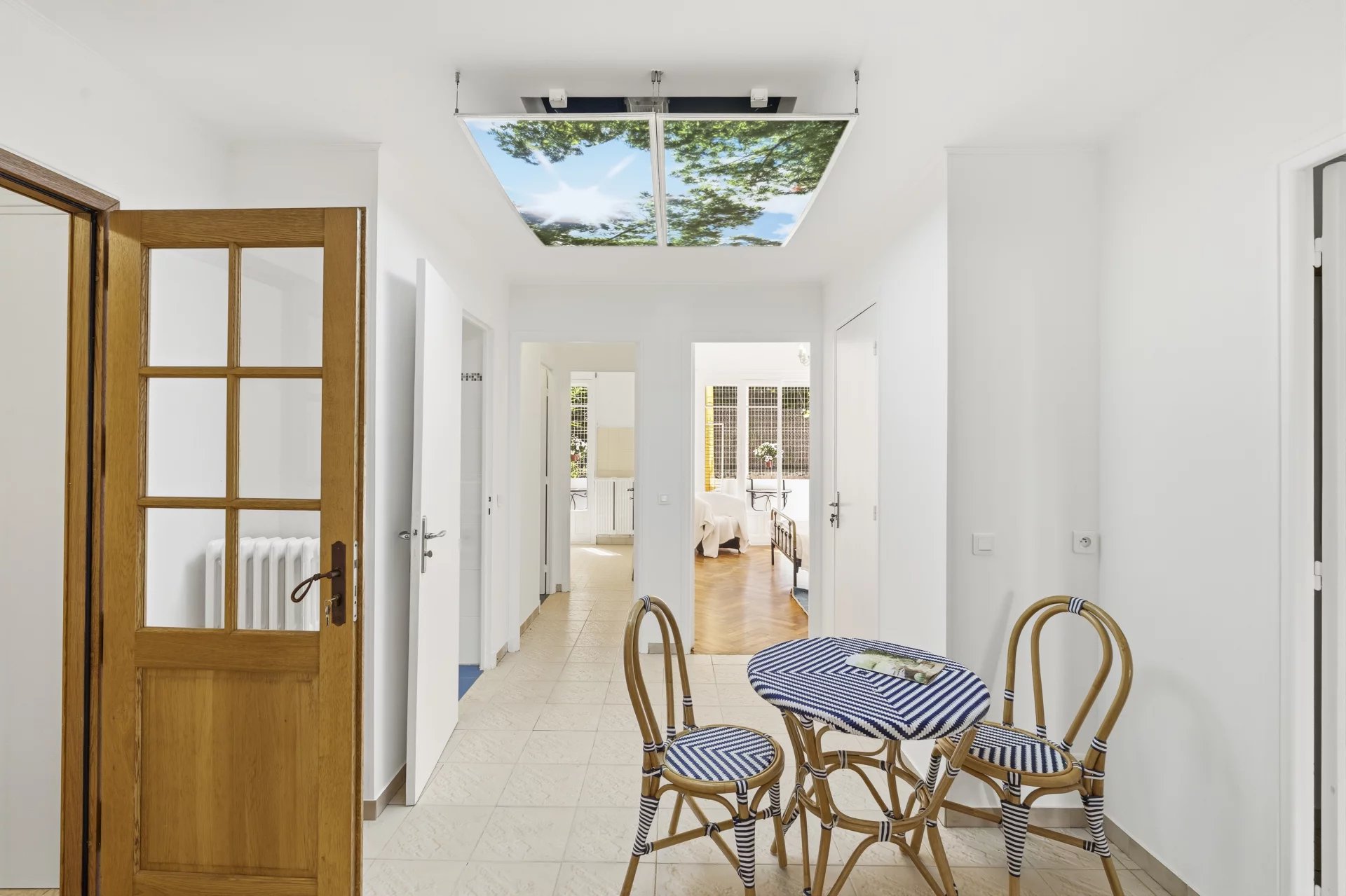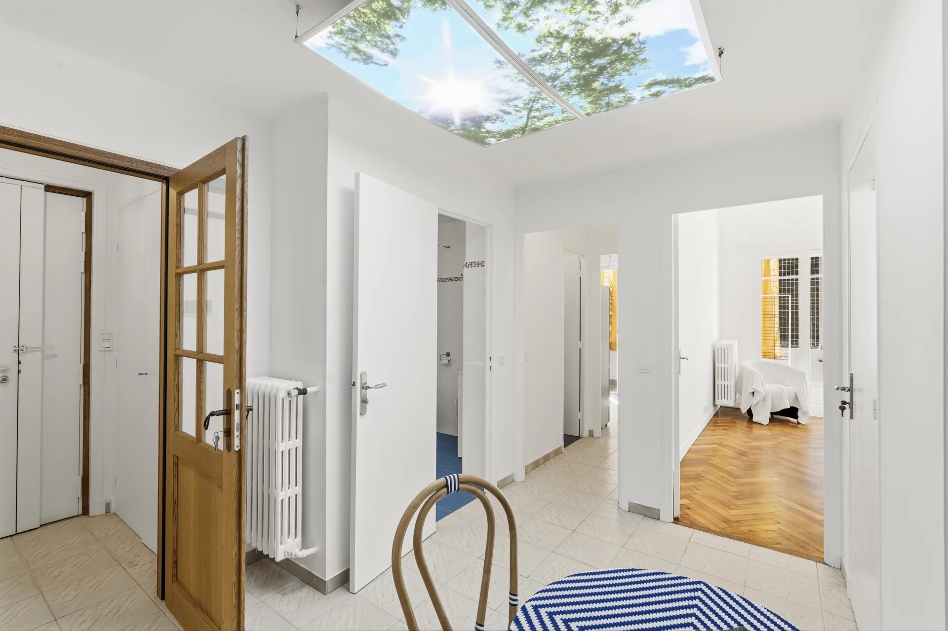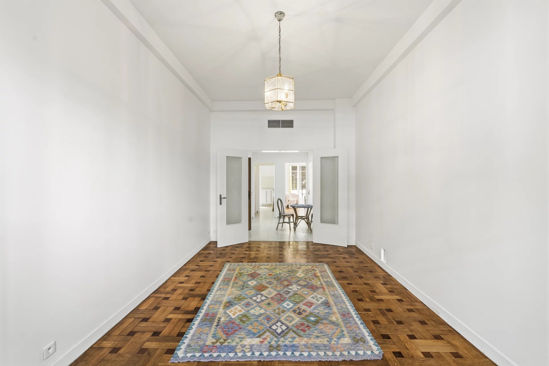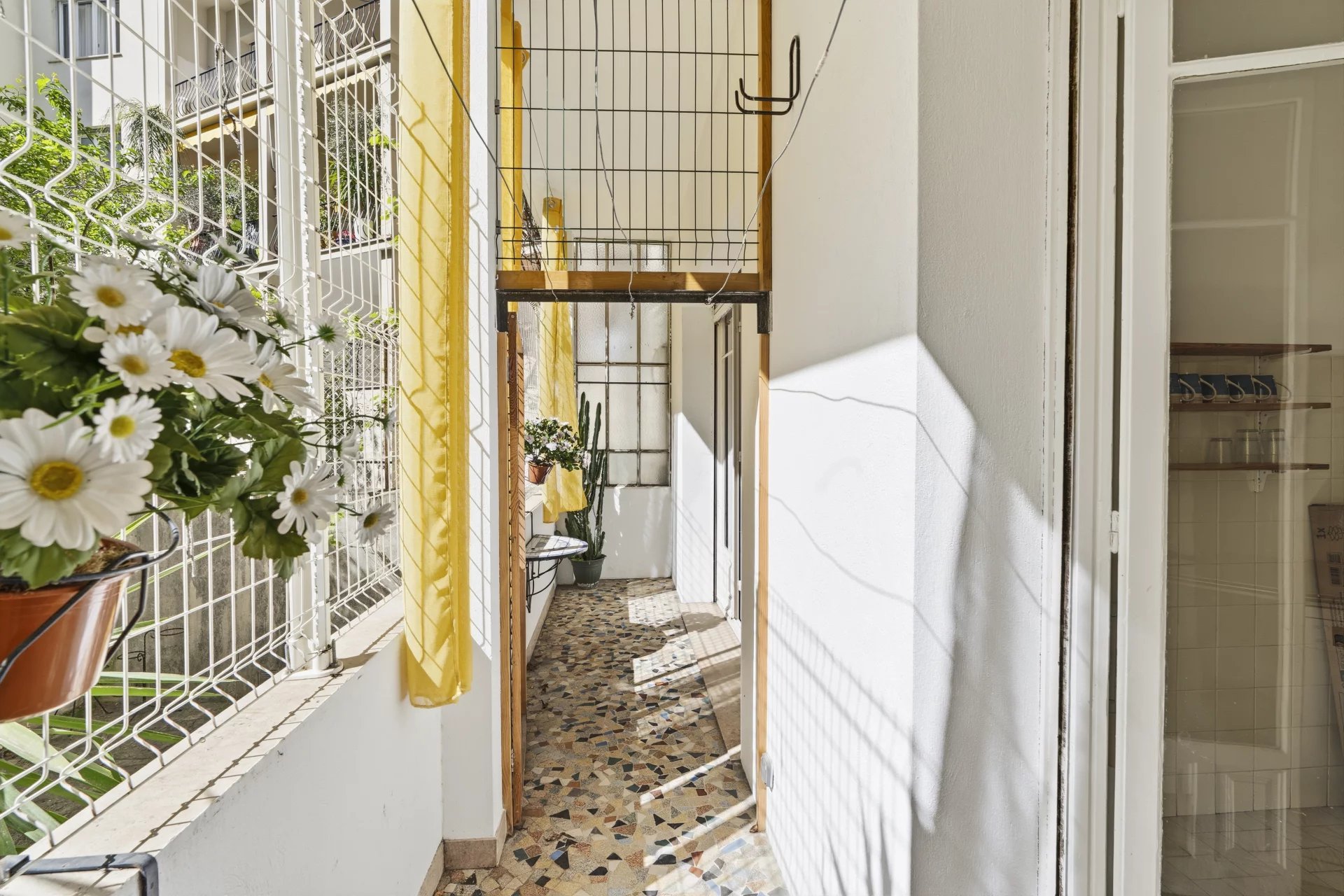 Rue de France, à deux minutes à pied de la Promenade des Anglais, dans un immeuble gardienné et sécurisé situé au cœur du quartier des Baumettes, classé espace protégé UNESCO. Ce 3 pièces de 88 m² traversant séduit d'emblée par ses volumes et sa hauteur sous plafond de 3,20 m ,un gabarit qu'on ne trouve plus dans les constructions récentes. Le parquet massif d'époque ajoute ce cachet particulier qui fait toute la différence entre un appartement et un appartement qu'on n'oublie pas. L'entrée avec sas distribue un séjour lumineux d'environ 20 m², agréable à vivre au quotidien, et une cuisine indépendante fonctionnelle. La partie nuit se compose de deux belles chambres : 20 m² pour la principale, 15 m² pour la seconde ,cette dernière donnant directement sur la terrasse. Dressings, placards et rangements sont nombreux, ce qui change vraiment la vie au quotidien. La terrasse de 9 m², arborée et calme, est orientée côté cour. Pas de bruit , un vrai espace extérieur pour profiter du climat niçois sans compromis. Cave de 4 m² incluse. Stationnement possible à proximité en location. Charges annuelles de 1 600 €, aucune procédure en cours. La mer, le tramway, les commerces et les écoles sont accessibles à pied. C'est précisément ce qu'on cherche quand on choisit Nice.