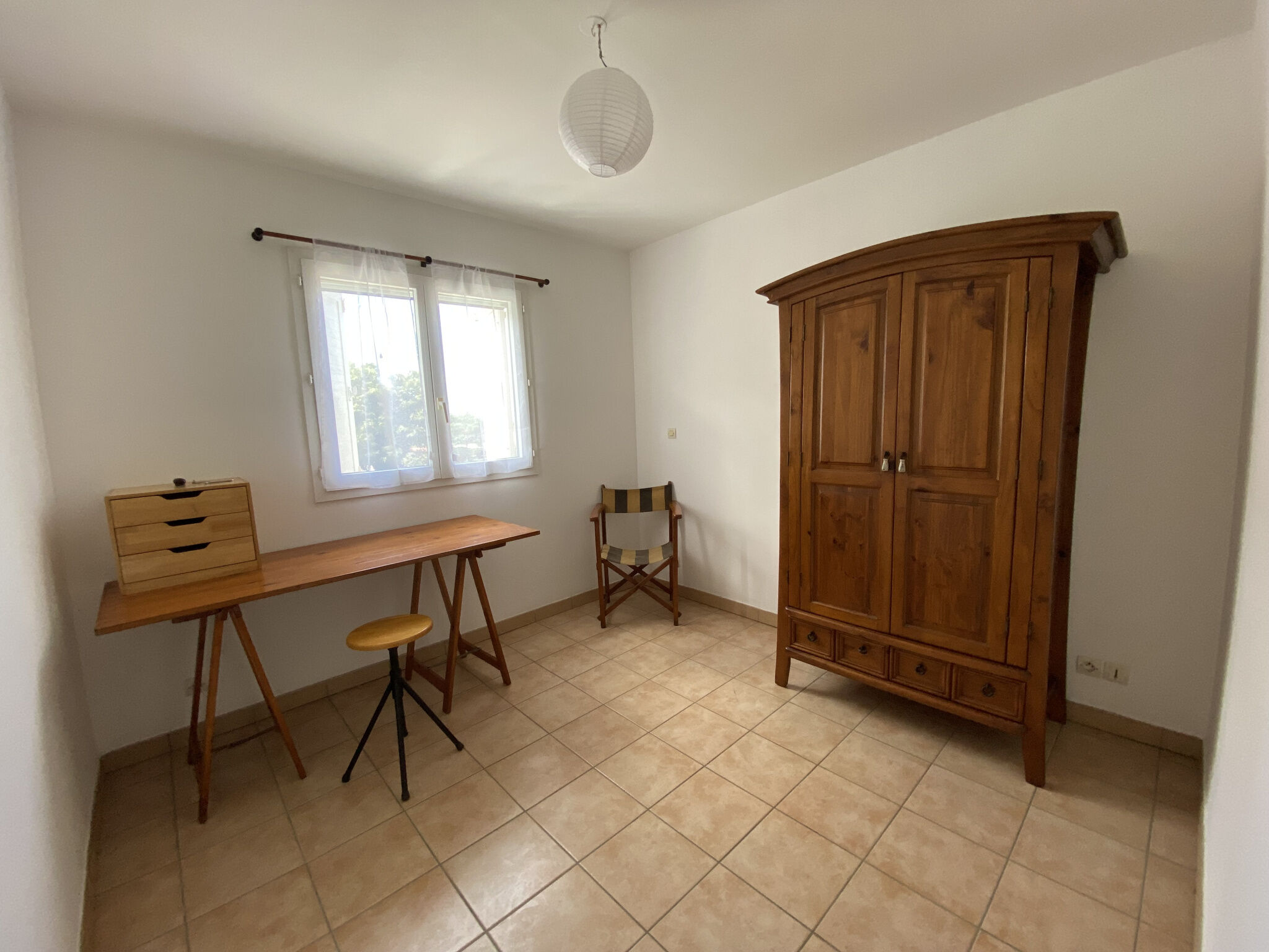 2 chambres dont une avec un lit et une deuxième avec un bureau et une armoire.