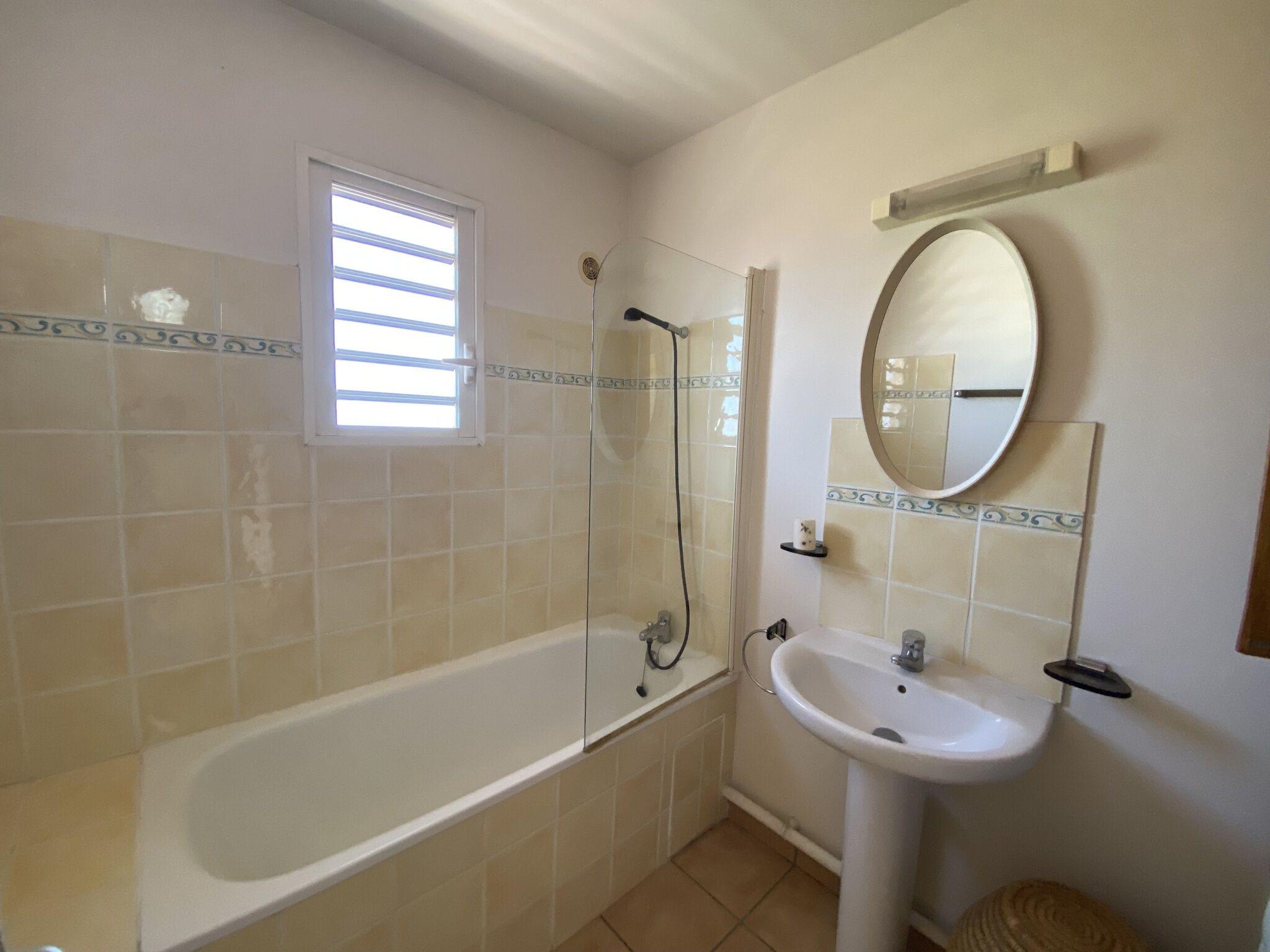 un salon, une terrasse, cuisine équipée et une salle de bain avec baignoire et WC séparé,