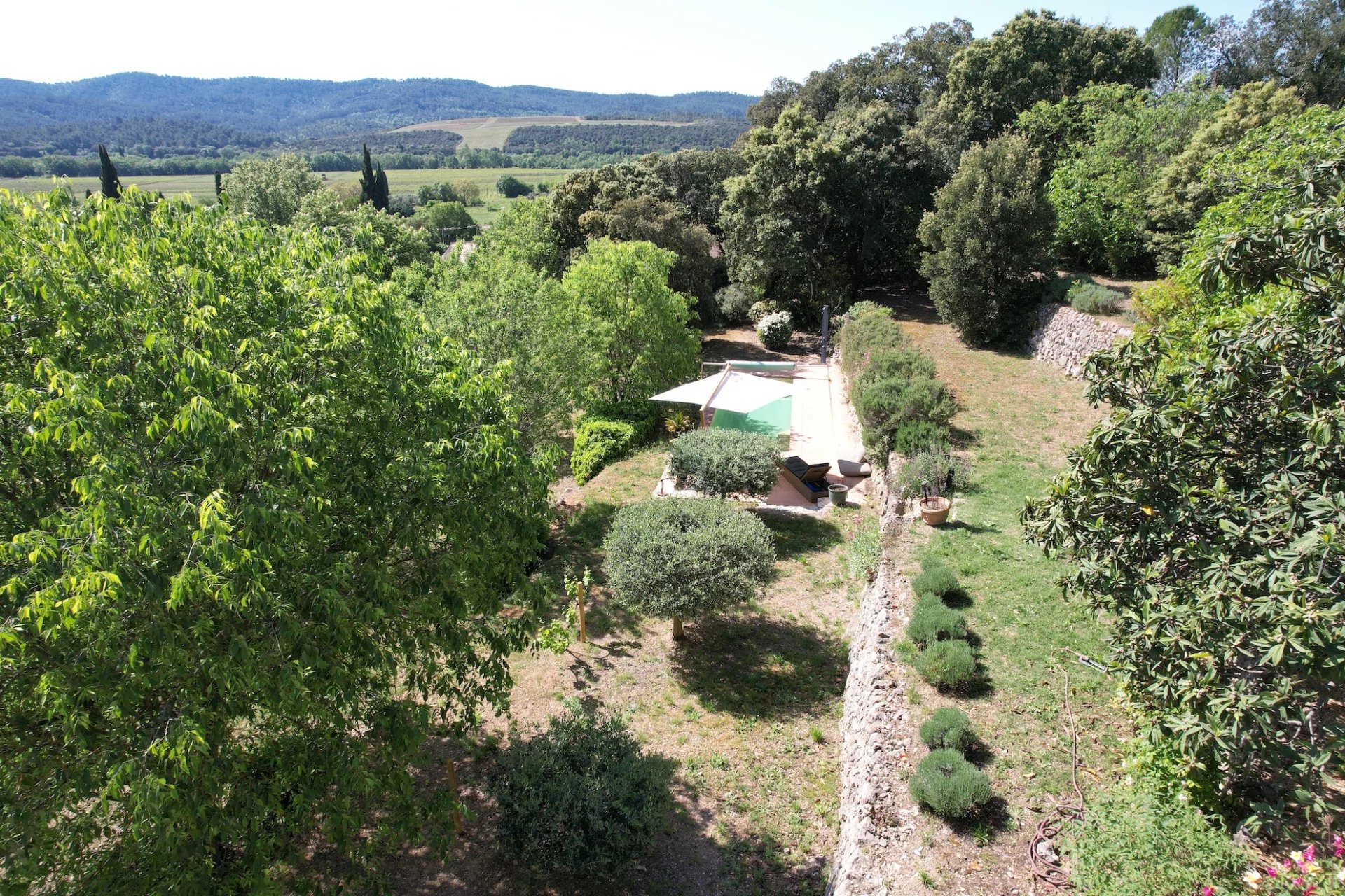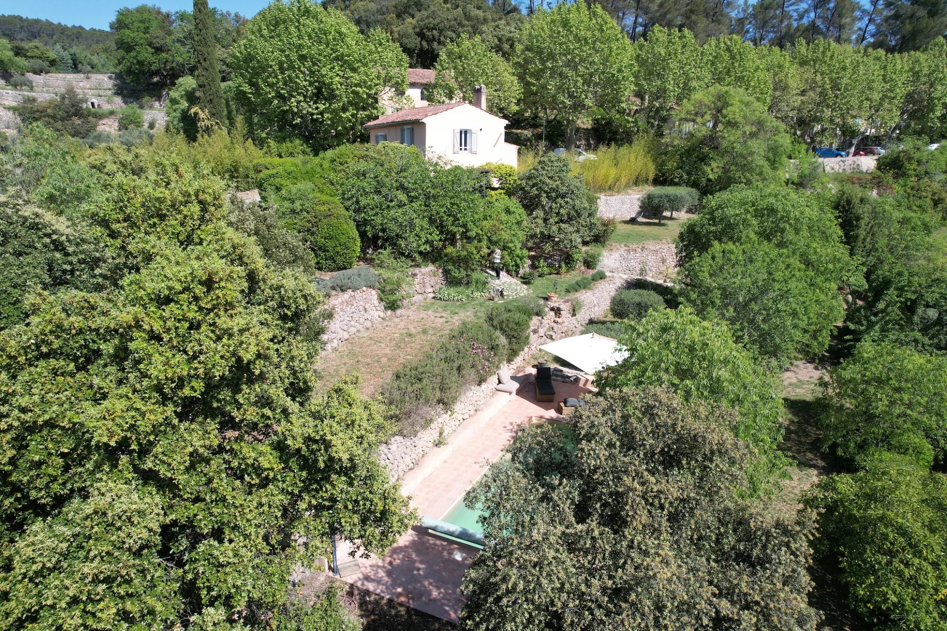 C'est dans un écrin de verdure clos de 2270m2, avec une vue époustouflante, proche du chateau, au calme et à l'abri des regards que se dévoile cette maison de charme récemment rénovée avec des matériaux authentiques. La maison est composée, au rez-de-chaussée, d'une entrée, d'une cuisine neuve et d'un salon avec sa cheminée, ouvert sur une petite terrasse suspendue offrant une vue sur le jardin et les collines. A l'étage, une chambre face au sud avec un petit dressing et une climatisation, un wc indépendant et une salle d'eau aux nombreux espaces de rangement. En descendant vers le jardin, par quelques marches, se trouvent, en rez-de-jardin, une chambre indépendante avec sa salle de bains et son wc indépendant. Un garage. De nombreuses terrasses cachées ou exposées au soleil ainsi qu'une végétation méditerannéenne mature et variée font de ce jardin buccolique un lieu de repos et de bien vivre dans le sud. C'est sur la troisième restanque, en contre-bas de la maison, qu'est posée la piscine chauffée, Diffazur de 8x4. C'est dans cette propriété atypique et rare sur le marché que vous vivrez en résidence principale ou secondaire. Les informations sur les risques auxquels ce bien est exposé sont disponibles sur le site Géorisques : georisques.gouv.fr