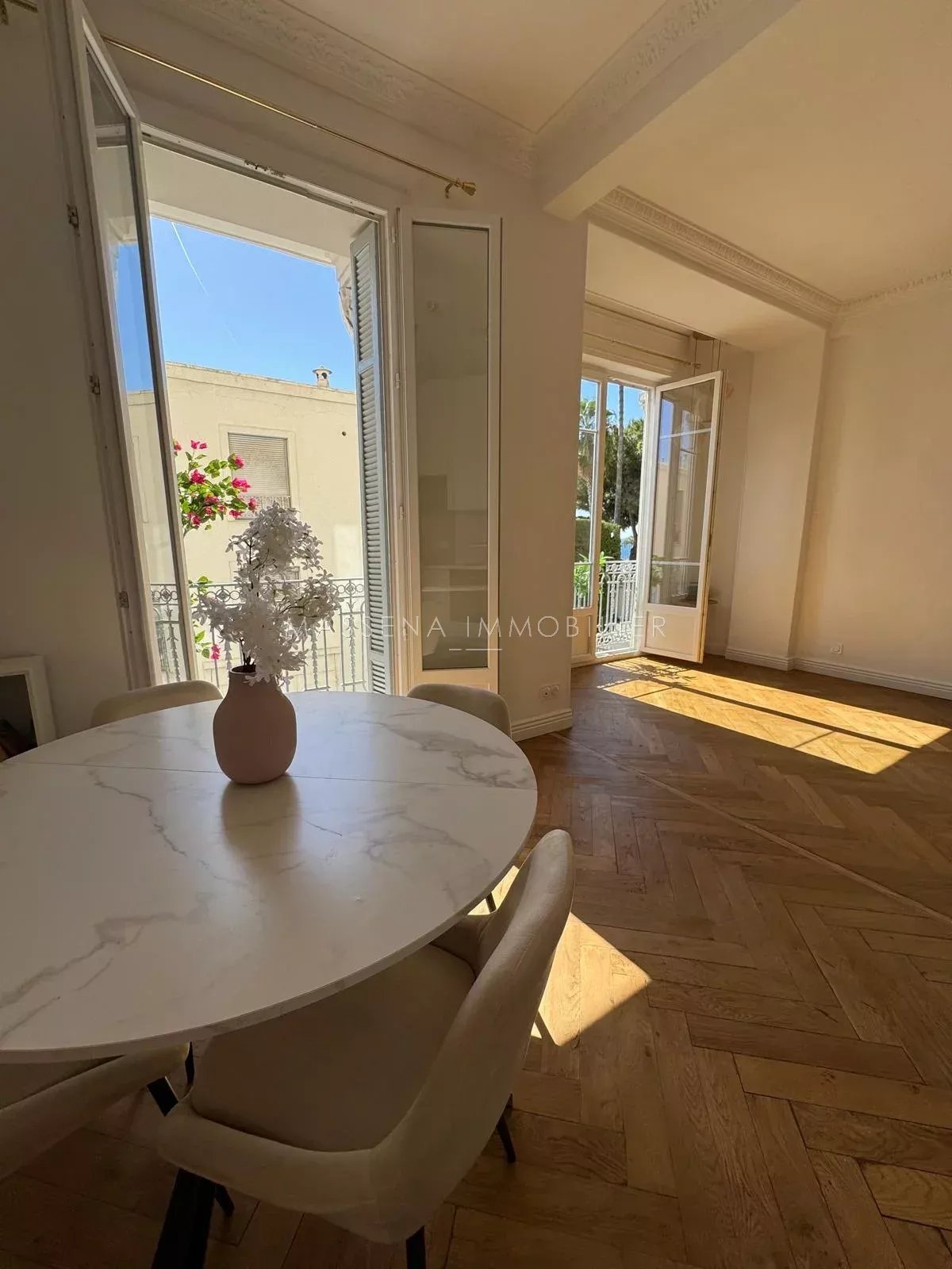 Nice - Promenade des Anglais. Situé sur la prestigieuse Promenade des Anglais au 1er étage d'un immeuble Bourgeois sécurisé avec ascenseur, magnifique 3 pièces rénové et meublé avec goût et prestations. Il se compose d'un couloir desservant un grand salon, salle à manger/cuisine plein sud, lumineux avec aperçu mer, deux belles chambres, une salle de douche et un toilettes indépendant. Une cave en sou-sol complète ce bien. Cet appartement bénéficie d'un emplacement très recherché face à la mer. Climatisation, double-vitrage, hauteur sous plafond, moulures, parquet et carrelage de qualité. Proche de toutes commodités. La location saisonnière est autorisée.