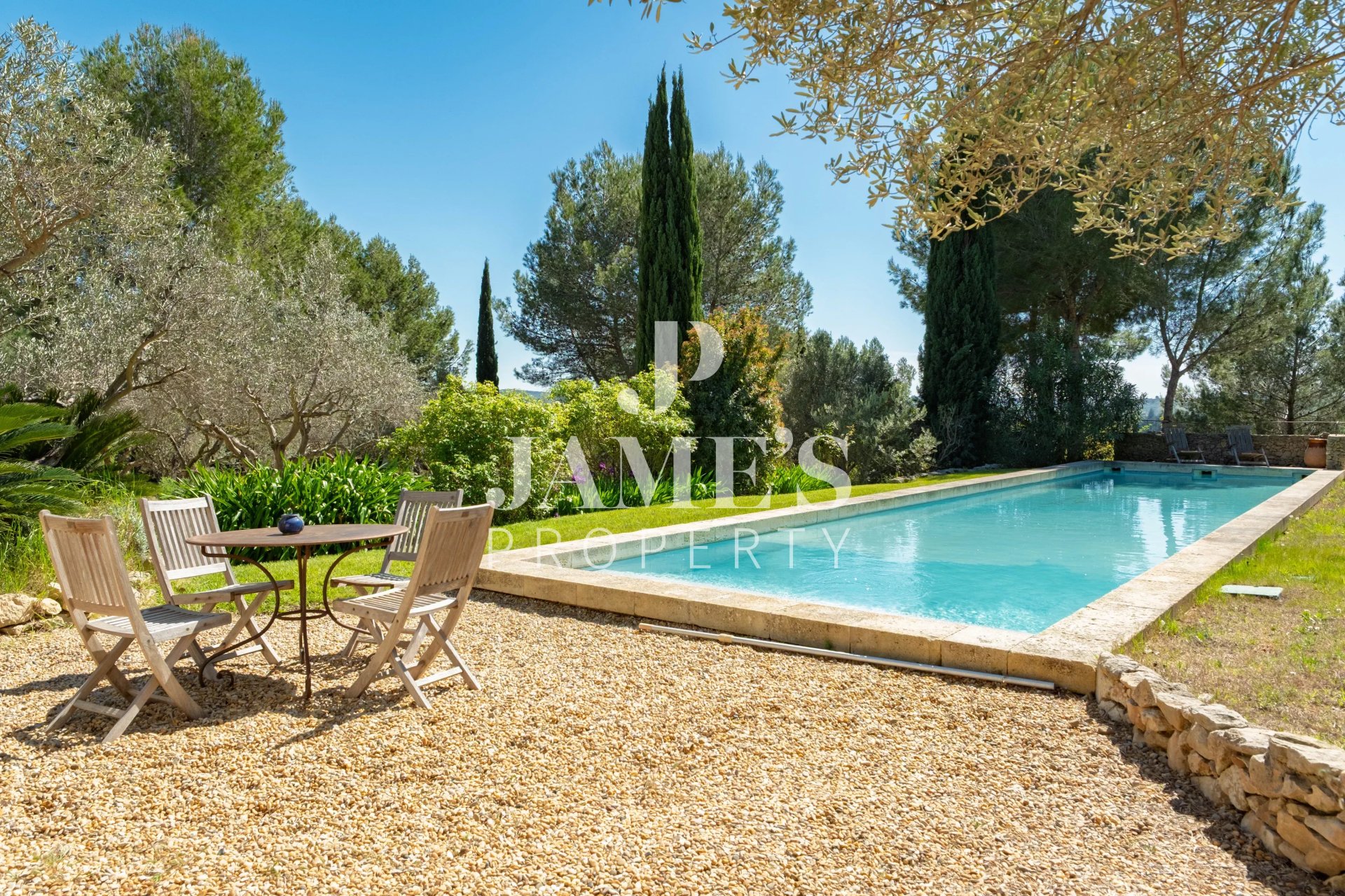 Implantée sur un terrain de plus d'un hectare, la propriété se déploie harmonieusement entre un jardin paysagé soigné et un champ d'oliviers, créant une atmosphère authentiquement provençale. Elle bénéficie d'une magnifique vue dégagée sur la campagne environnante, sans vis-à-vis.